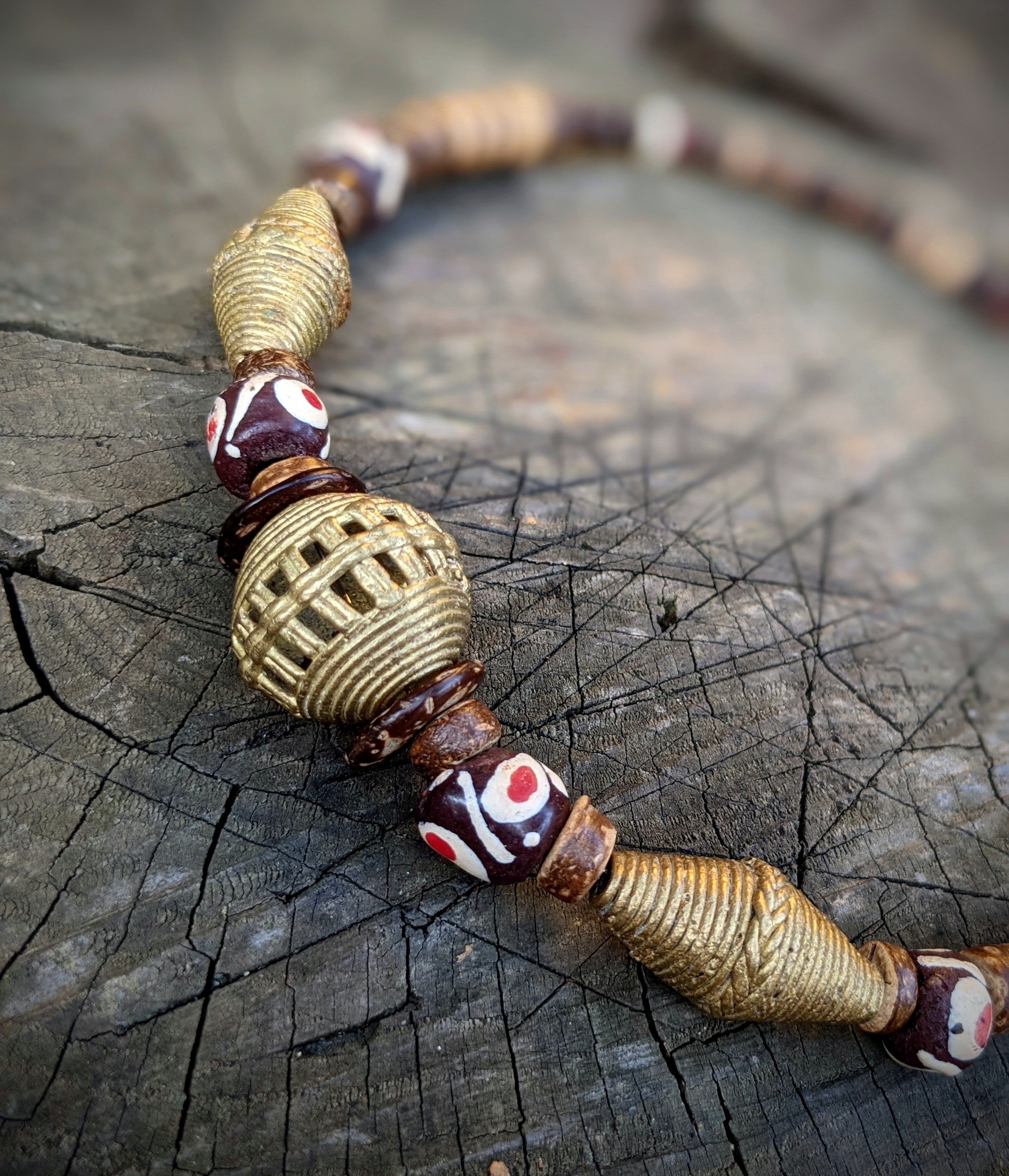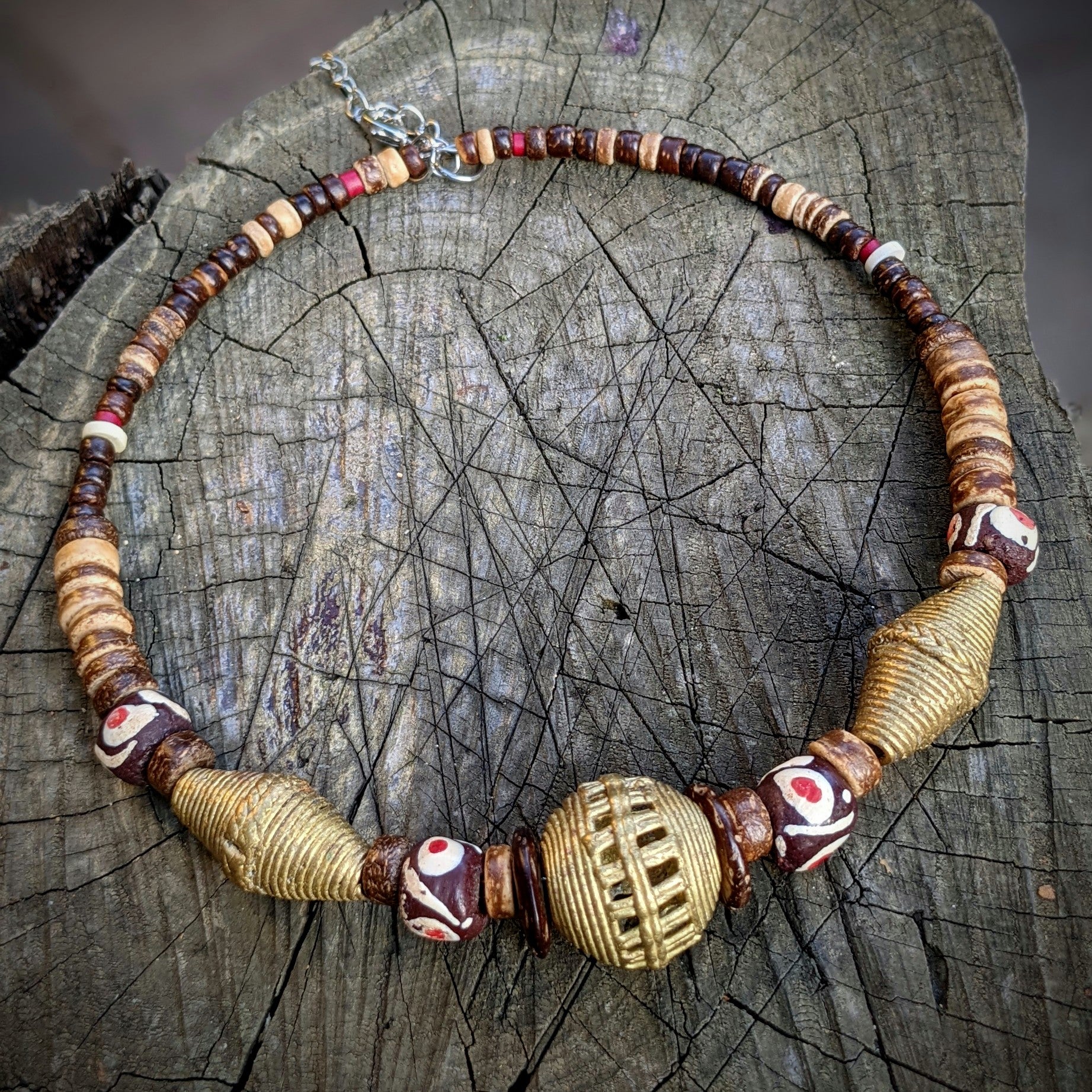 Náhrdelník je vytvořen z originálních afrických "krobo" korálků z recyklovaného skla a mosazných afrických korálků, které se tradičně vyrábí v Ghaně. Ty jsou doplněny kokosovými a keramickými korálkami. Navlečeno na obruči, která je určena pro obvod krku 33-38 cm - lze regulovat karabinou a řetízkem. Řetízek a karabinka je z bižuterního kovu.