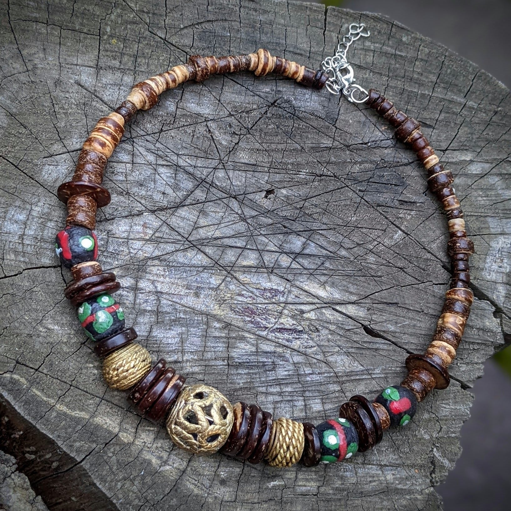 Náhrdelník je vytvořen z originálních afrických mosazných a skleněných "krobo" korálků, které se tradičně vyrábí v Ghaně, které jsou doplněny dřevěnými, kovovými a kokosovými korálkami. Navlečeno na obruči průměru 12 cm, která je určena pro obvod krku 30-35 cm - lze regulovat karabinou a řetízkem. Řetízek a karabinka je z chirurgické oceli.