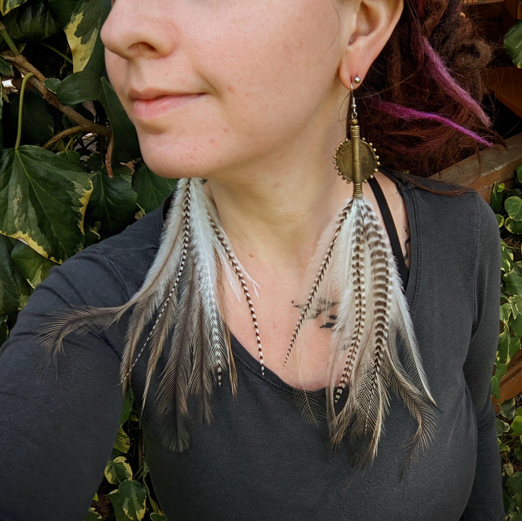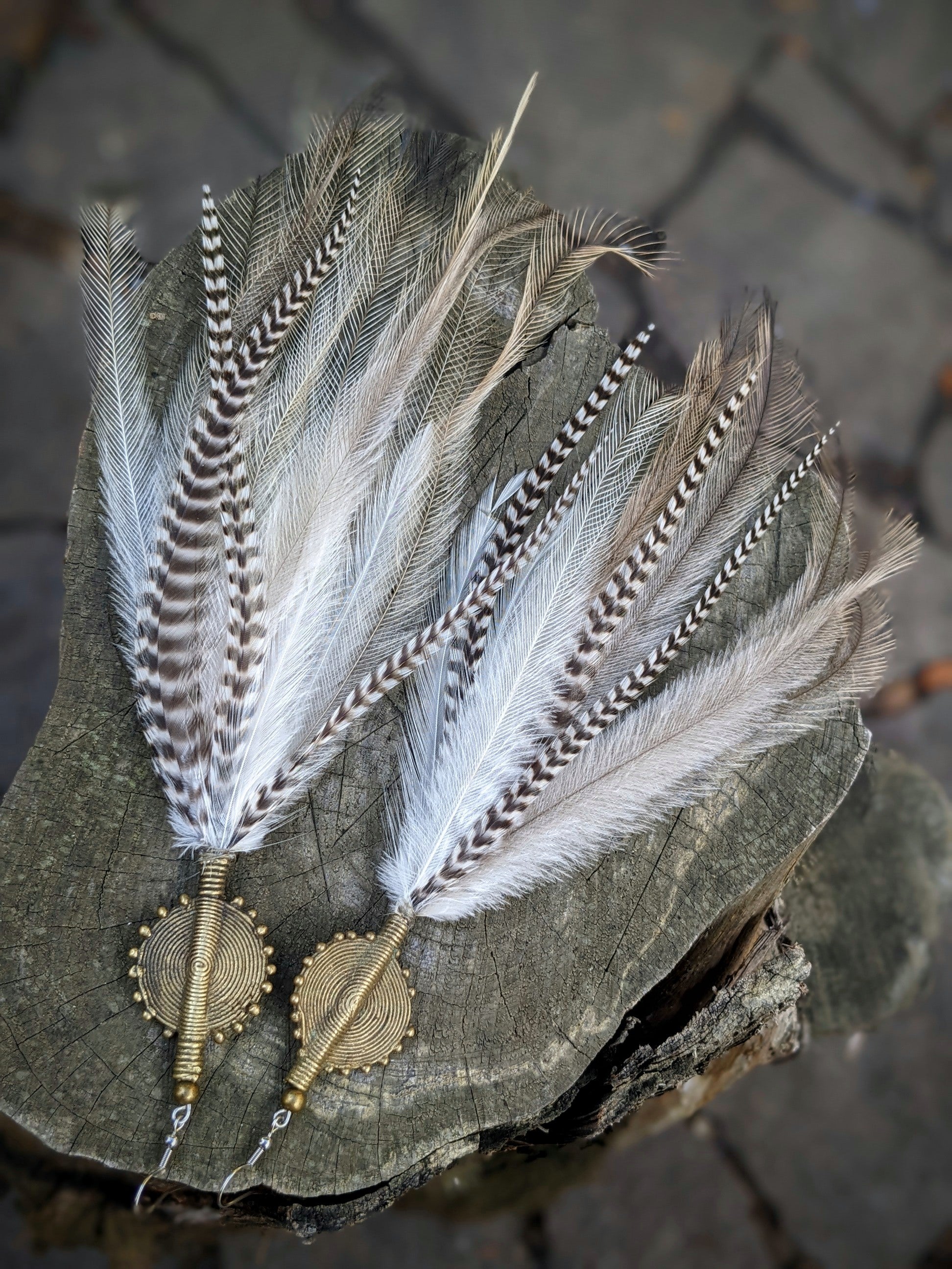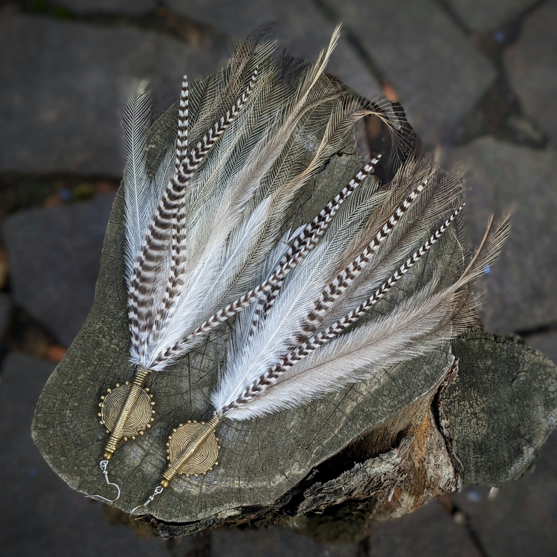Výrazné peříčkové náušnice (emu, kohout grizzly) s nádhernými mosaznými korálky ručně vyráběnými v Ghaně (náušnice jsou tedy trochu těžší). Háčky jsou z chirurgické oceli, dodávám se silikonovými zarážkami. Délka ozdobné části náušnic je cca 30 cm.