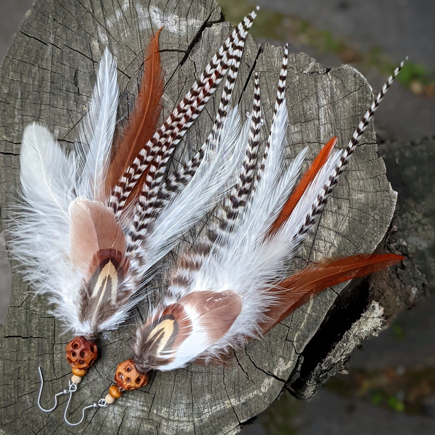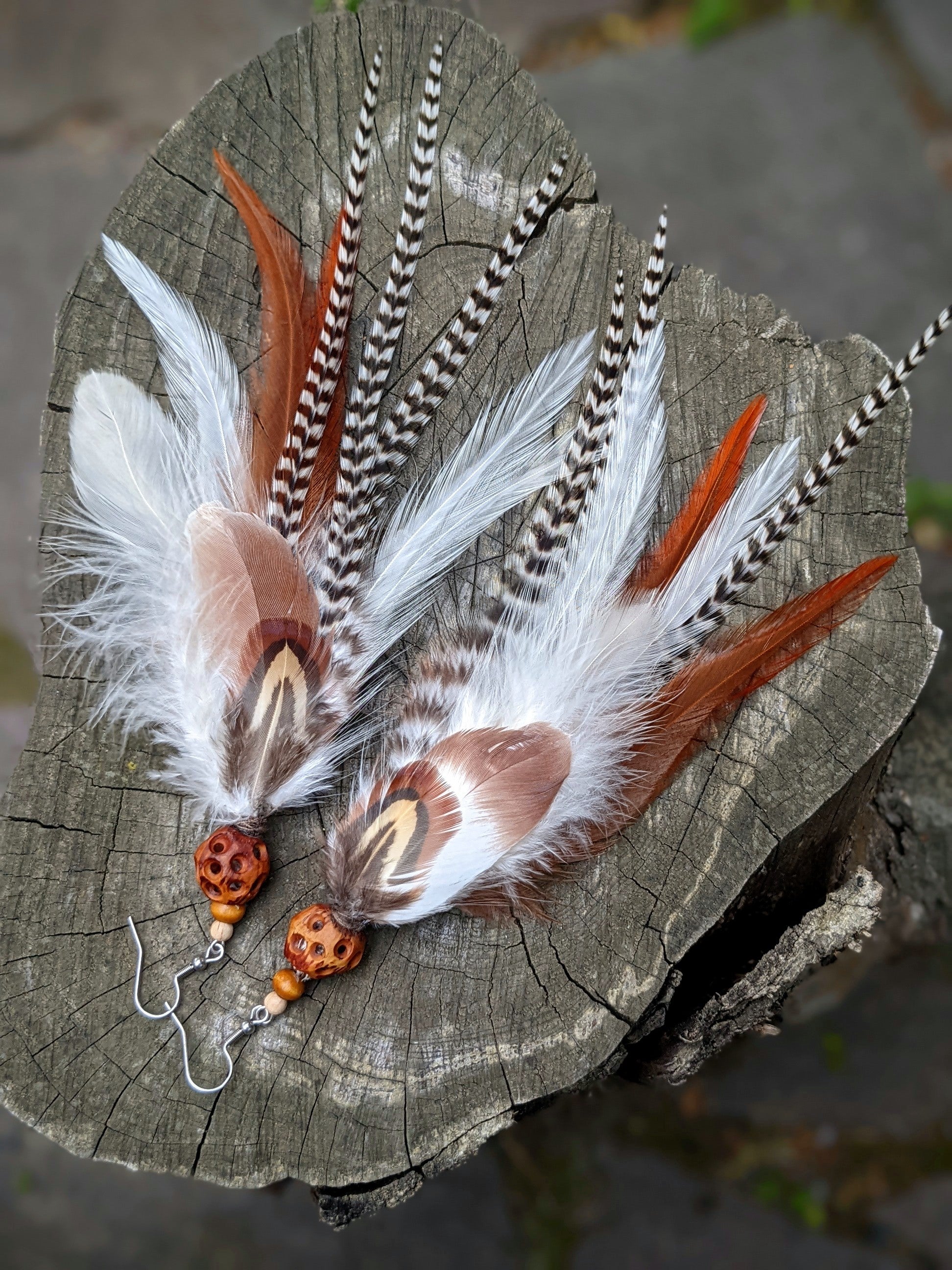 Výrazné peříčkové náušnice (bažant, holub, kohout...) doplněné korálkami z lísky a dřevěnými korálkami. Háčky jsou z chirurgické oceli, dodávám se silikonovými zarážkami. Délka ozdobné části náušnic je až 20 cm.