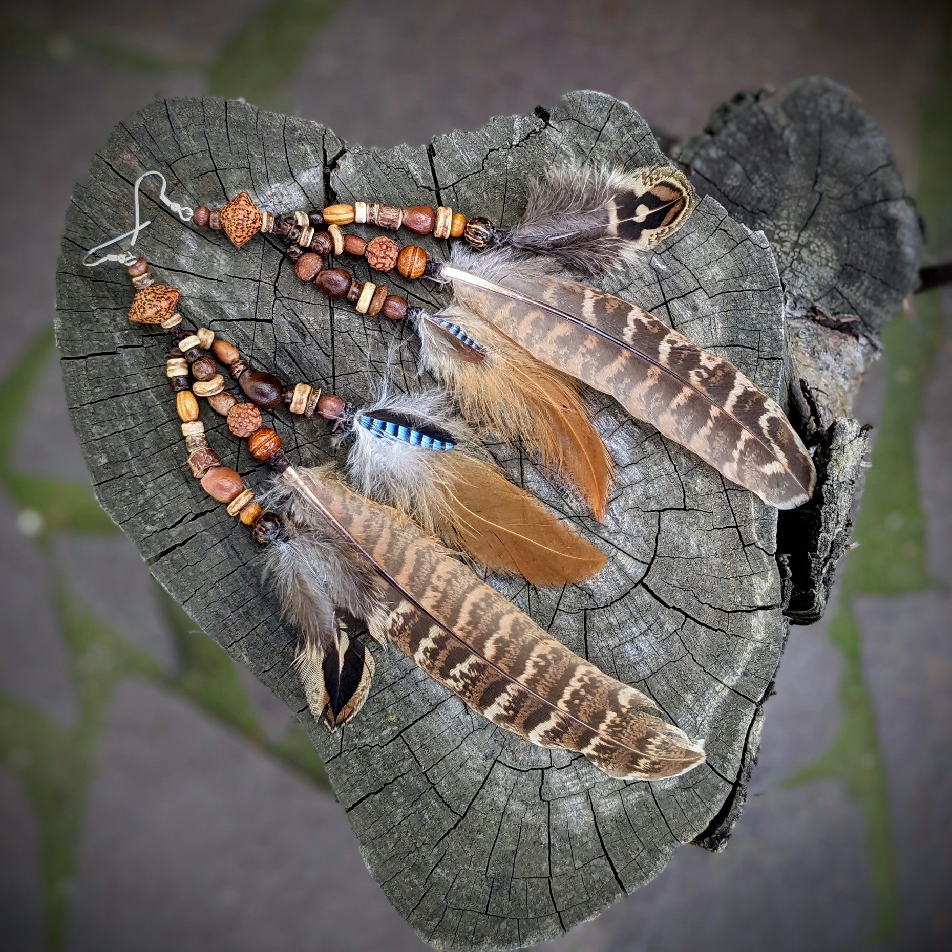 Peříčkové náušnice (kohout, sojka, bažant...) inspirované lesem - doplněné korálkami z klokočí,rudrakši, kokosu, hálek a dřevěnými korálkami. Háčky jsou z chirurgické oceli, dodávám se silikonovými zarážkami. Délka ozdobné části náušnic je cca 20 cm.
