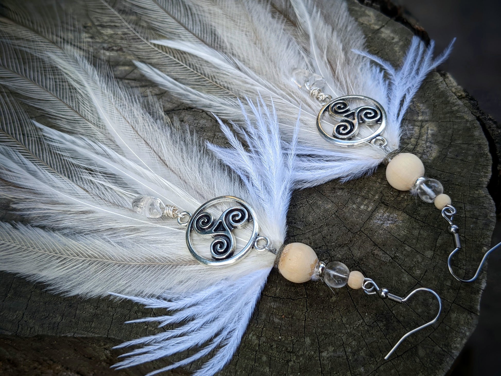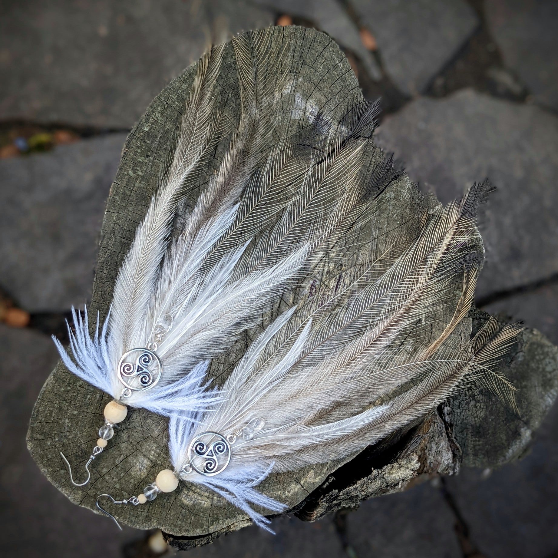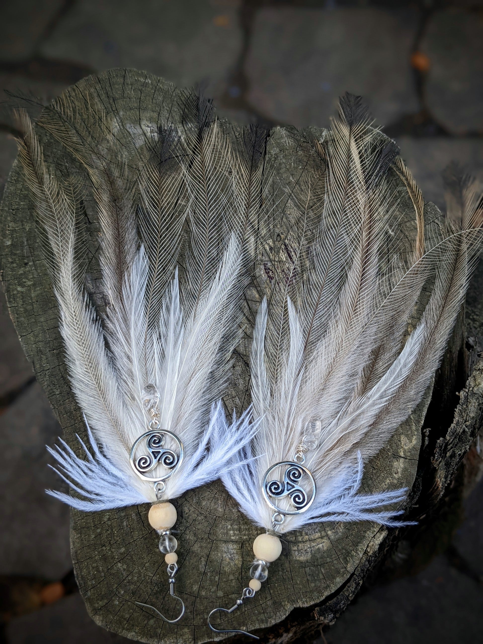 Výrazné peříčkové náušnice (emu, pštros, kohout...) s triskelem doplněné korálkami ze dřeva a křišťálu. Háčky jsou z chirurgické oceli, dodávám se silikonovými zarážkami. Délka ozdobné části náušnic je cca 23 cm.