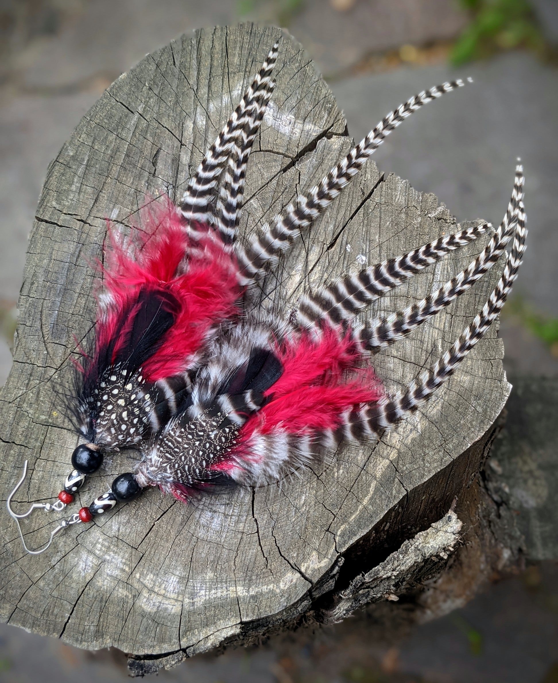 Výrazné peříčkové náušnice (perlička, kohout...) doplněné kostěnými a dřevěnými korálkami. Háčky jsou z chirurgické oceli, dodávám se silikonovými zarážkami. Délka ozdobné části náušnic je až 20 cm.