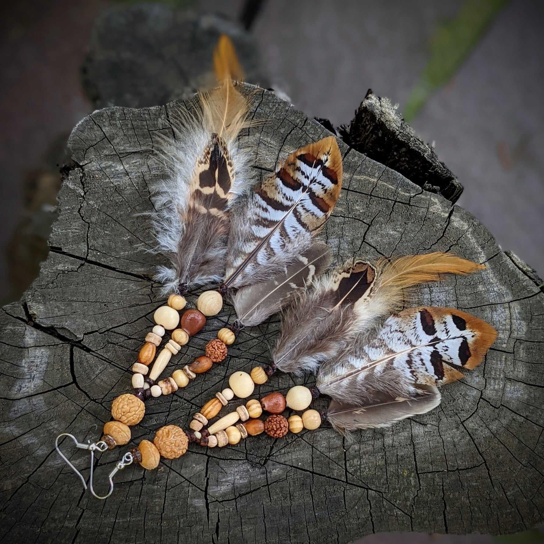 Peříčkové náušnice (kohout, bažant...) inspirované lesem - doplněné korálkami z klokočí,rudrakši, kokosu, hálek a dřevěnými korálkami. Háčky jsou z chirurgické oceli, dodávám se silikonovými zarážkami. Délka ozdobné části náušnic je cca 17 cm.