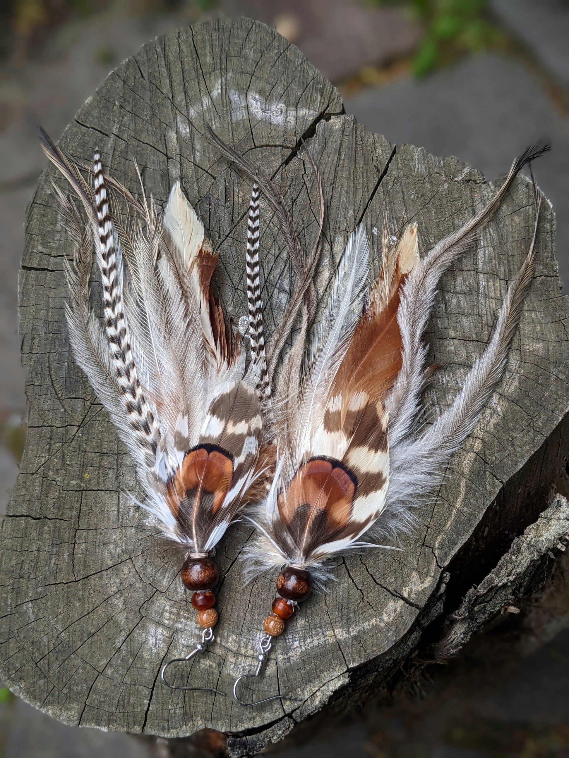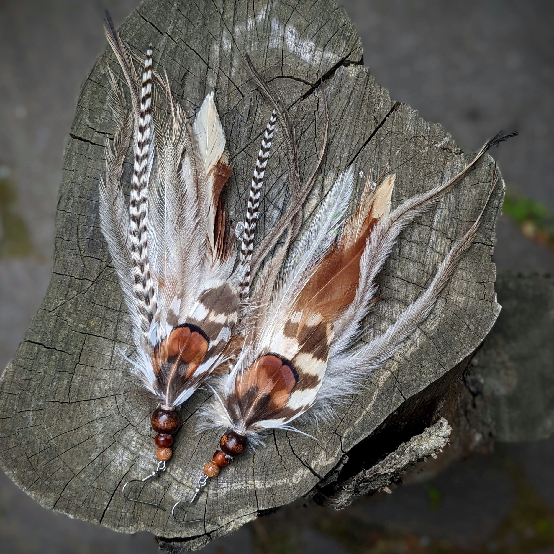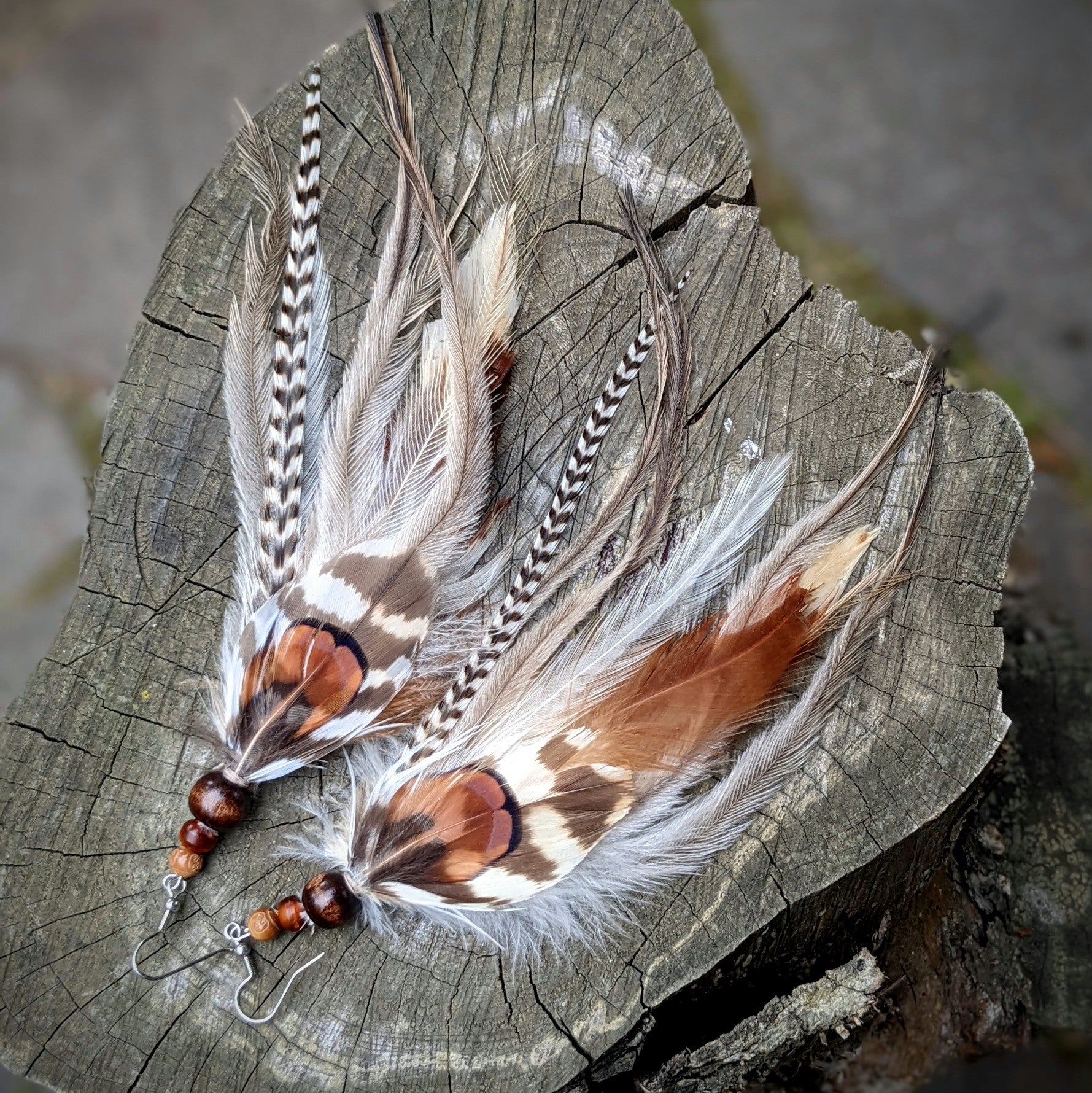 Výrazné peříčkové náušnice (poštolka, bažant, kohout, emu...) doplněné kostěnými a dřevěnými korálkami. Háčky jsou z chirurgické oceli, dodávám se silikonovými zarážkami. Délka ozdobné části náušnic je cca 16 cm.
