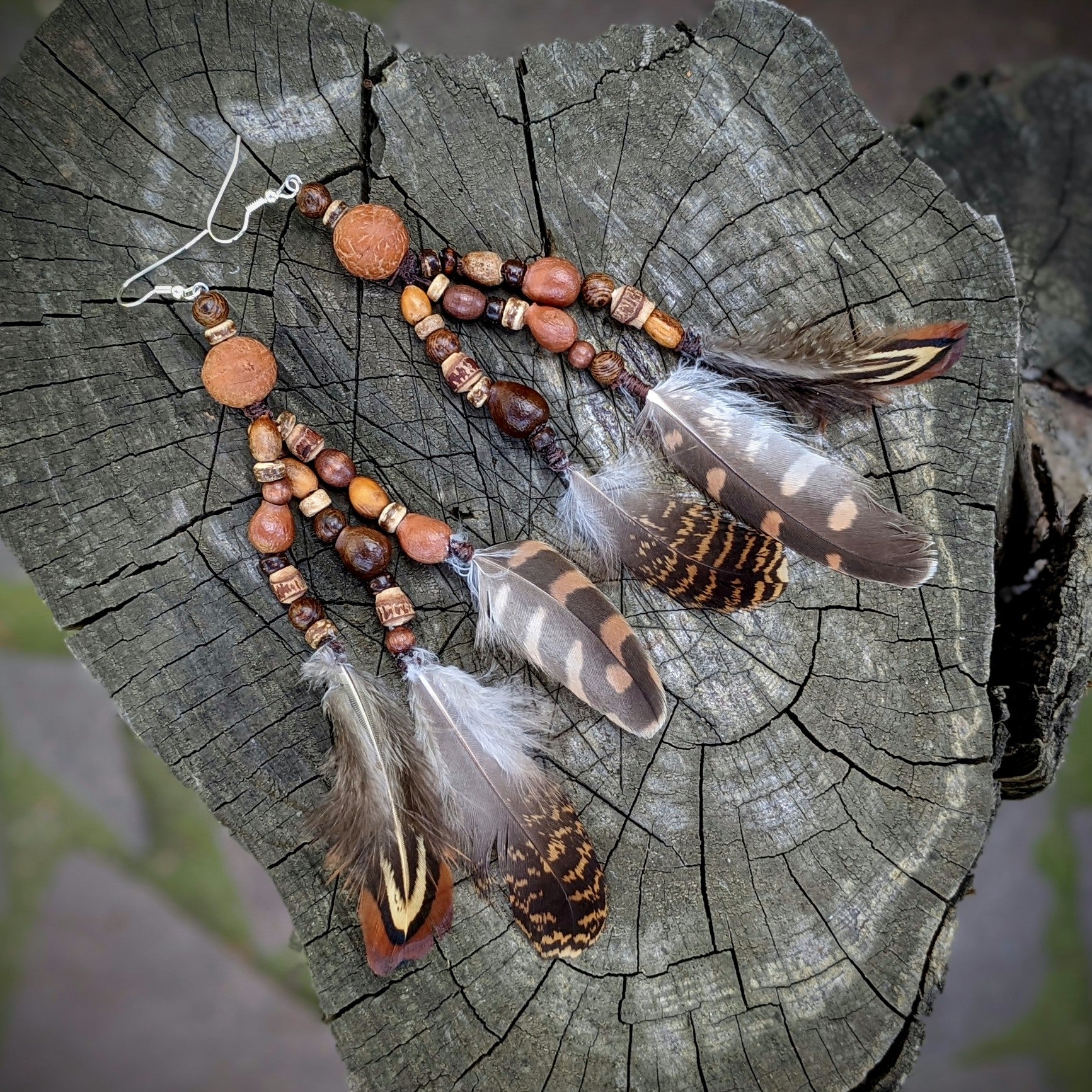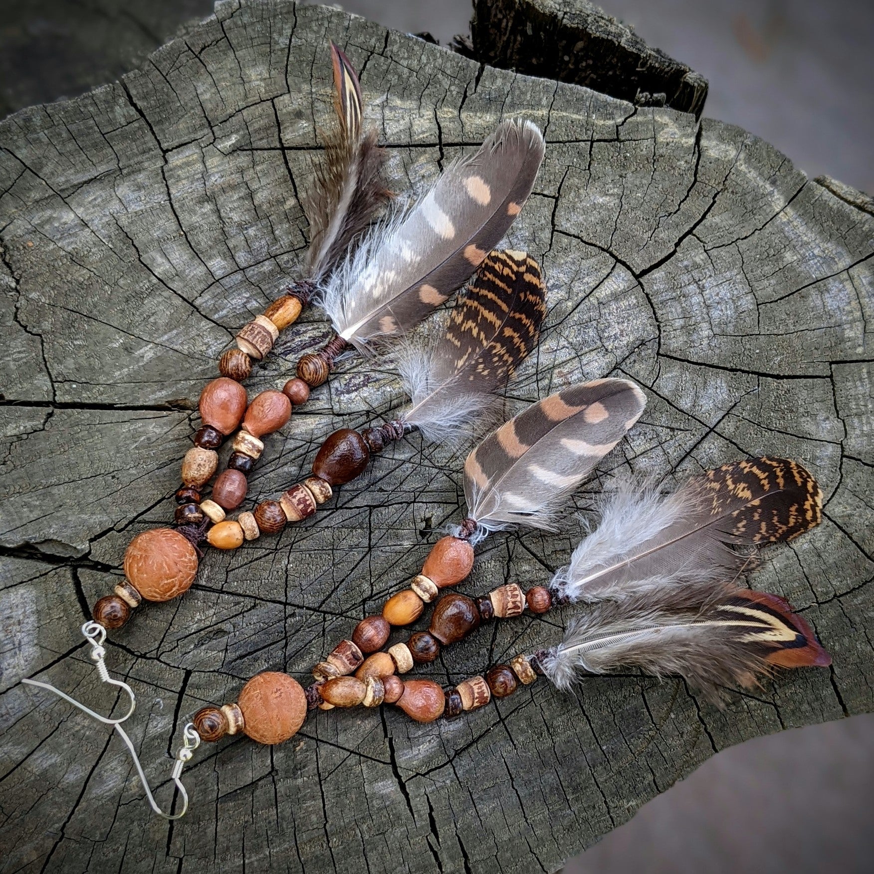 Peříčkové náušnice inspirované lesem s korálkami z klokočí, rudrakši, kokosu, hálek a s dřevěnými korálkami. Háčky jsou z chirurgické oceli, dodávám se silikonovými zarážkami. Délka ozdobné části náušnic je cca 16 cm.