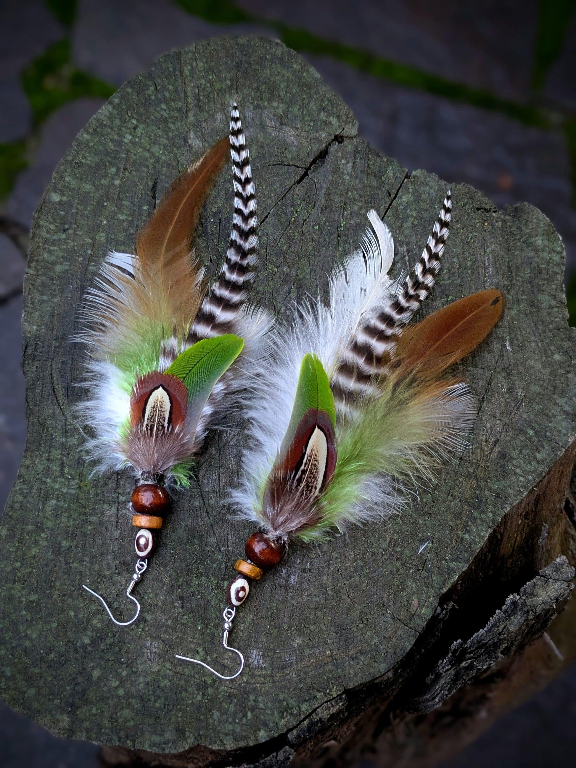 Výrazné peříčkové náušnice (bažant, papoušek, kohout...) doplněné dřevěnými a skleněnými korálky. Háčky jsou z nerezové oceli, dodávám se silikonovými zarážkami. Délka ozdobné části náušnic je cca 16 cm.