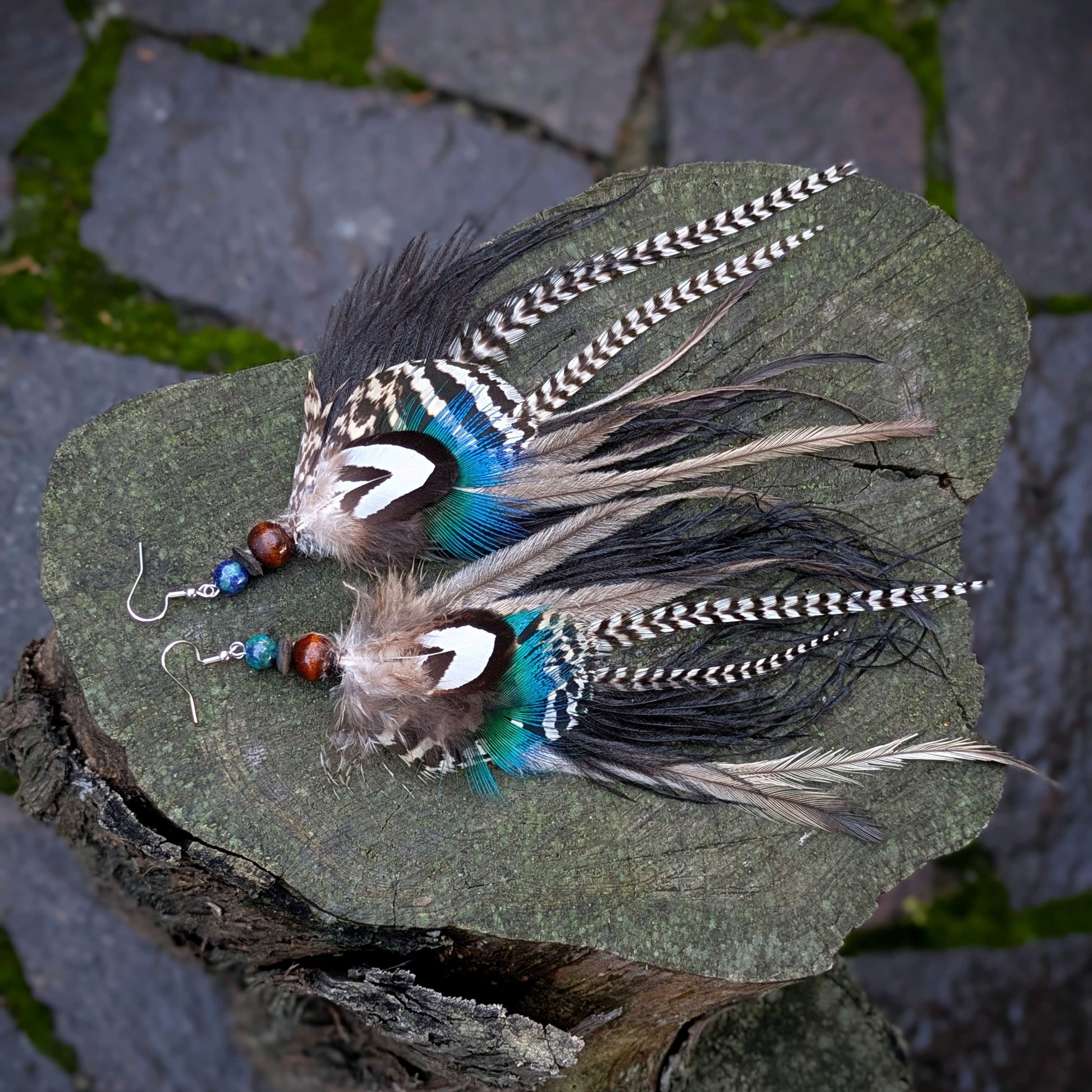 Výrazné peříčkové náušnice (emu, pštros, bažant, kohout, páv...) doplněné korálky ze dřeva a minerálů. Háčky jsou z nerezové oceli, dodávám se silikonovými zarážkami. Délka ozdobné části náušnic je cca 18 cm.