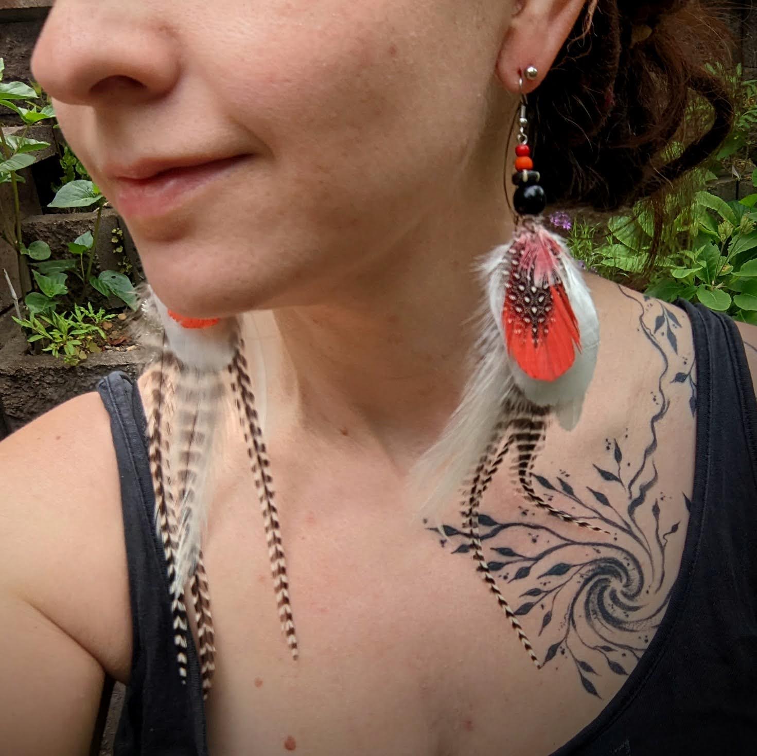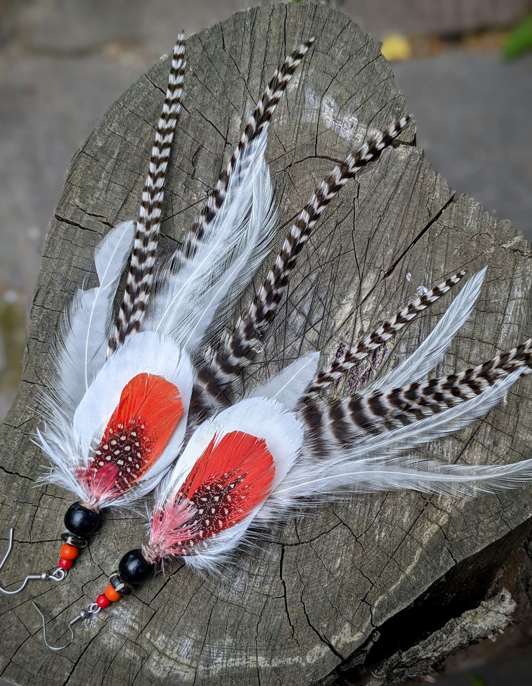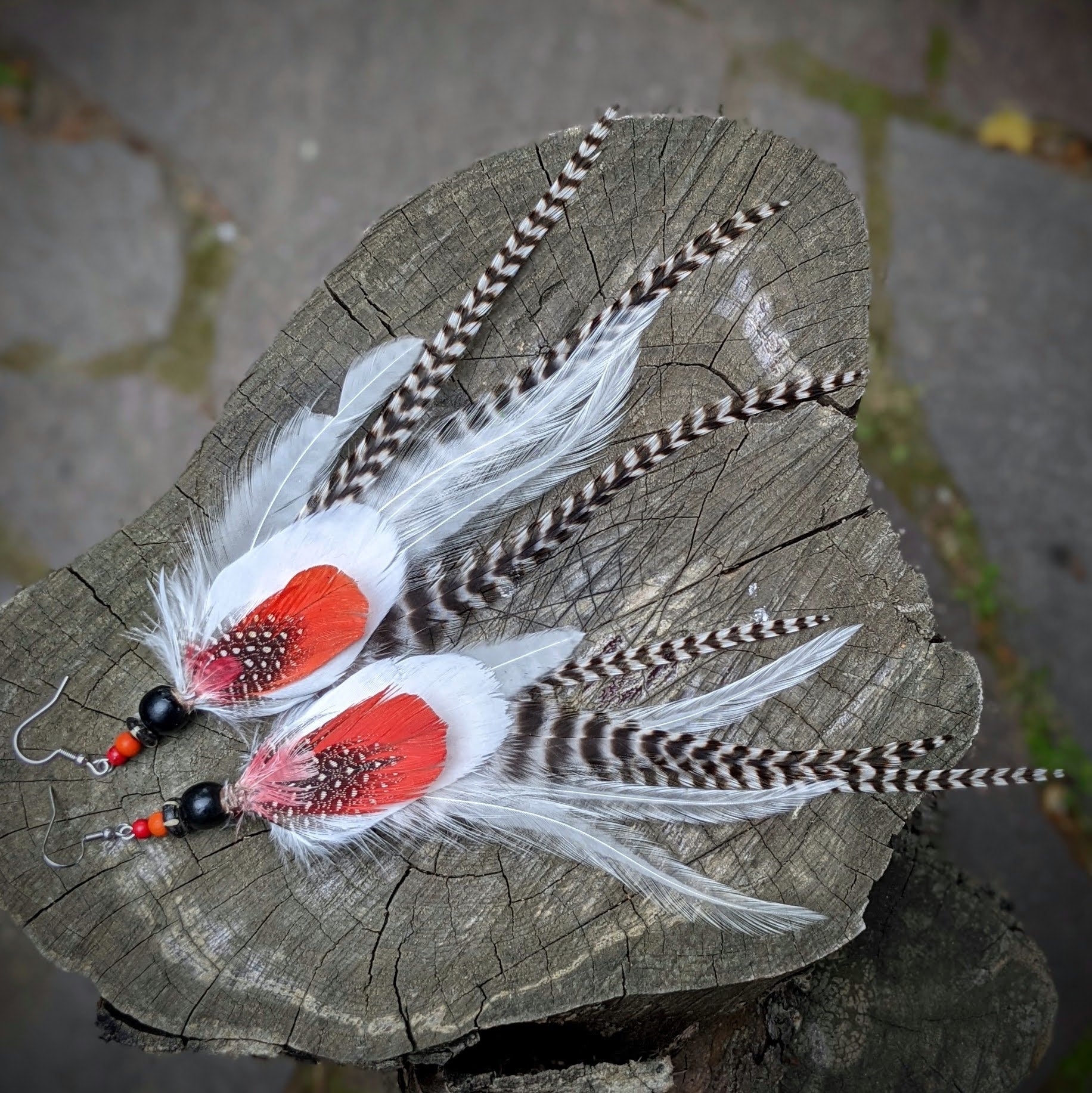 Výrazné peříčkové náušnice (labuť, perlička, kohout...) doplněné kostěnými a dřevěnými korálky. Háčky jsou z chirurgické oceli, dodávám se silikonovými zarážkami. Délka ozdobné části náušnic je až 20 cm.