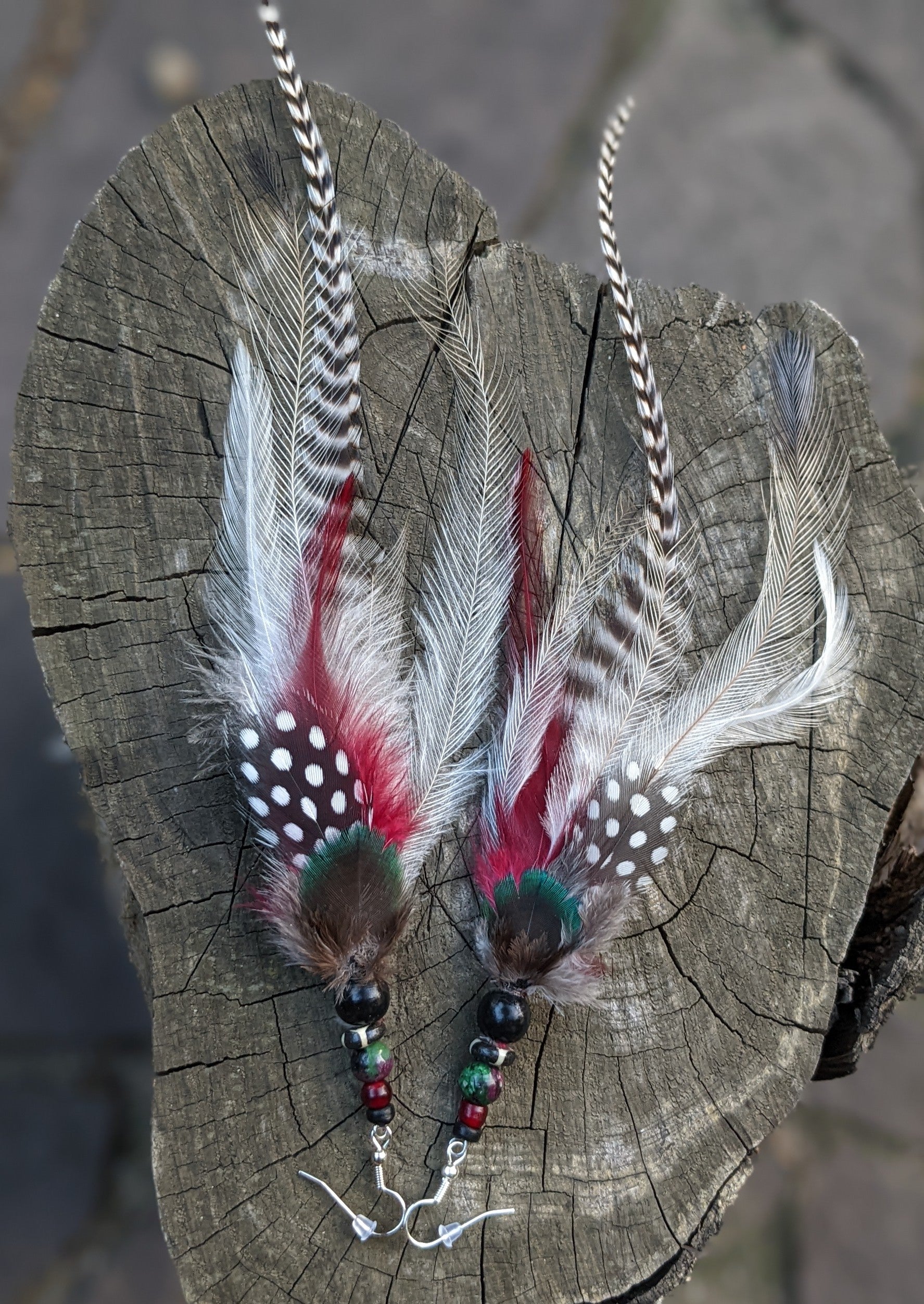 Výrazné peříčkové náušnice (perlička, emu, páv, kohout...) doplněné dřevěnými, kostěnými a minerálními korálkami. Háčky jsou z chirurgické oceli, dodávám se silikonovými zarážkami. Délka ozdobné části náušnic je cca 22 cm.