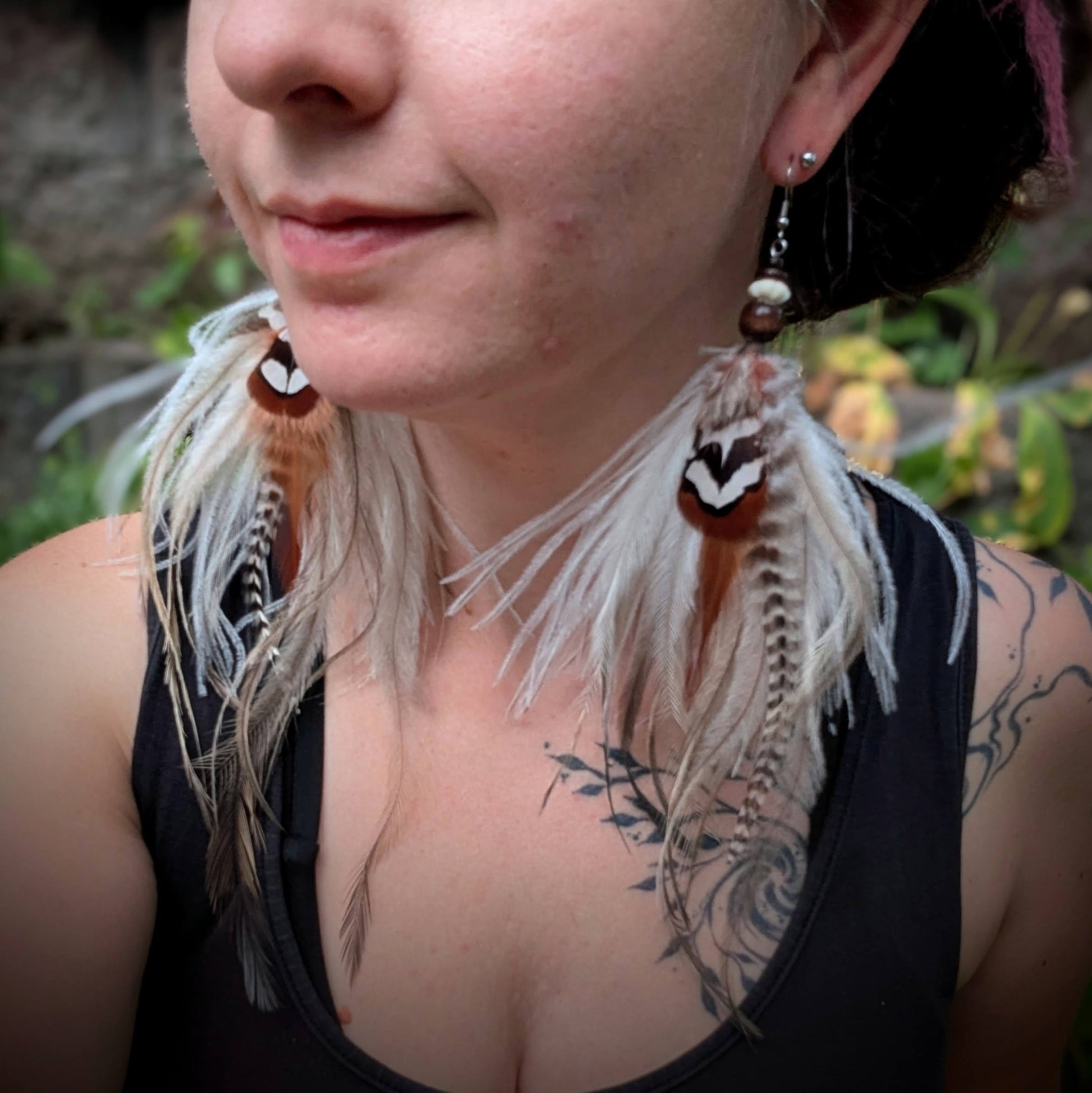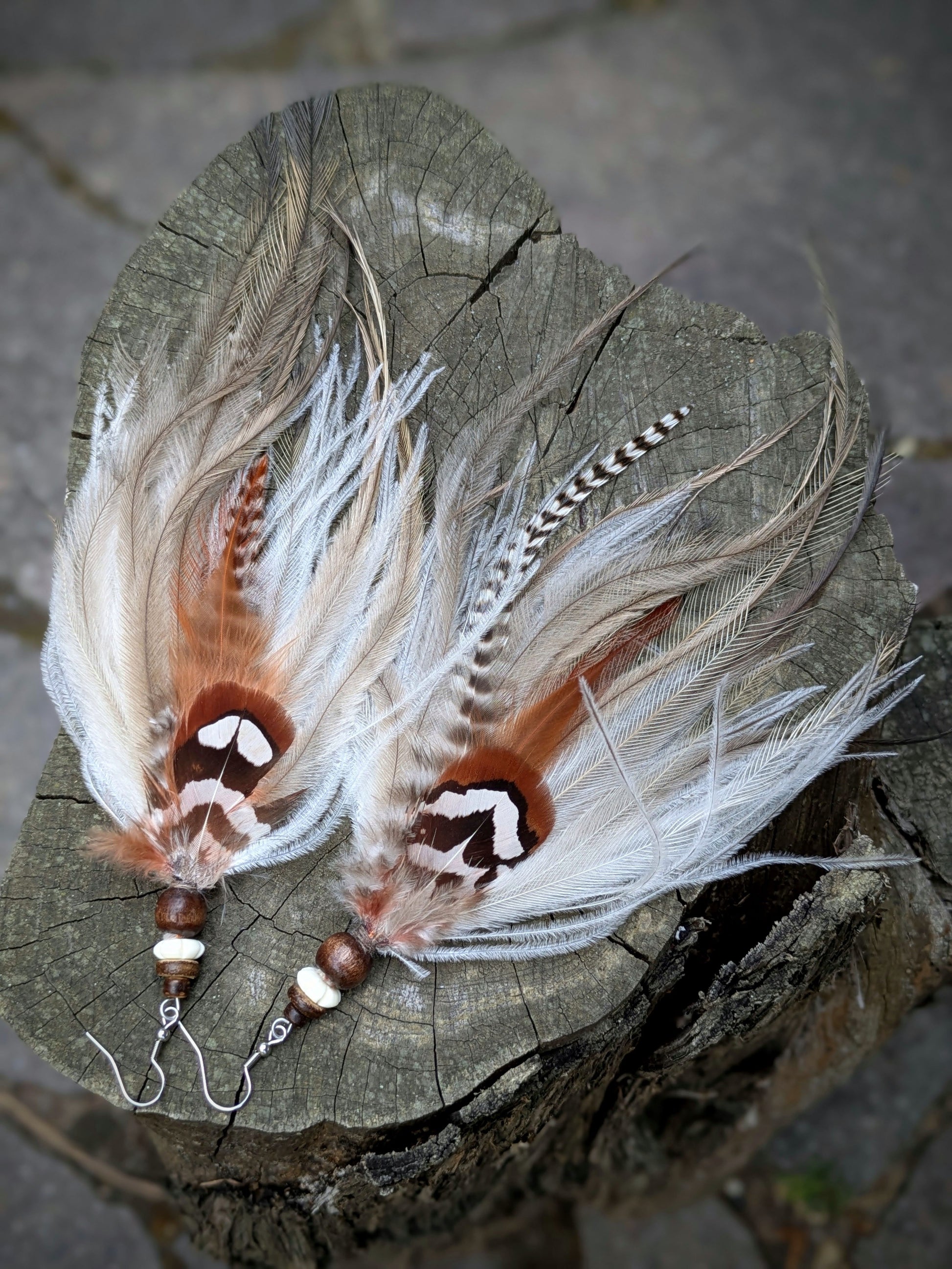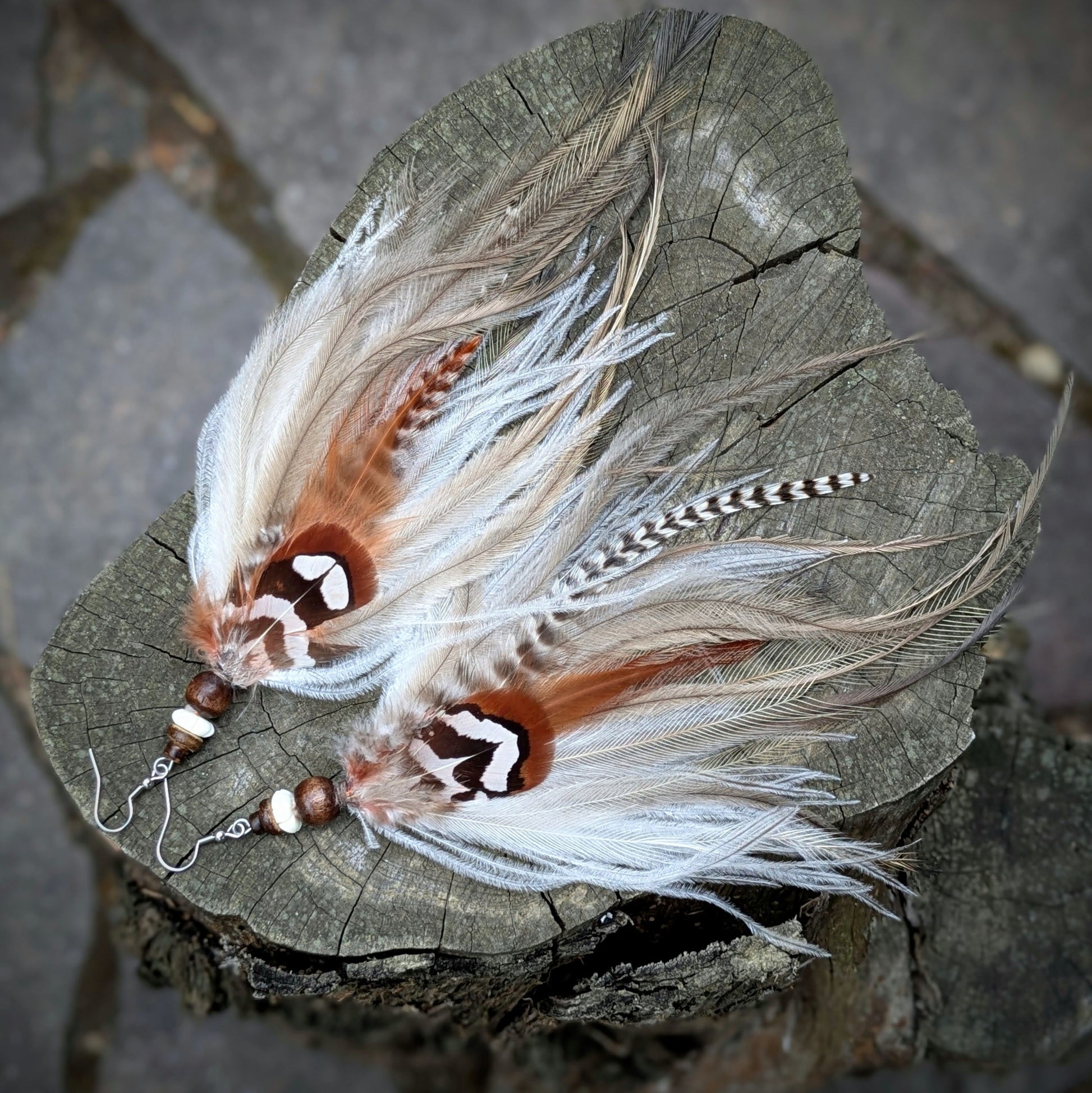 Výrazné peříčkové náušnice (emu, pštros, bažant, kohout...) doplněné korálky ze dřeva a kosti. Háčky jsou z chirurgické oceli, dodávám se silikonovými zarážkami. Délka ozdobné části náušnic je cca 20 cm.