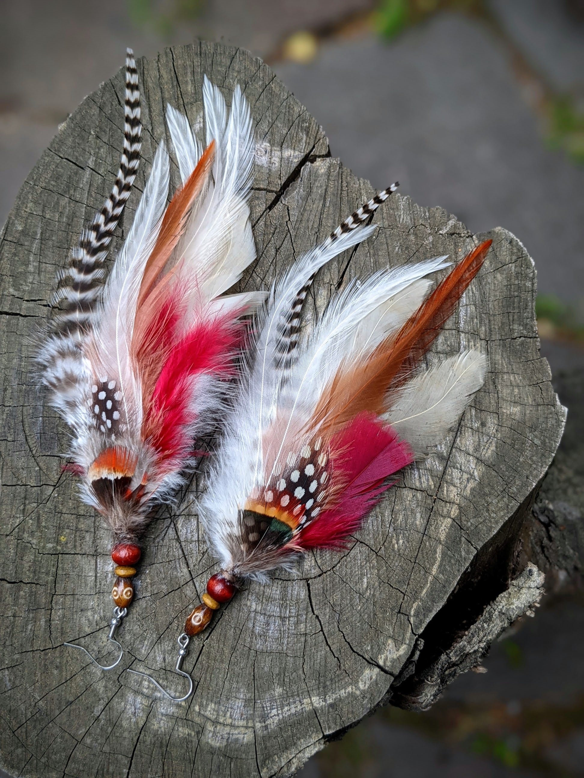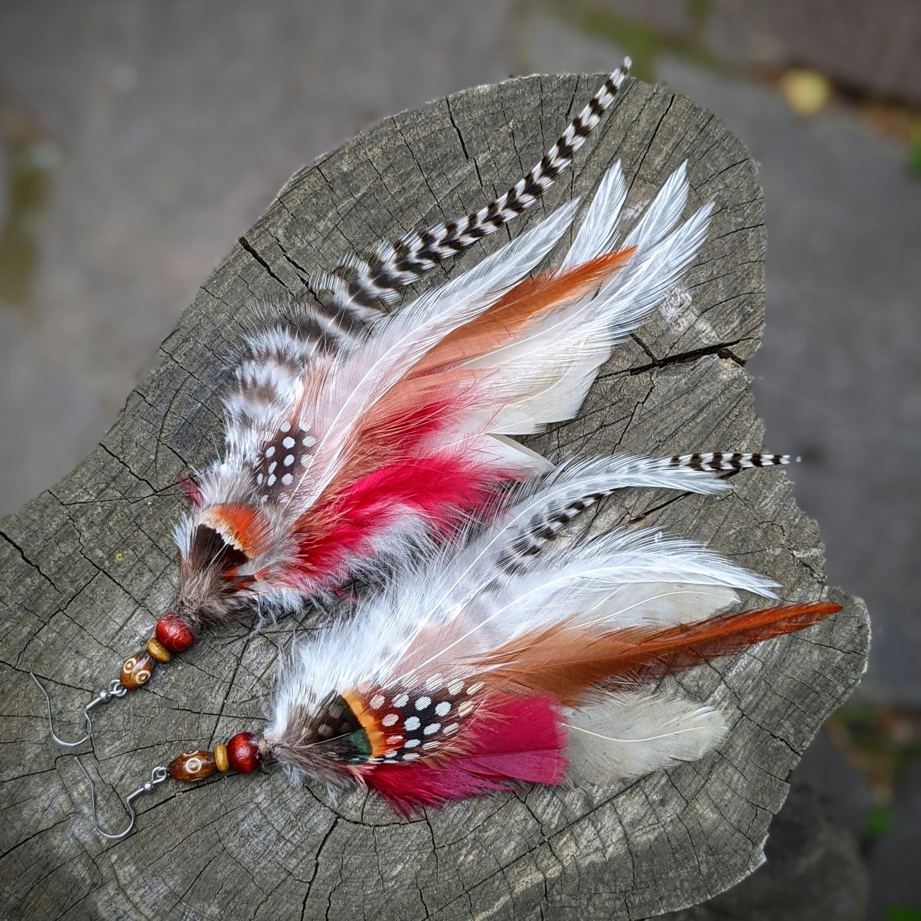 Výrazné peříčkové náušnice (perlička, kachnička, kohout...) doplněné kostěnými a dřevěnými korálkami. Háčky jsou z chirurgické oceli, dodávám se silikonovými zarážkami. Délka ozdobné části náušnic je cca 18 cm.