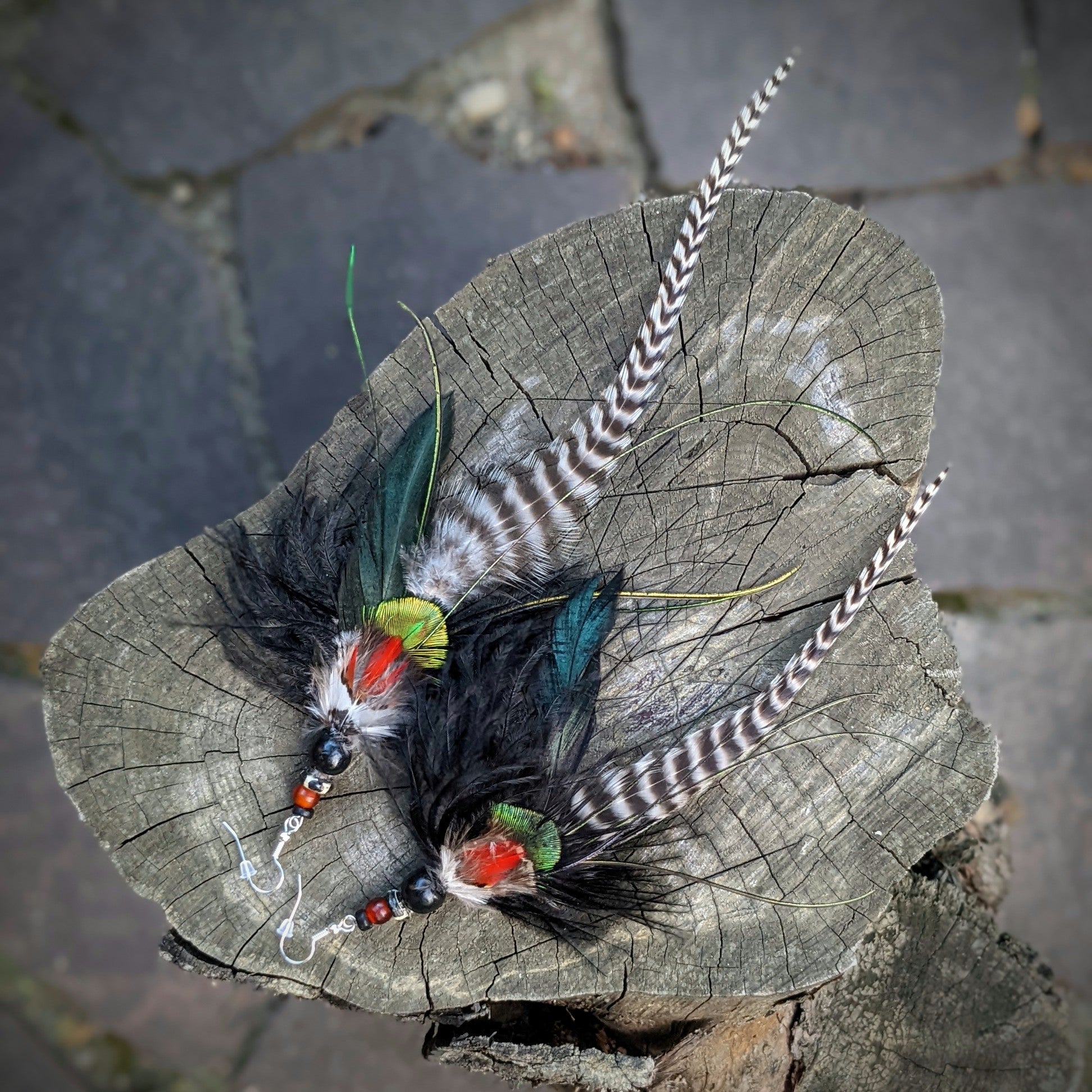 Výrazné peříčkové náušnice (pštros, páv, bažant, kohout...) doplněné dřevěnými a kostěnými korálkami. Háčky jsou z chirurgické oceli, dodávám se silikonovými zarážkami. Délka ozdobné části náušnic je cca 20 cm.