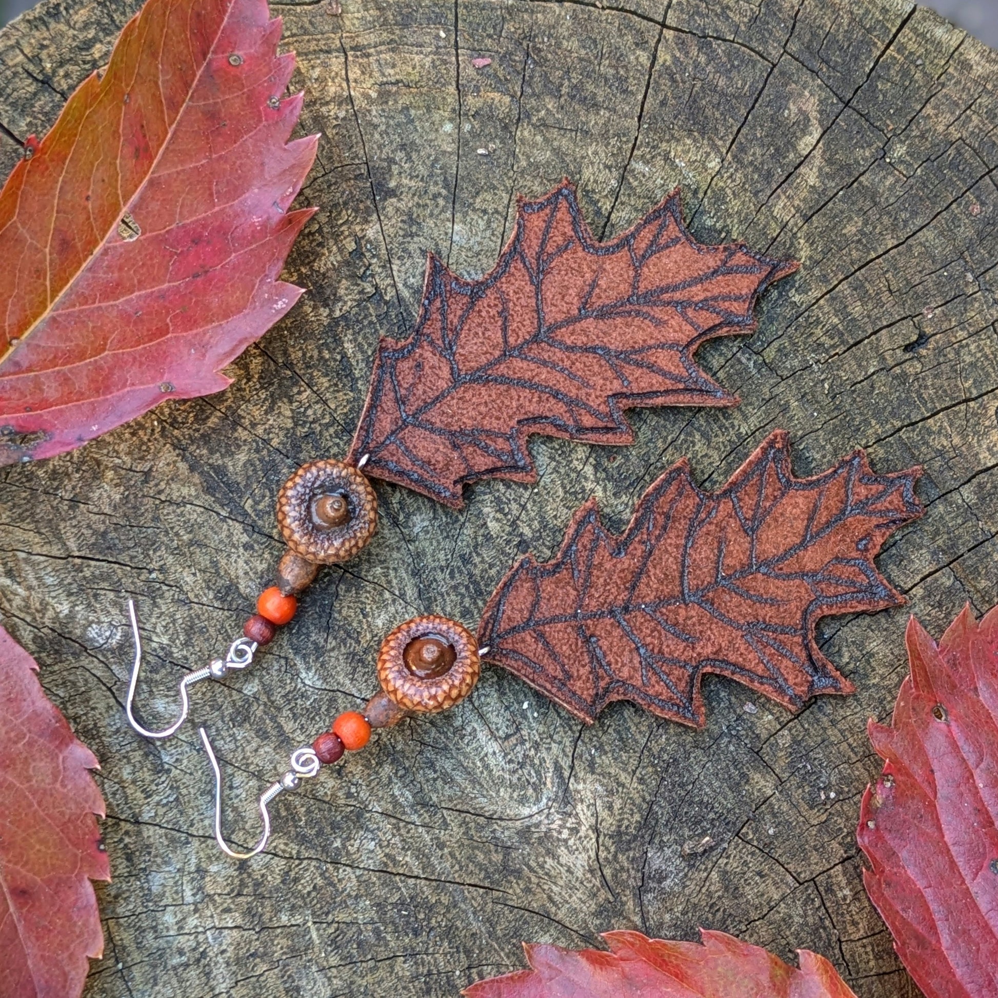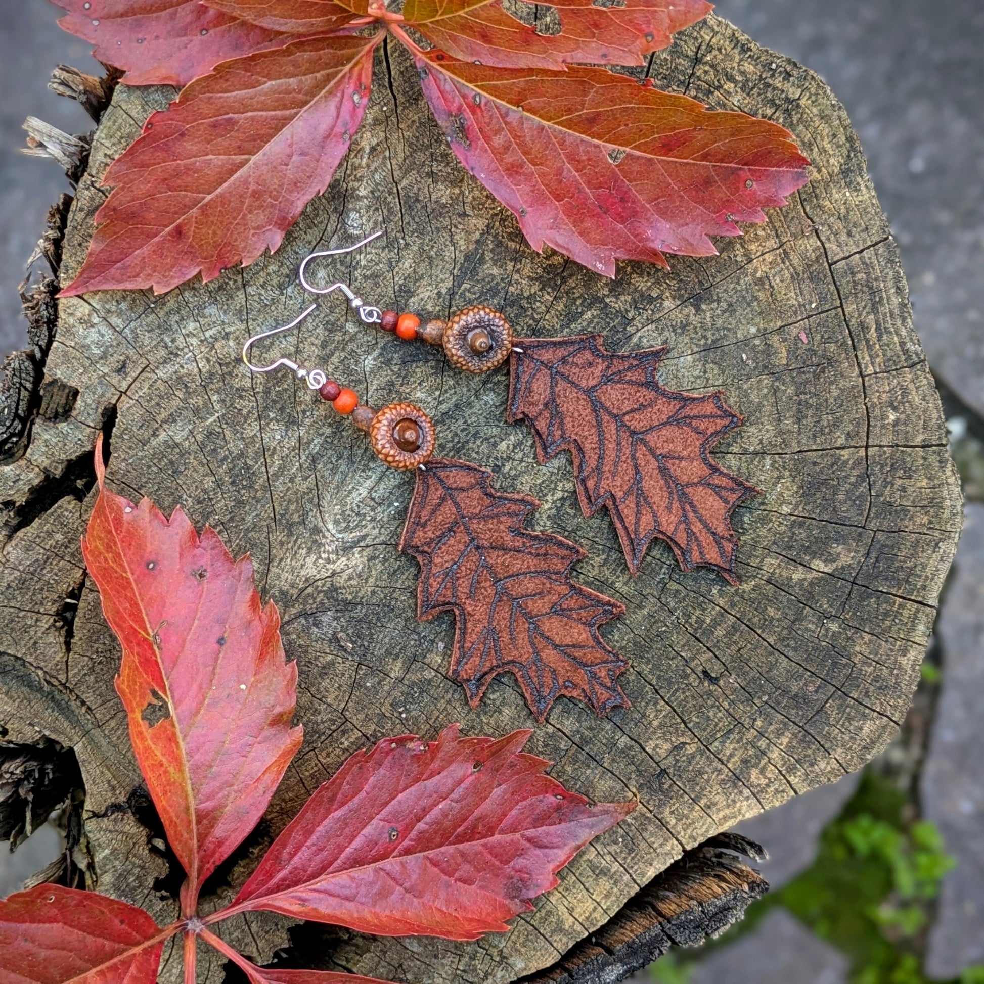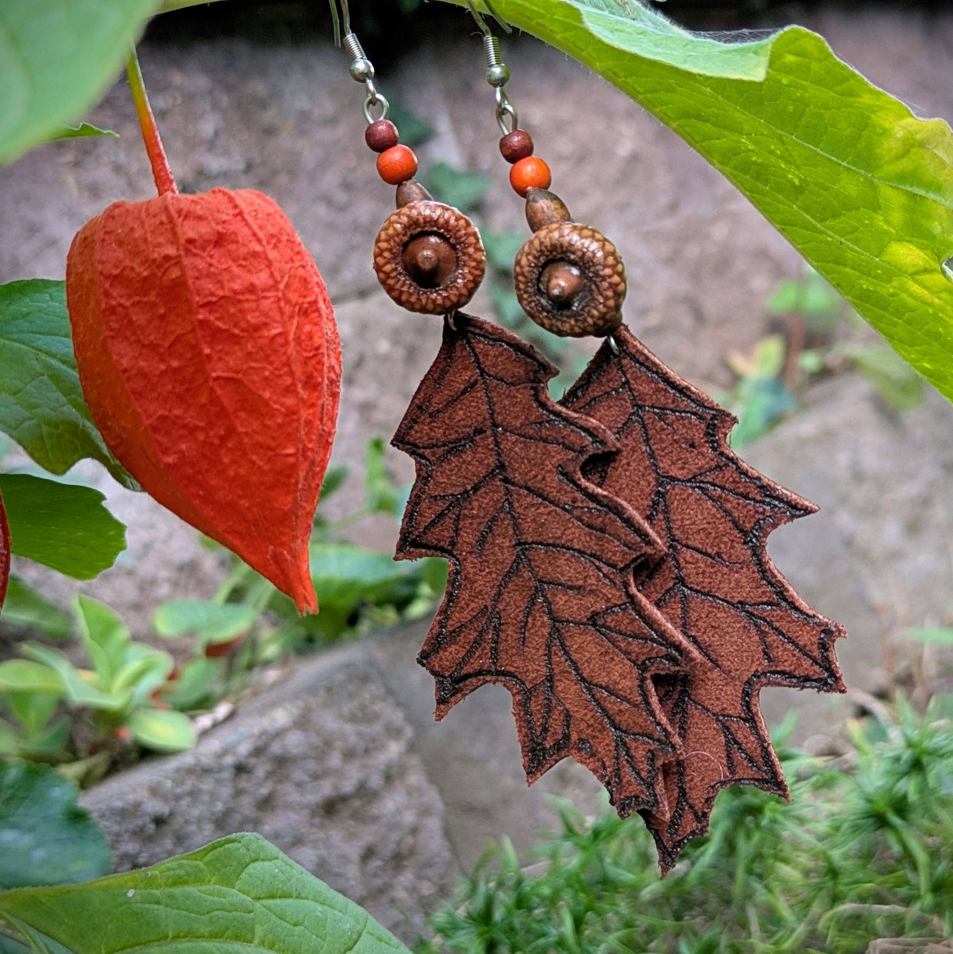 Podzimní náušnice s ručně vypalovaným koženým dubovým lístkem. Doplněné jsou korálky z pravých žaludů, dřeva a hálek. Háčky jsou z nerezové oceli, dodávám se silikonovými zarážkami. Délka ozdobné části náušnic je cca 11 cm.