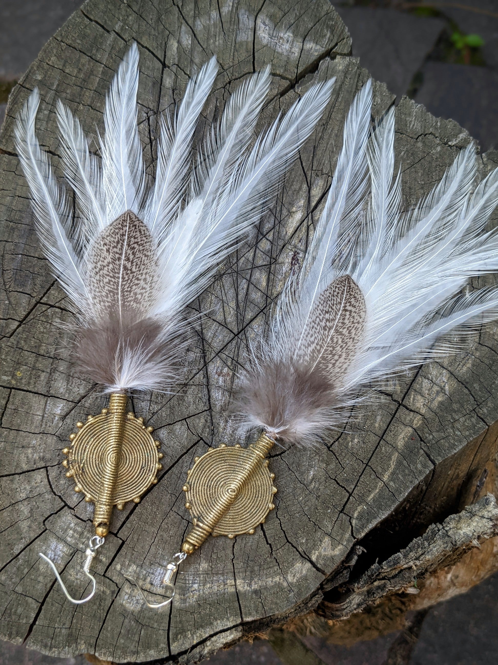 Výrazné peříčkové náušnice s nádhernými mosaznými korálkami ručně vyráběnými v Ghaně (náušnice jsou tedy trochu těžší). Háčky jsou z chirurgické oceli, dodávám se silikonovými zarážkami. Délka ozdobné části náušnic je cca 16 cm.