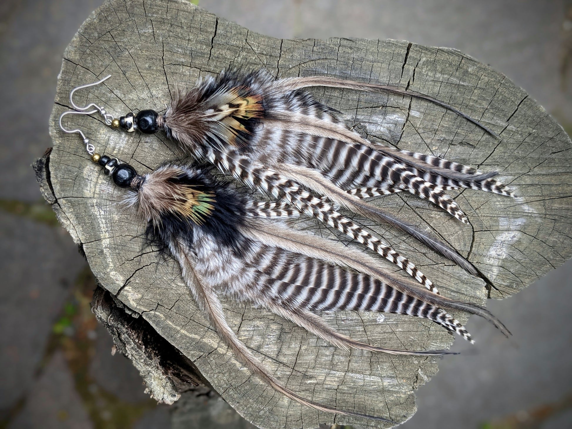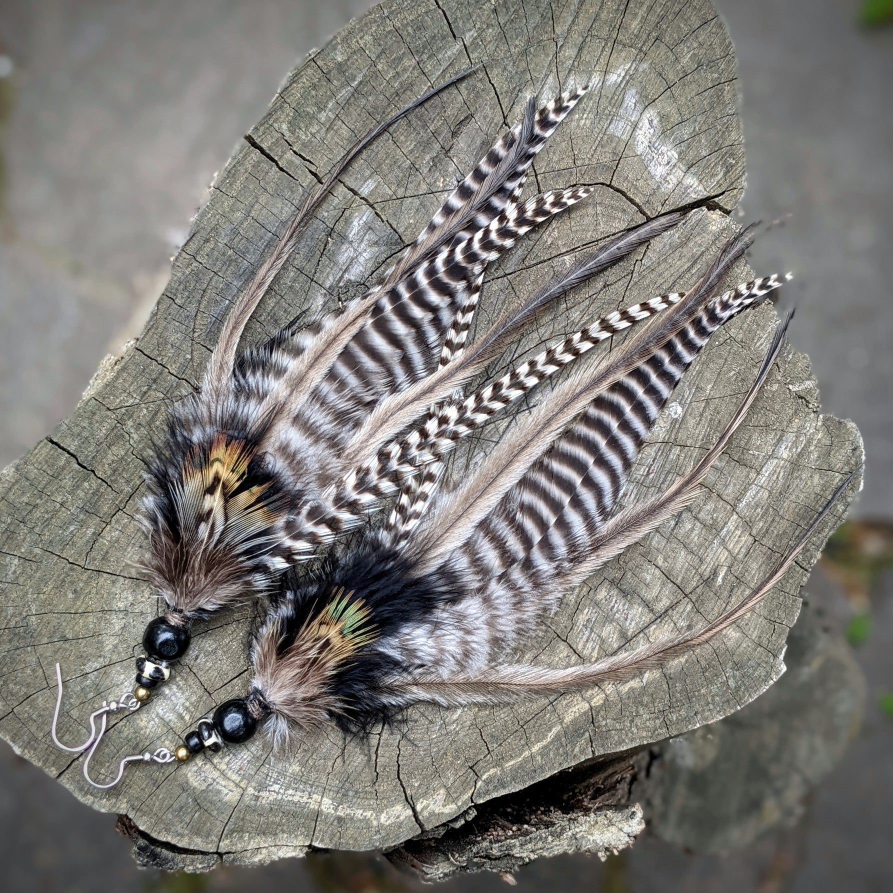 Výrazné peříčkové náušnice (bažant, emu, kohout...) doplněné kostěnými a dřevěnými korálkami. Háčky jsou z chirurgické oceli, dodávám se silikonovými zarážkami. Délka ozdobné části náušnic je až 20 cm.