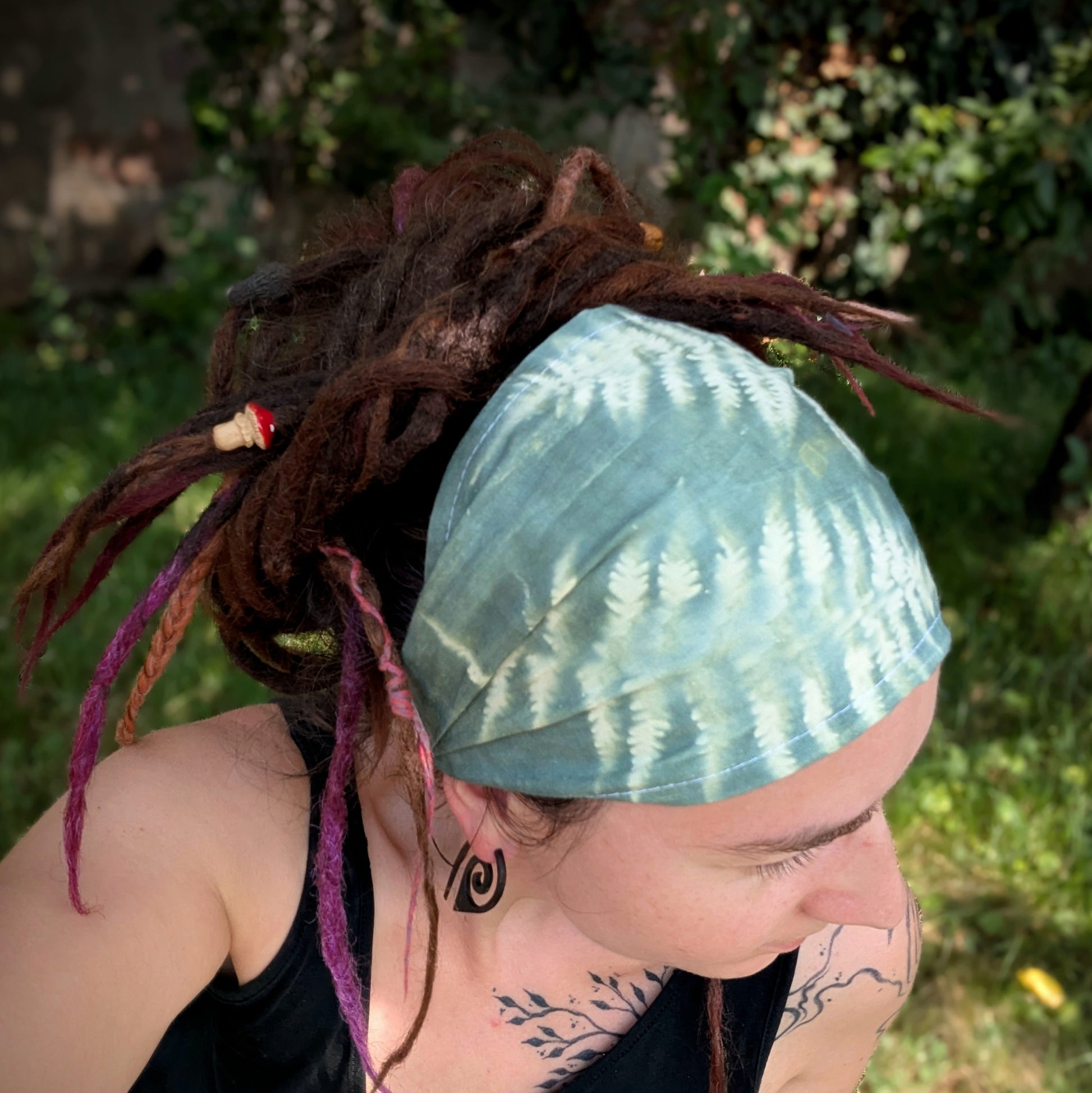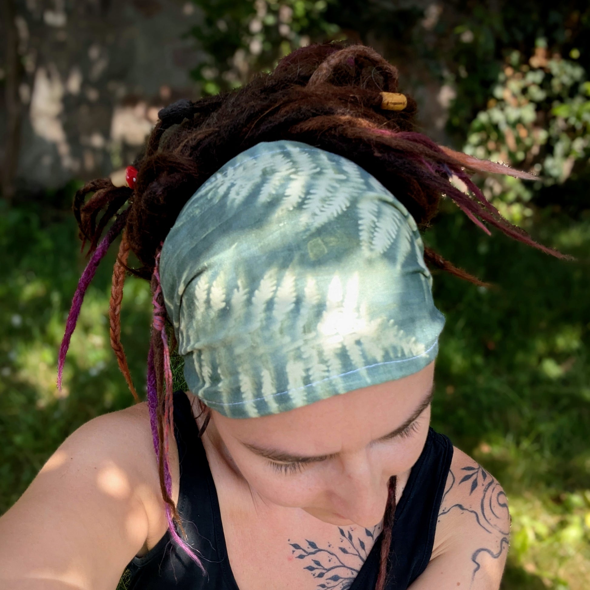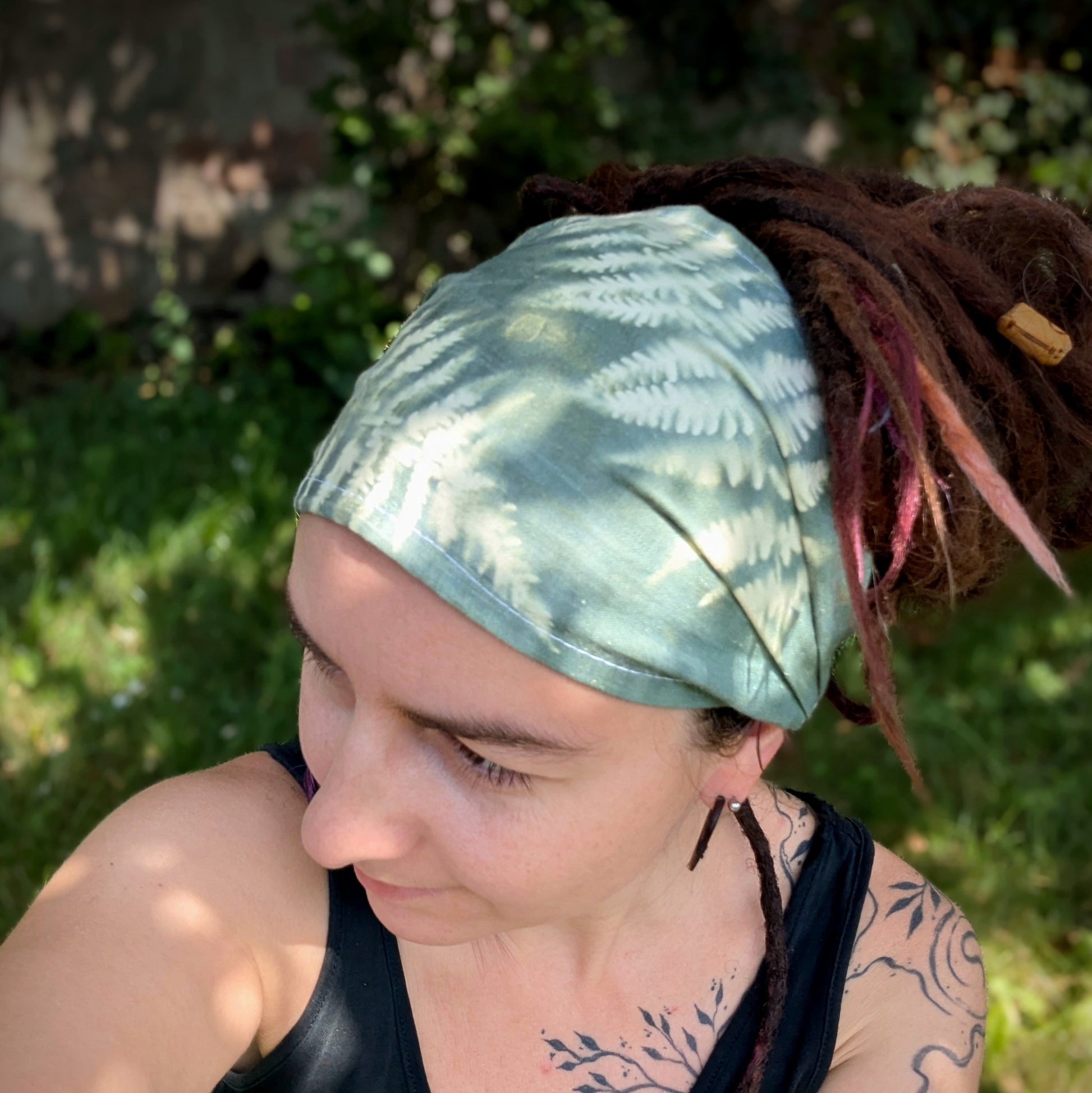 Praktická šátková čelenka šitá z recyklovaného plátna a barvená "slunečními" barvami s obtisky reálných listů.