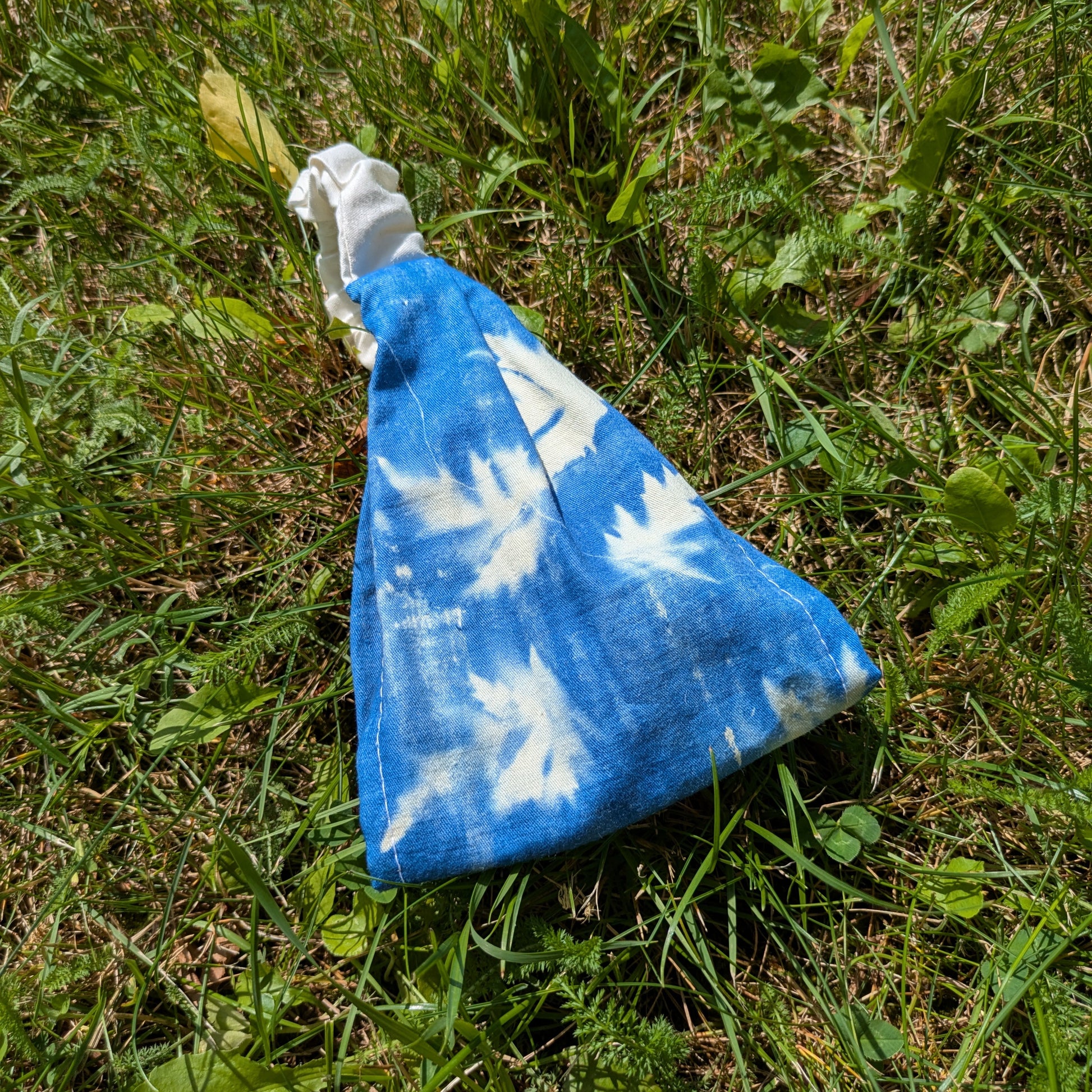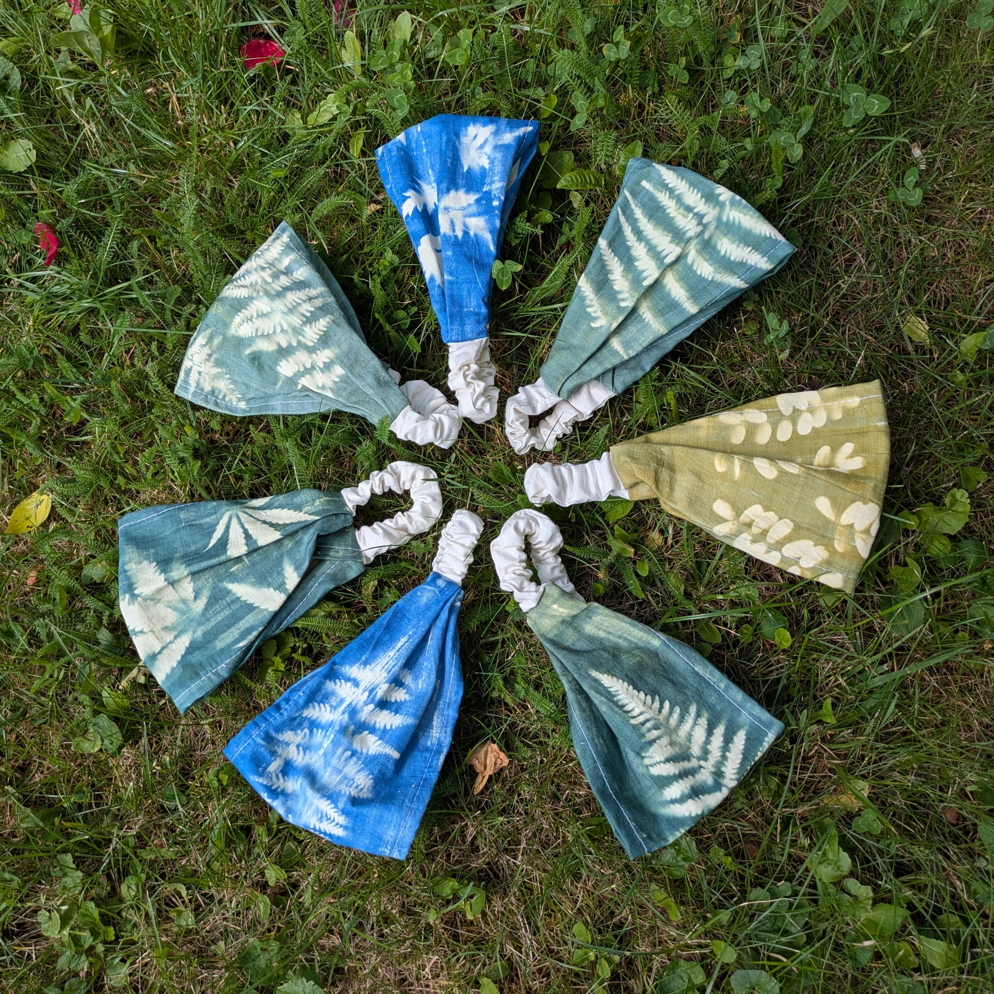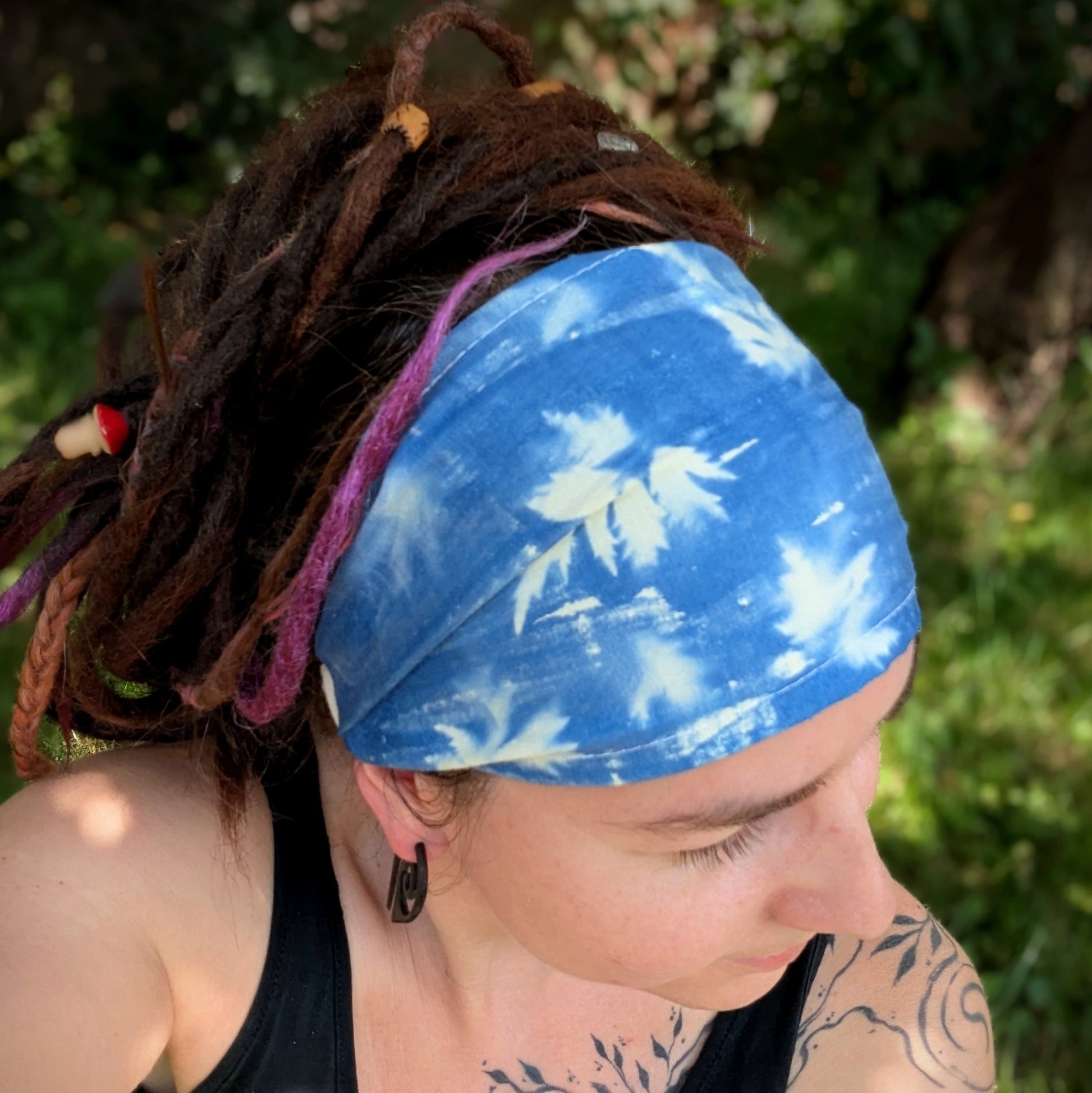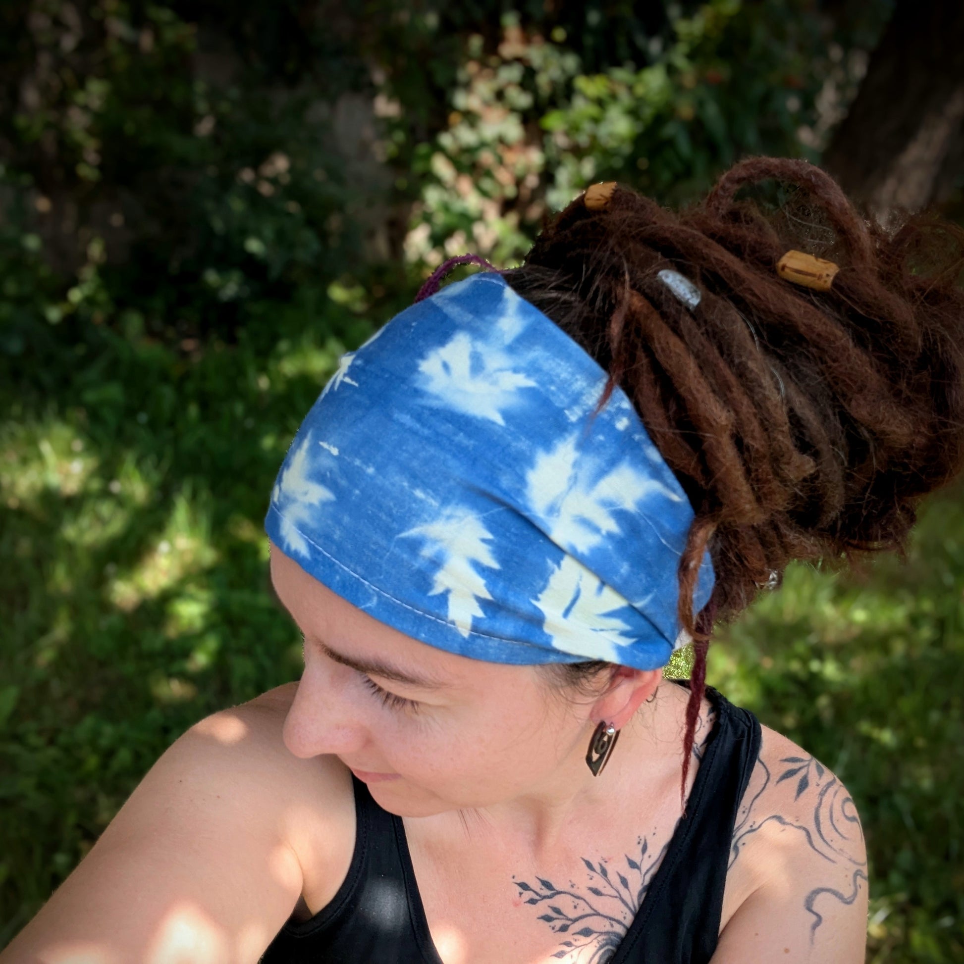 Praktická šátková čelenka šitá z recyklovaného plátna a barvená "slunečními" barvami s obtisky reálných listů.