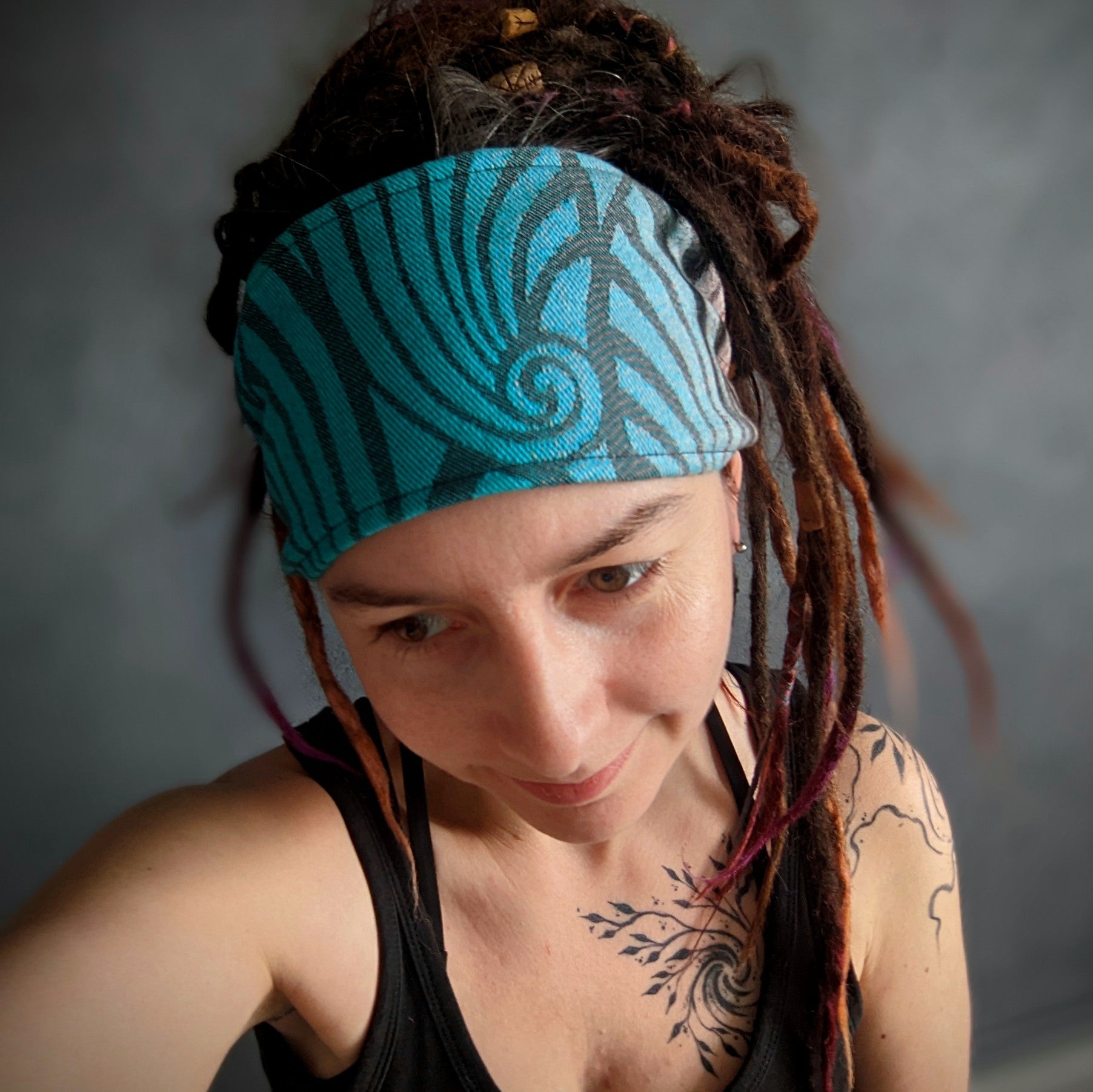 Praktická šátková čelenka šitá z odstřižku z šátku na nošení dětí.