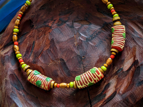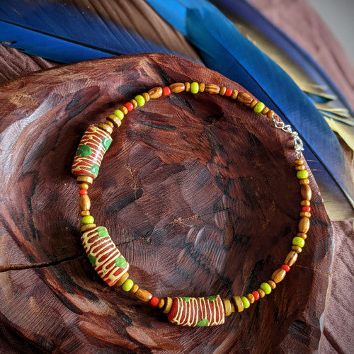 The necklace is created from original African "krobo" recycled glass beads, traditionally made in Ghana, which are complemented with wooden and glass beads. Threaded on a hoop, which is designed for a neck circumference of 30-35 cm - can be adjusted with a carabiner and chain. The chain and carabiner are made of jewelry metal.