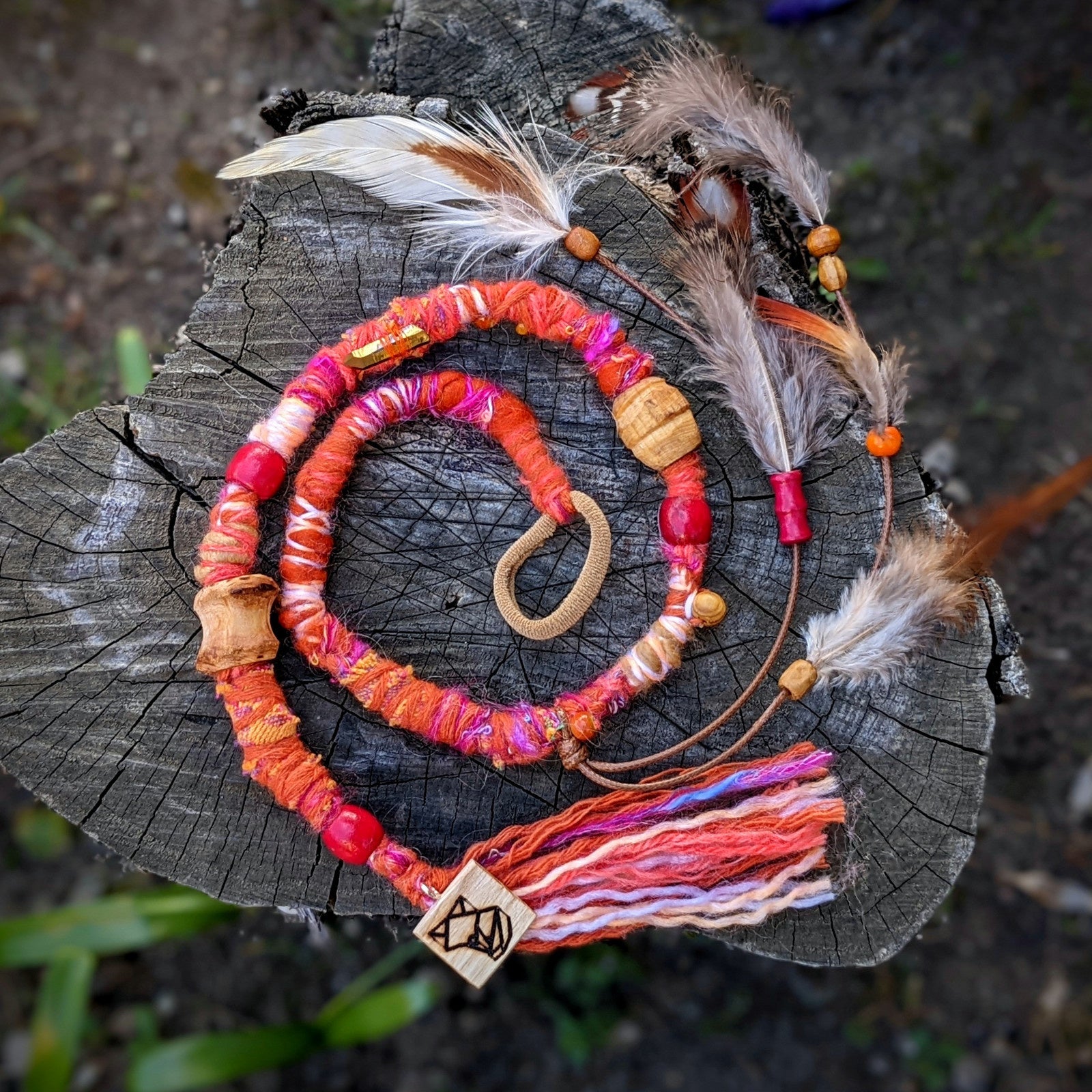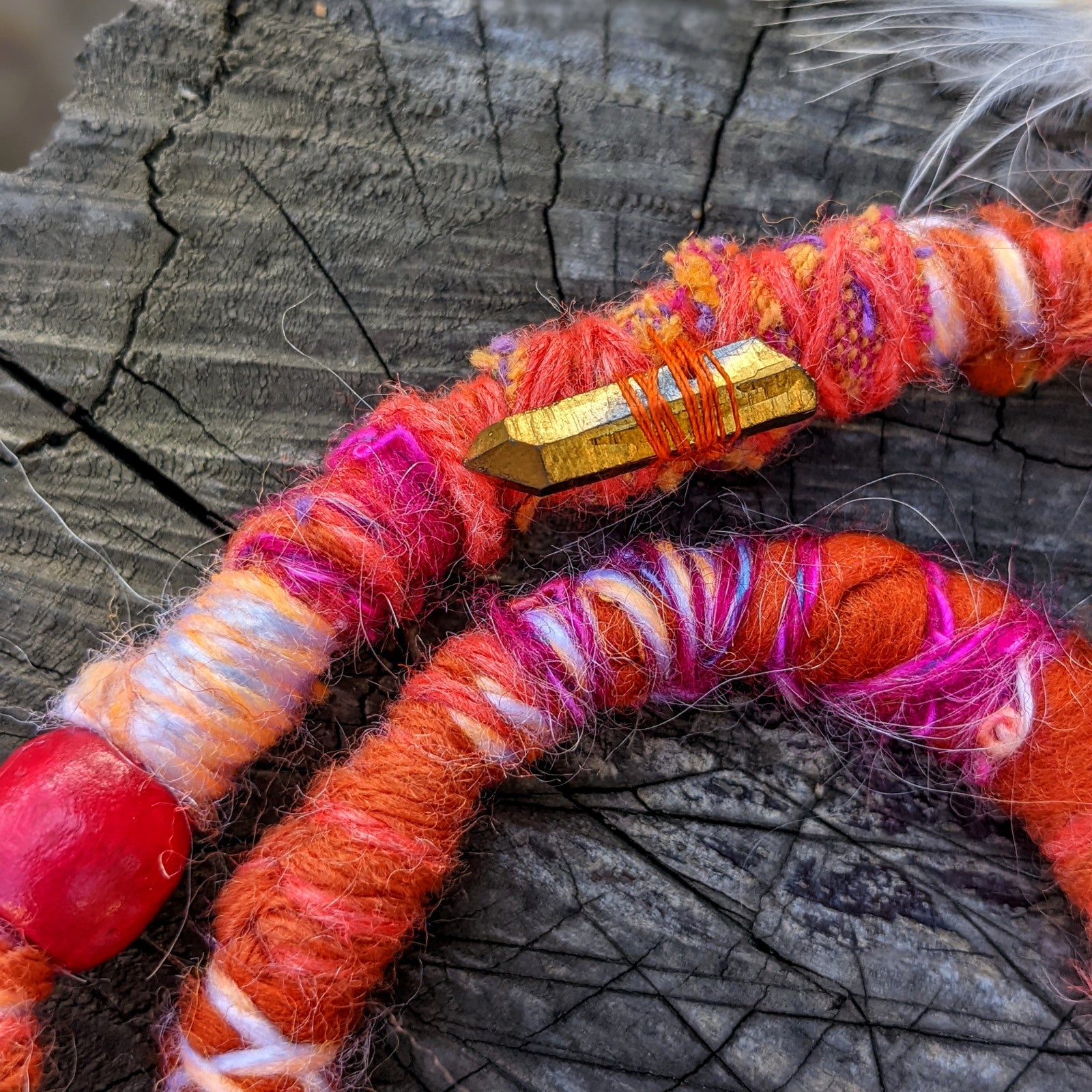 Decorative dread made of yarn and recycled materials. Decorated with a fired pendant with a fox, wooden and ceramic beads, a crystal and a feather pendant that can be removed from the dread and used separately as a feather decoration for hair/dreads.
