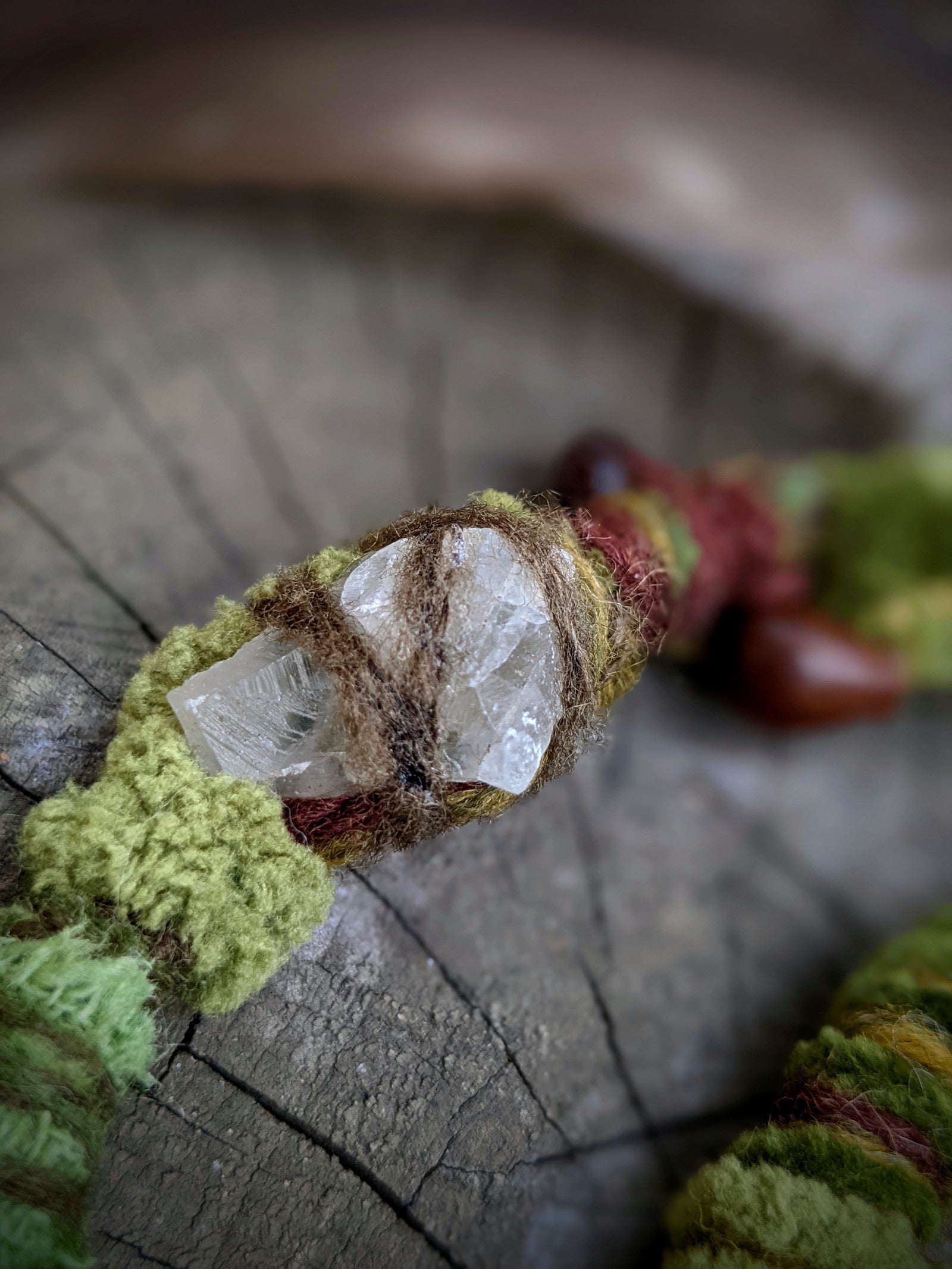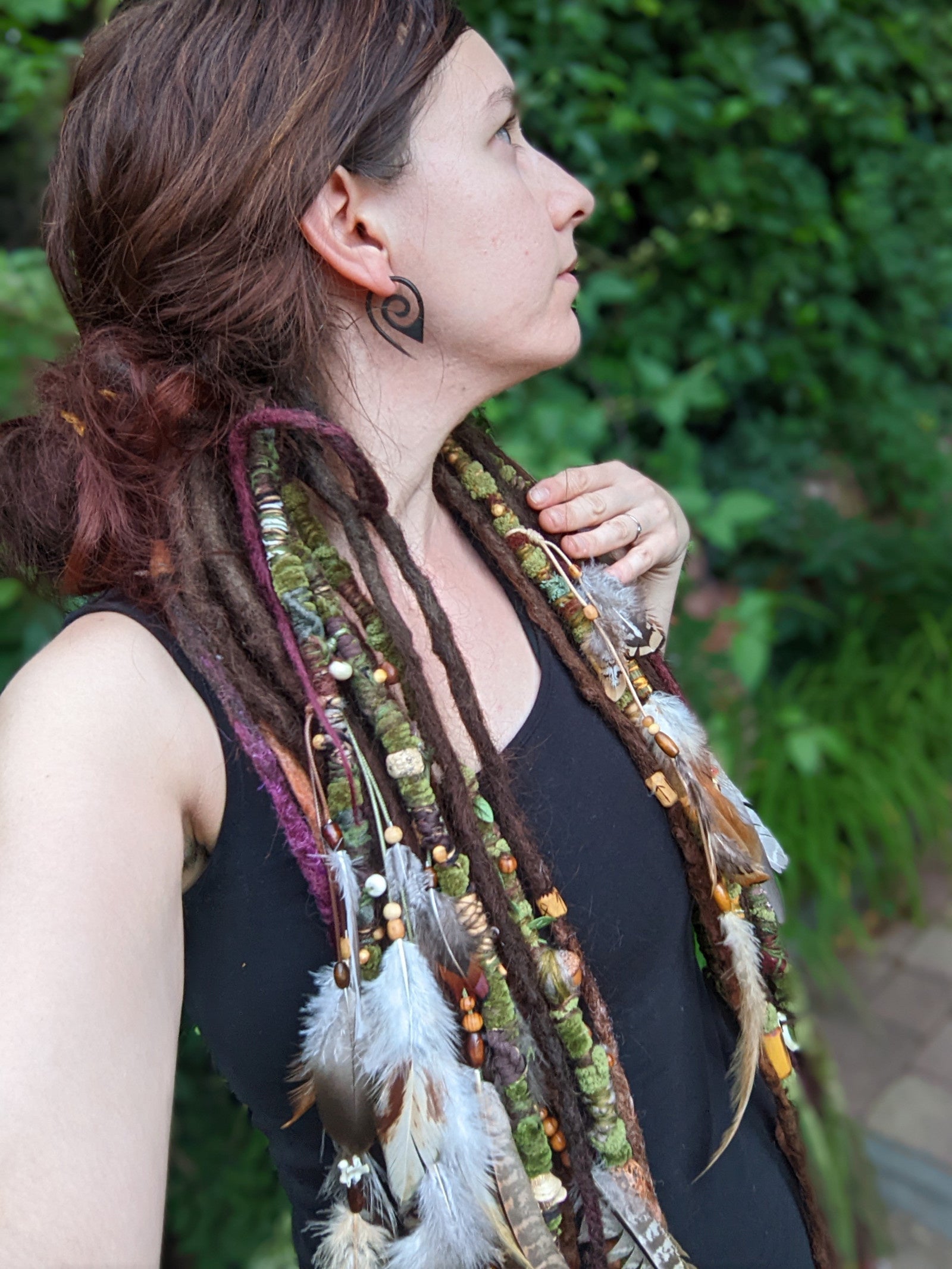 Decorative dread with moss texture made of yarn and recycled materials. Decorated with acorns, kangaroos, raw crystal, wooden beads and a feather curtain that can be removed from the dread and used separately as a feather decoration for hair/dreads.