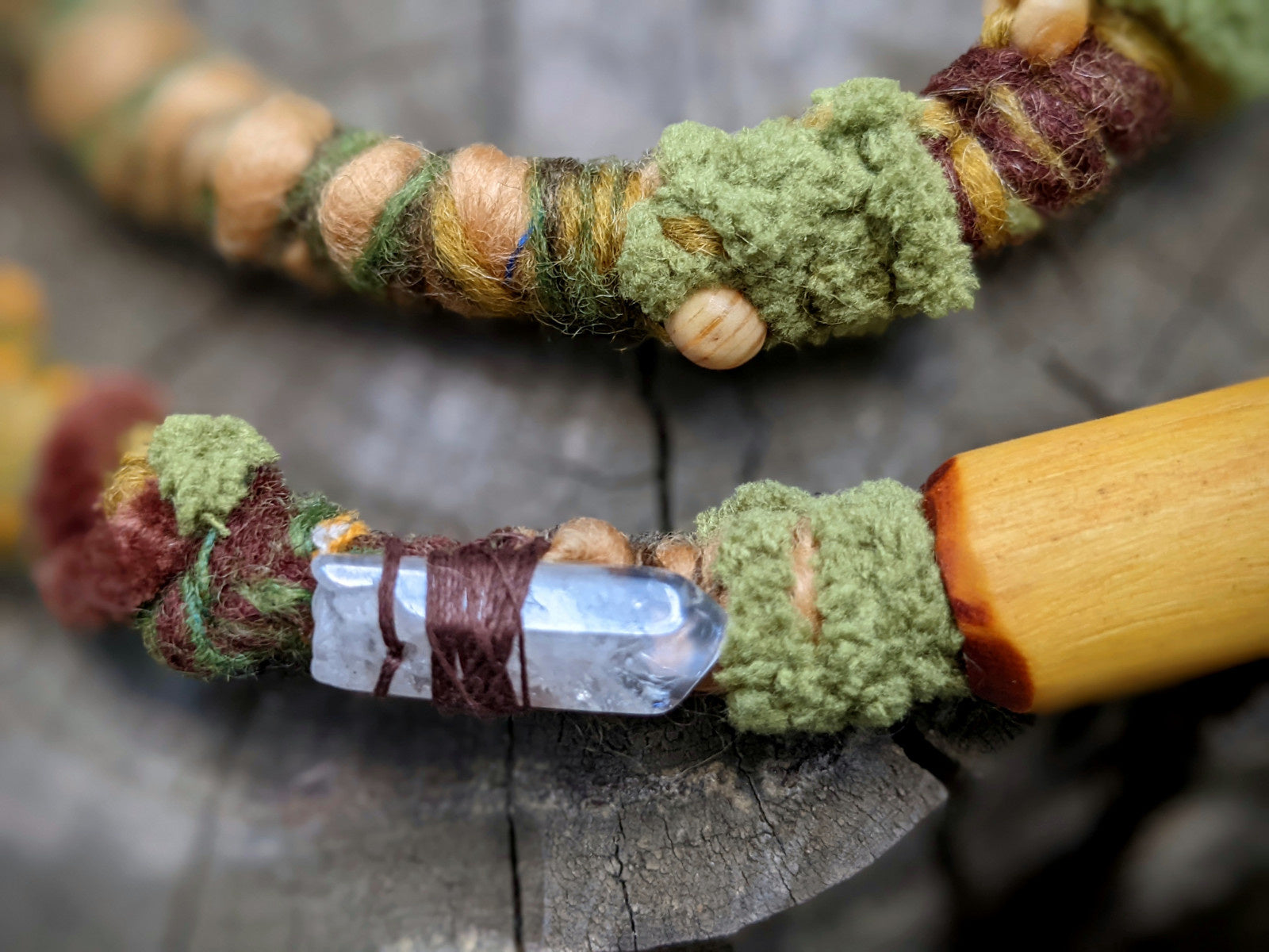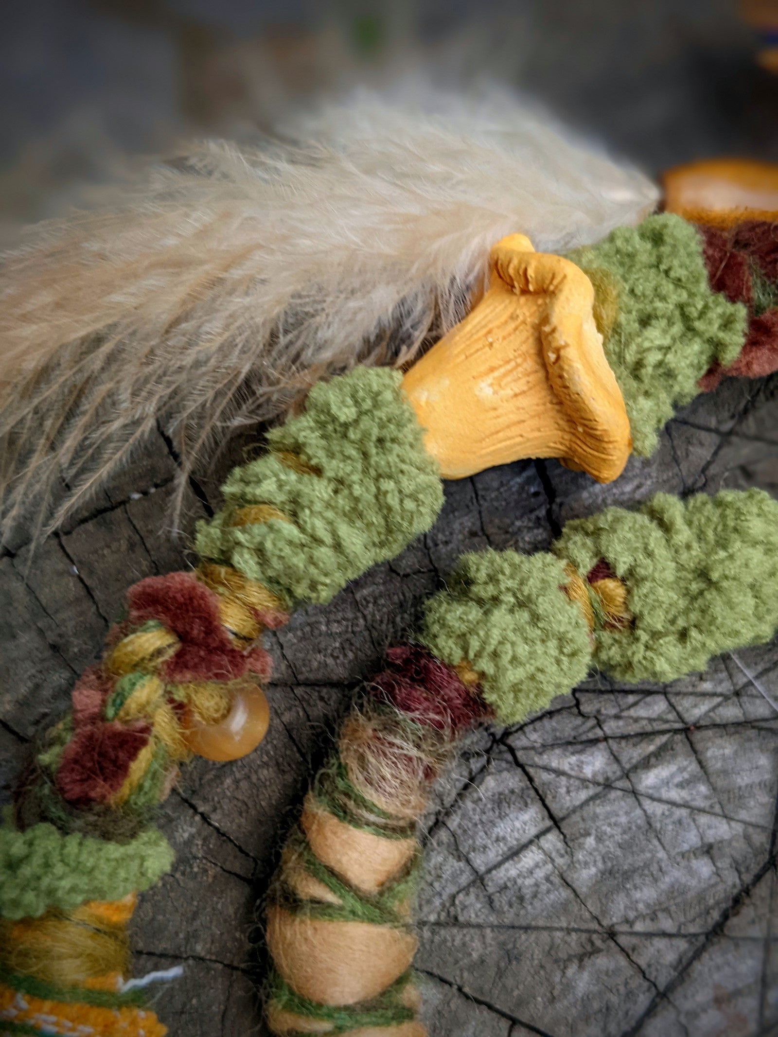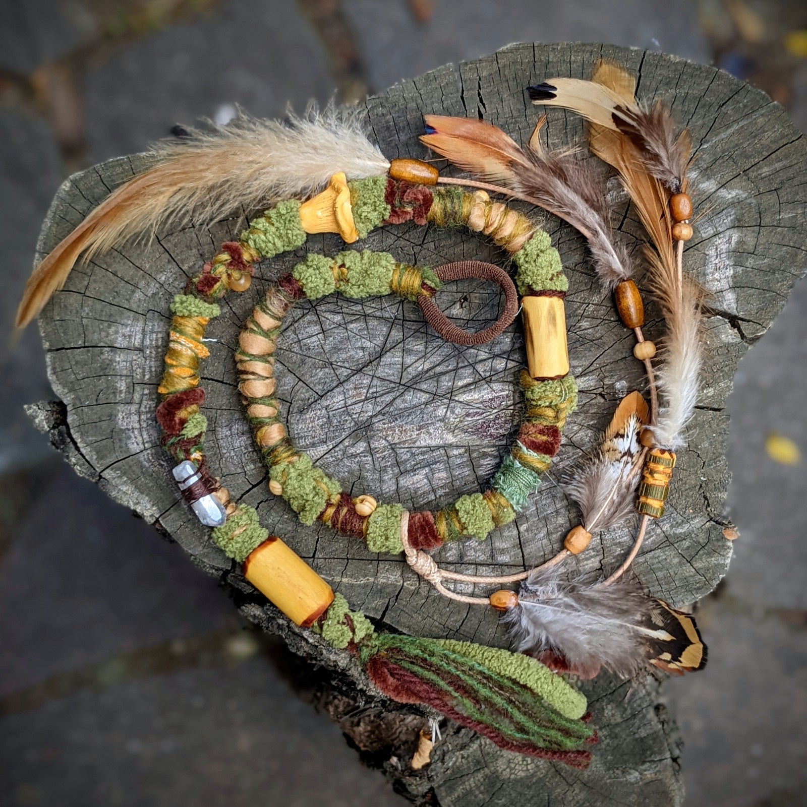 Decorative dread with moss texture made of yarn and recycled materials. Decorated with a ceramic sponge, crystal, wooden beads and a feather curtain that can be removed from the dread and used separately as a feather decoration for hair/dreads.