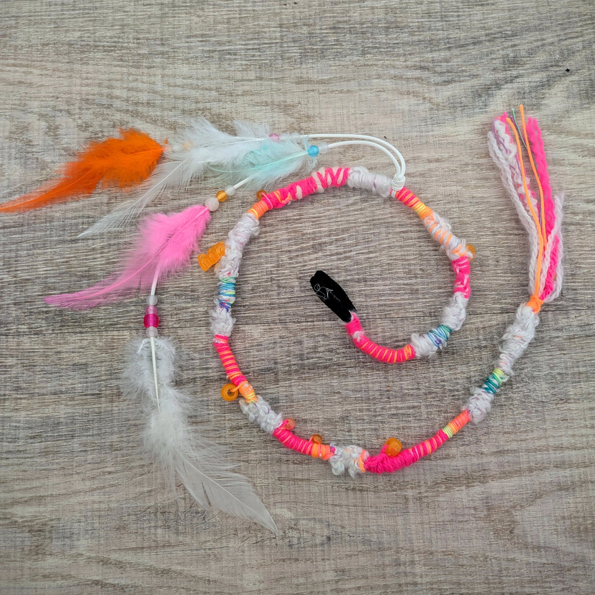 Decorative colored dread made from yarn and recycled materials. Decorated with beads and a gummy bear. The entire wrap and beads are UV active.