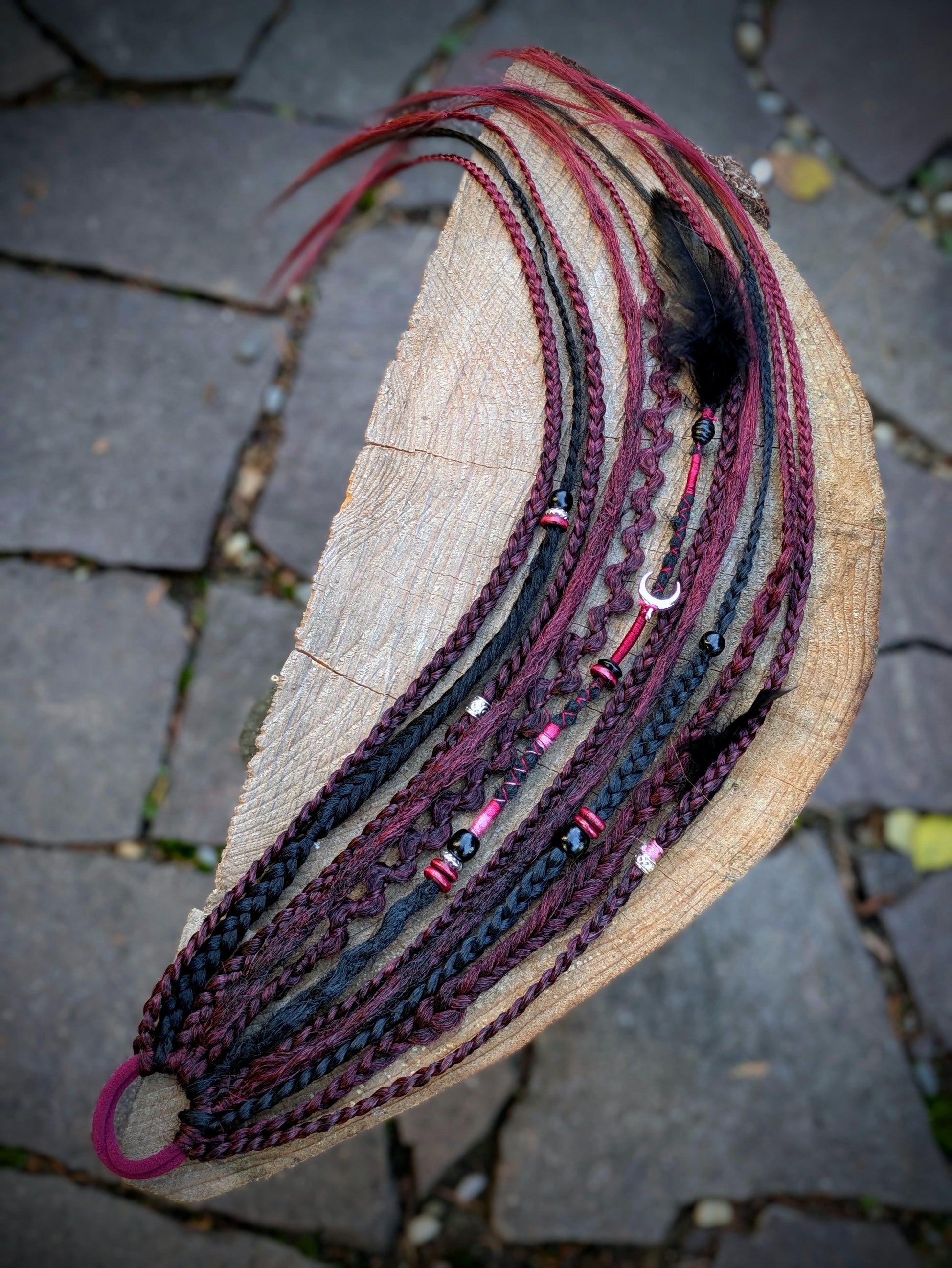 Beige elastic band with a total of 7 braids of different structures and 3 dreadlocks in a combination of pink and lilac. Decorated with metal beads, cotton and feathers.
