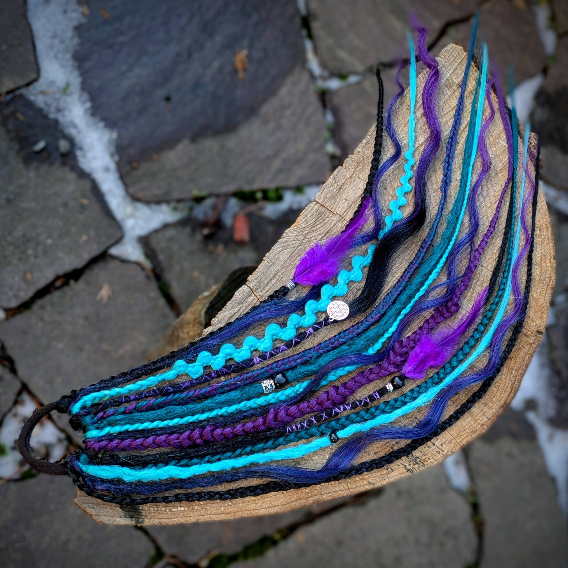 Beige elastic band with a total of 7 braids of different structures and 3 dreadlocks in a combination of pink and lilac. Decorated with metal beads, cotton and feathers.