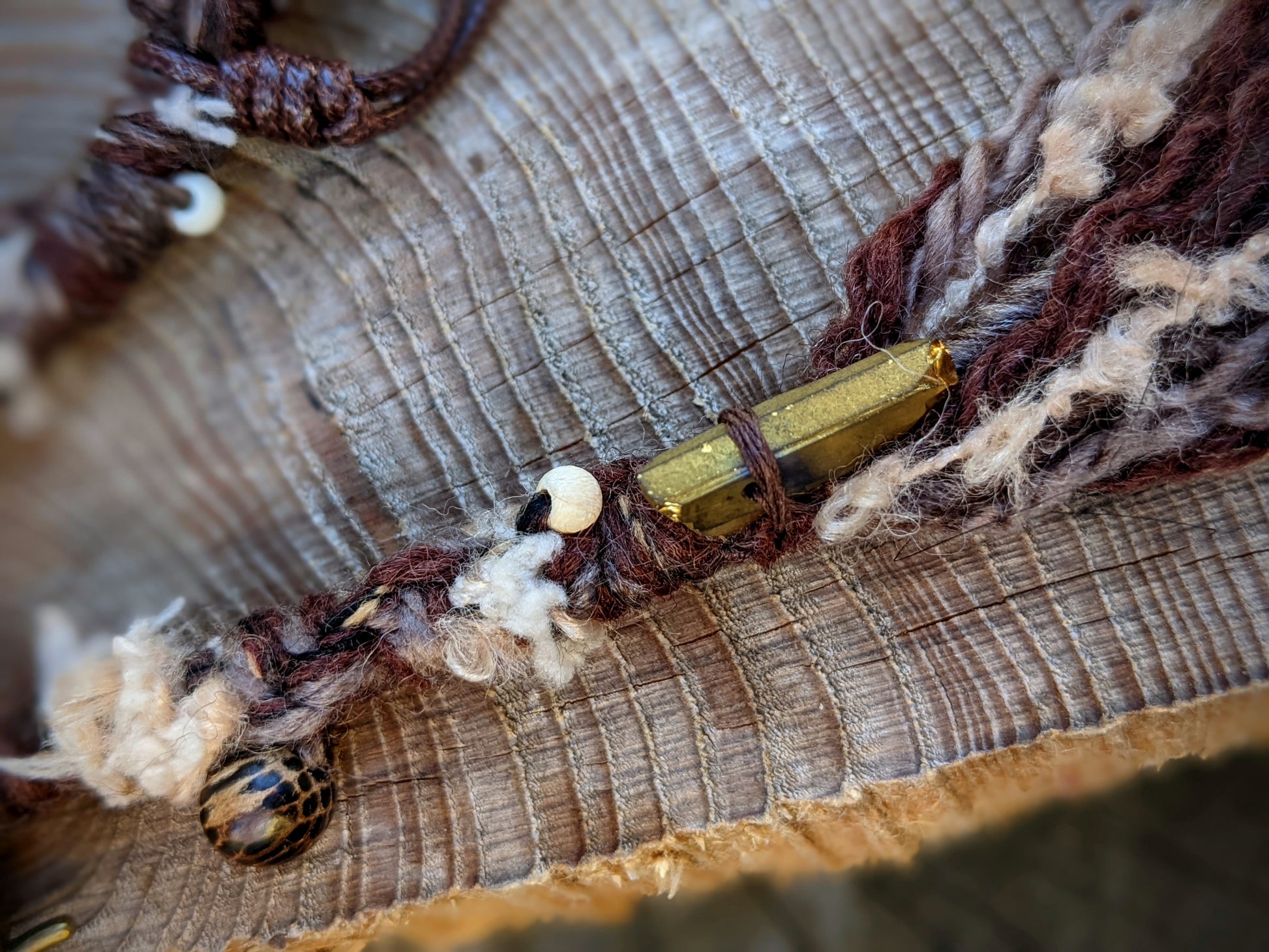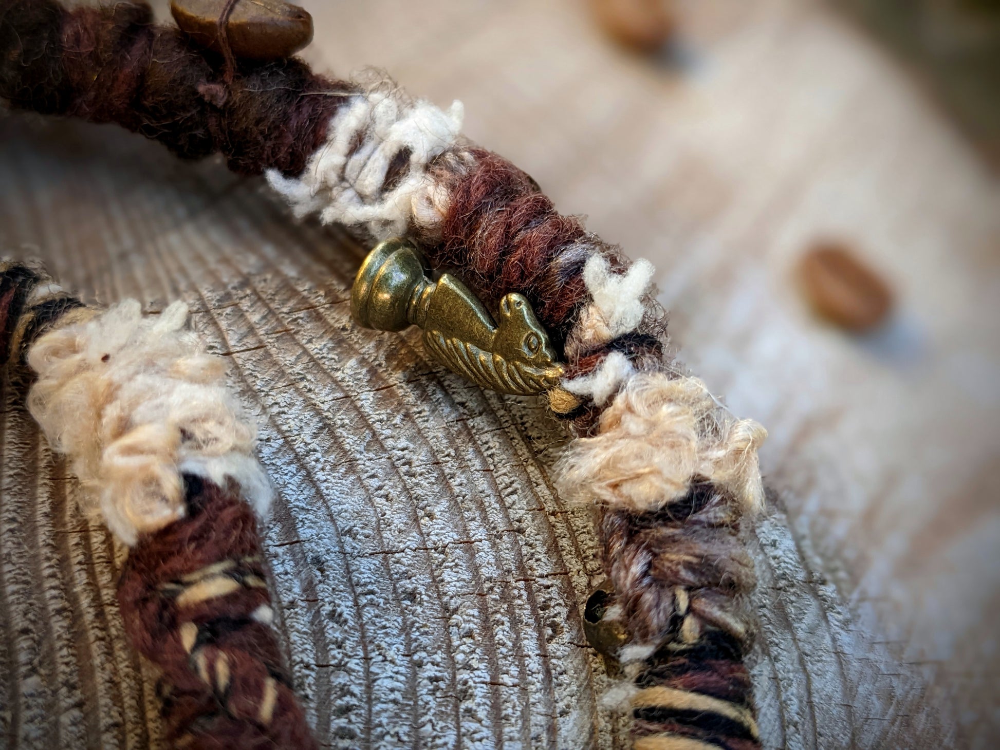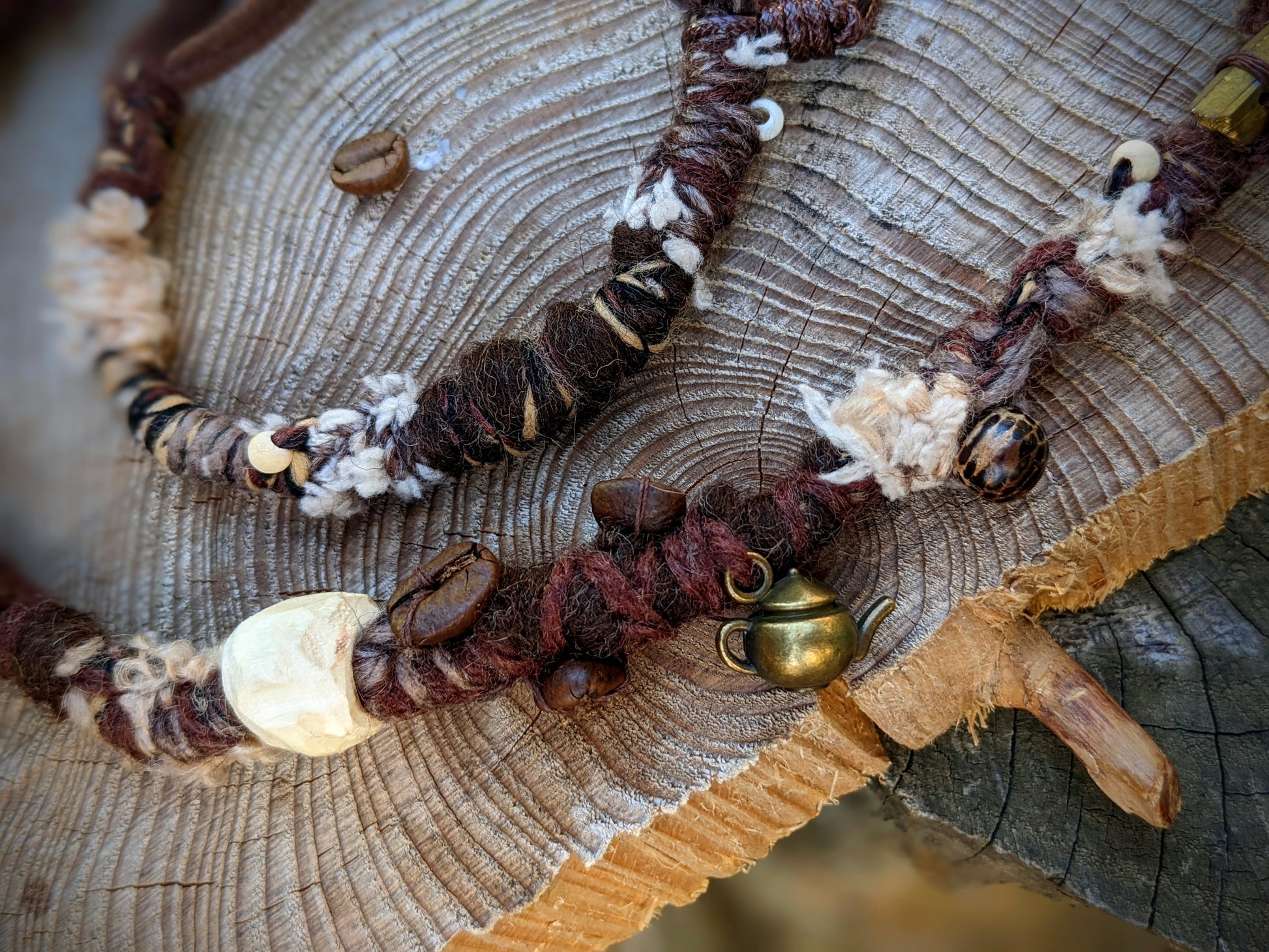 Decorative dreadlock from the coffee collection made of yarn and recycled fabrics. Decorated with coffee beans and wooden and brass beads. Also on the wrap you will find several metal pendants including a small teapot. It includes a feather pendant that can be removed from the dreadlock and used separately as a feather decoration for hair/dreads.