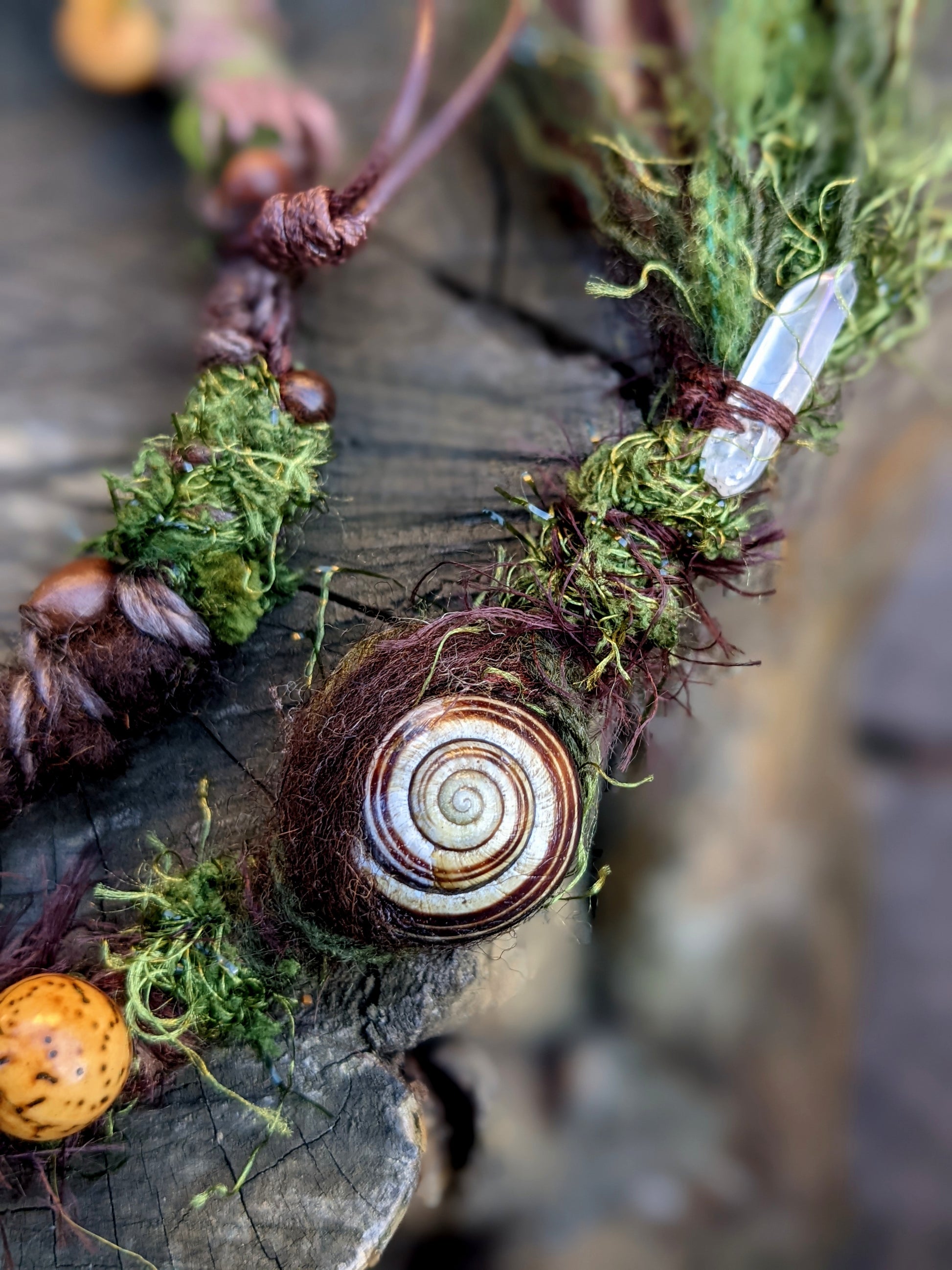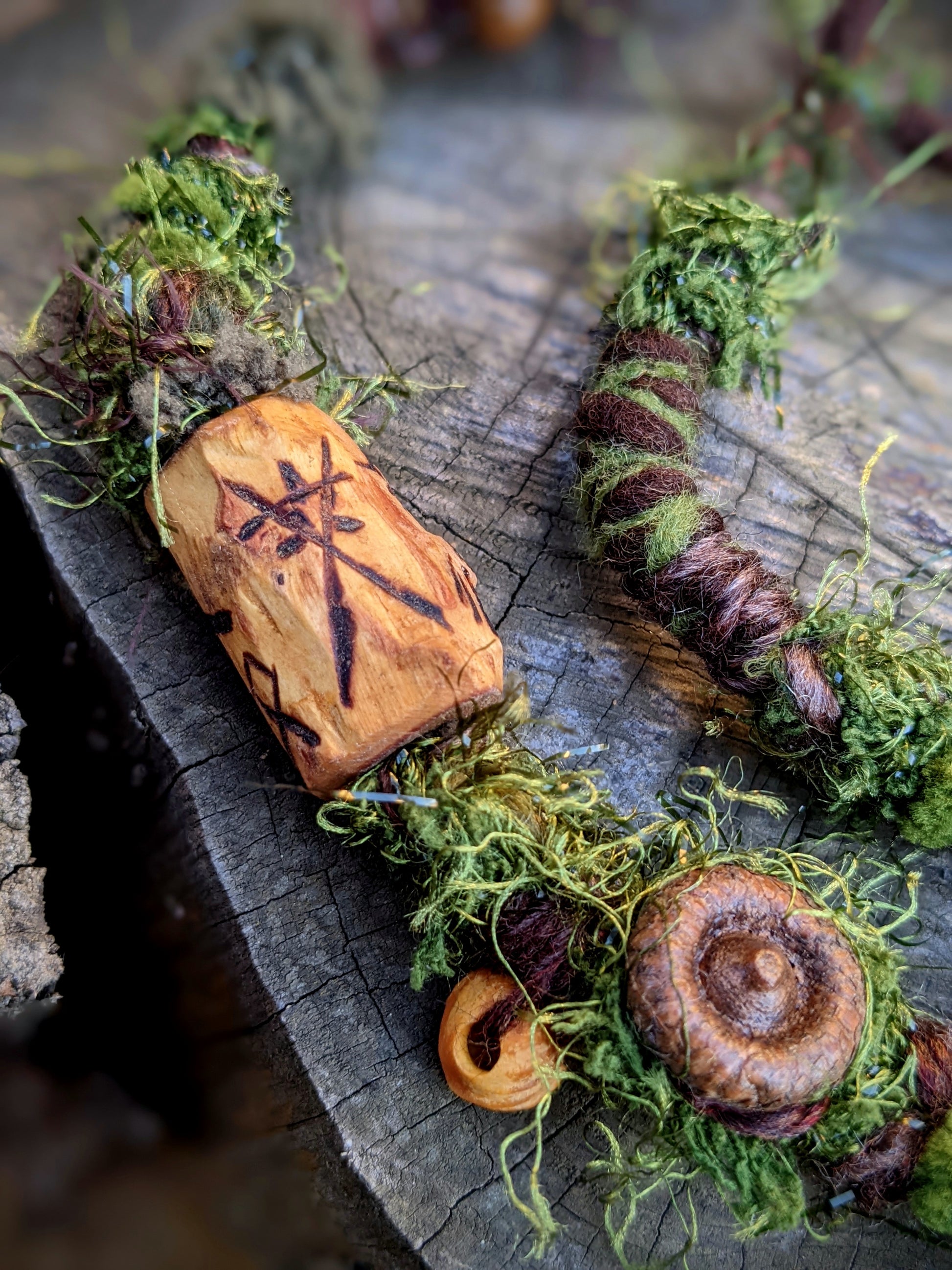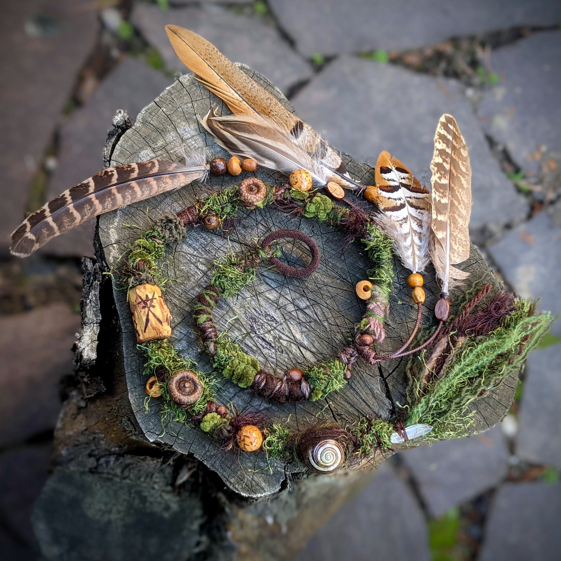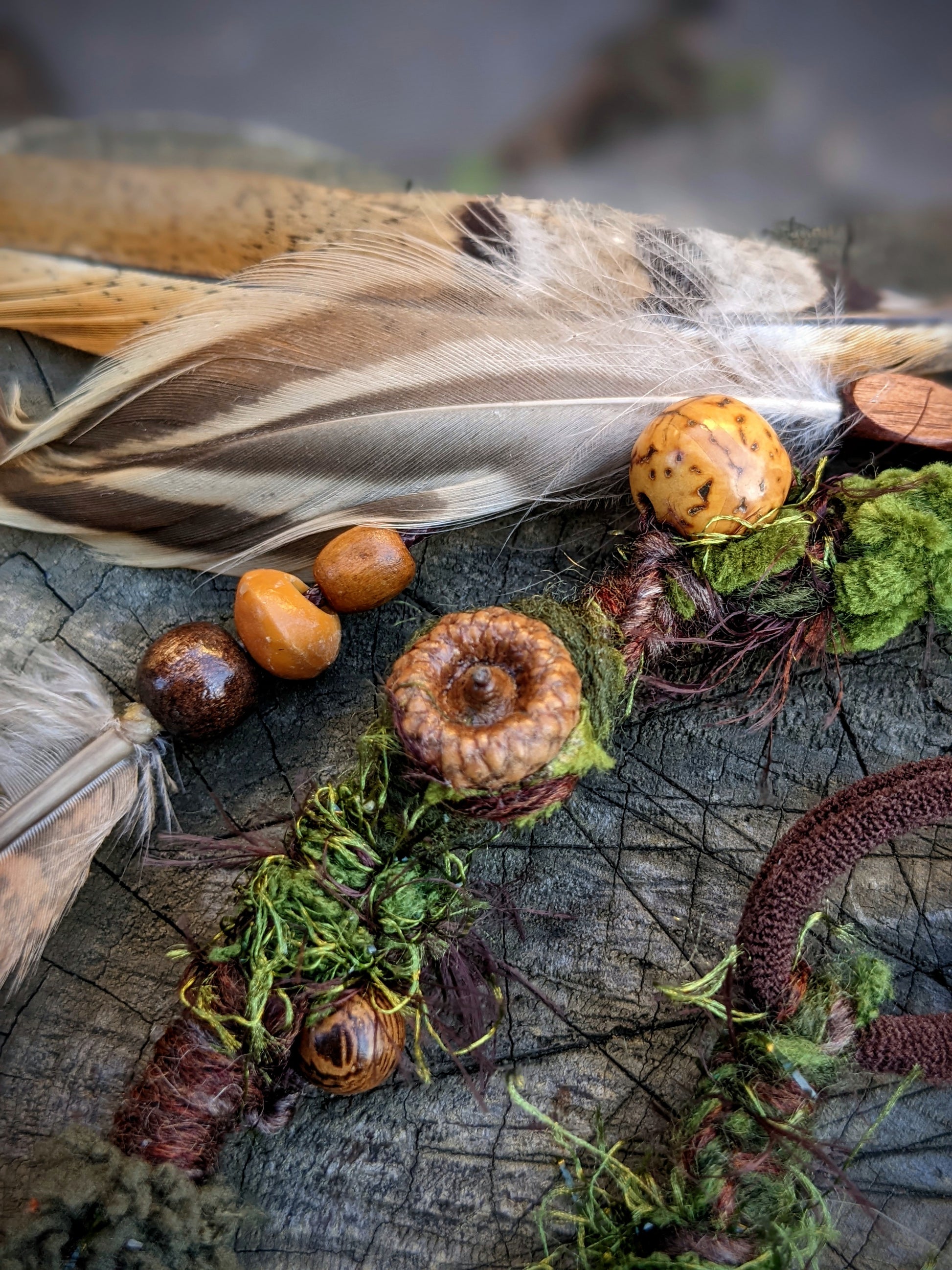 Decorative dreadlock with a mossy texture made of yarn, sheep's wool and recycled fabrics. Decorated with acorns, acorns, shells, wooden beads, seed beads, crystal, fired wooden bead and feather pendant, which can be removed from the dreadlock and used separately as a feather hair ornament/dreadlocks.