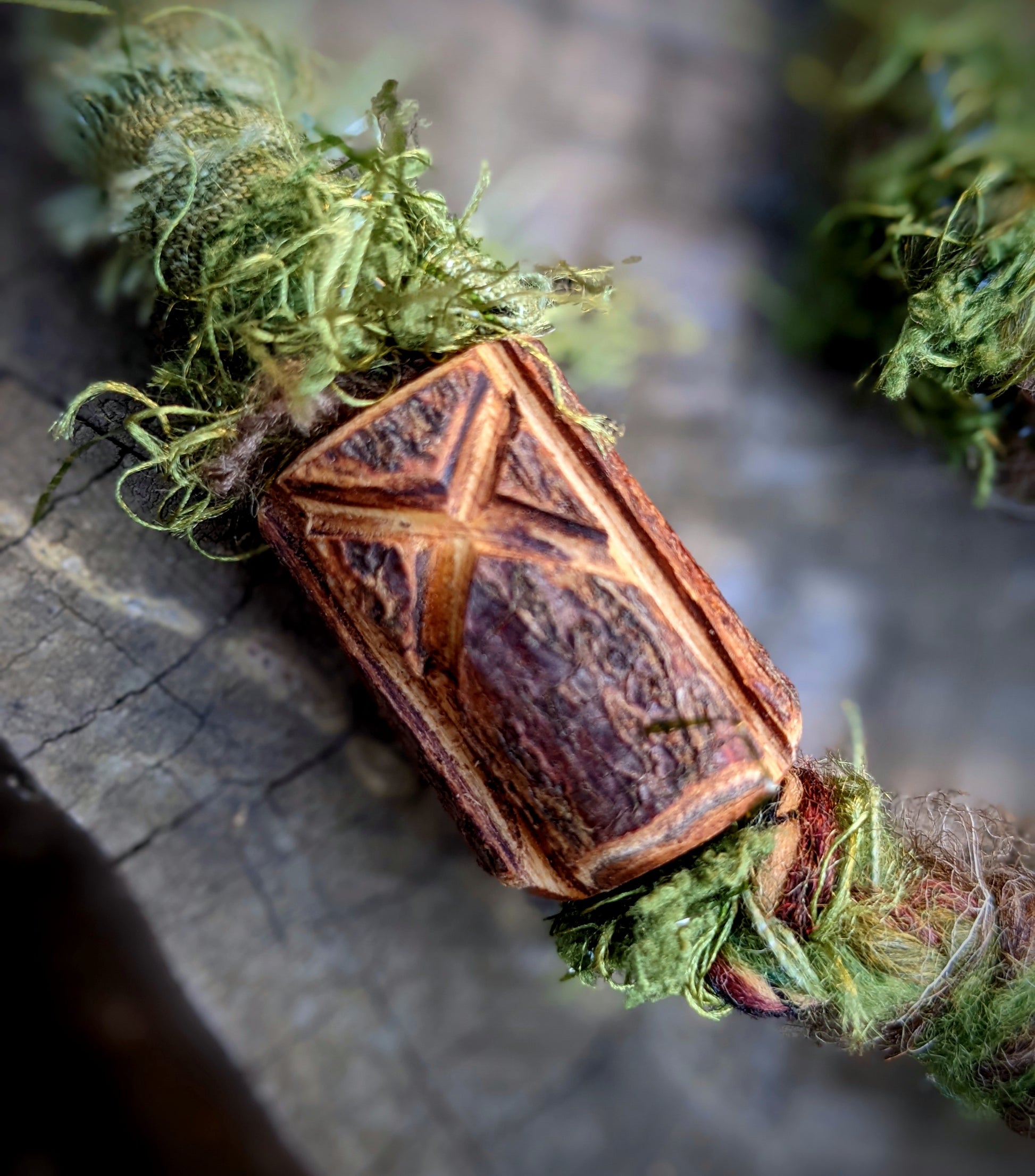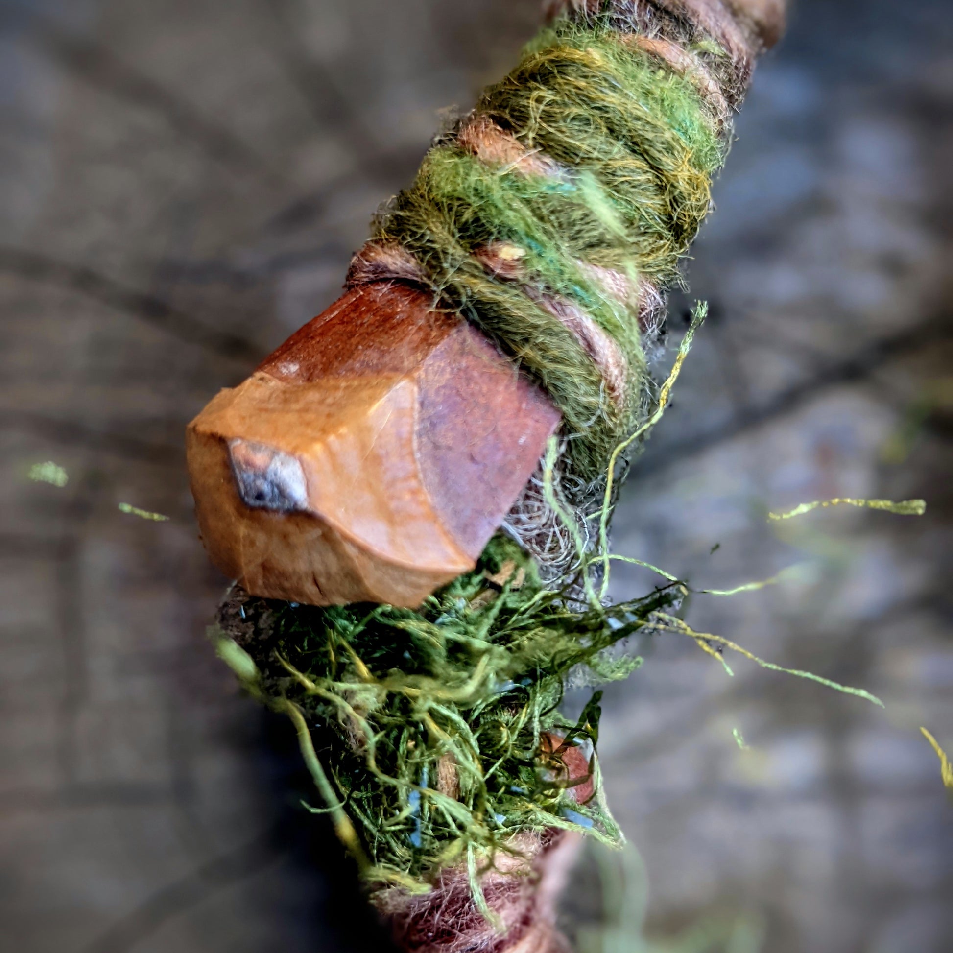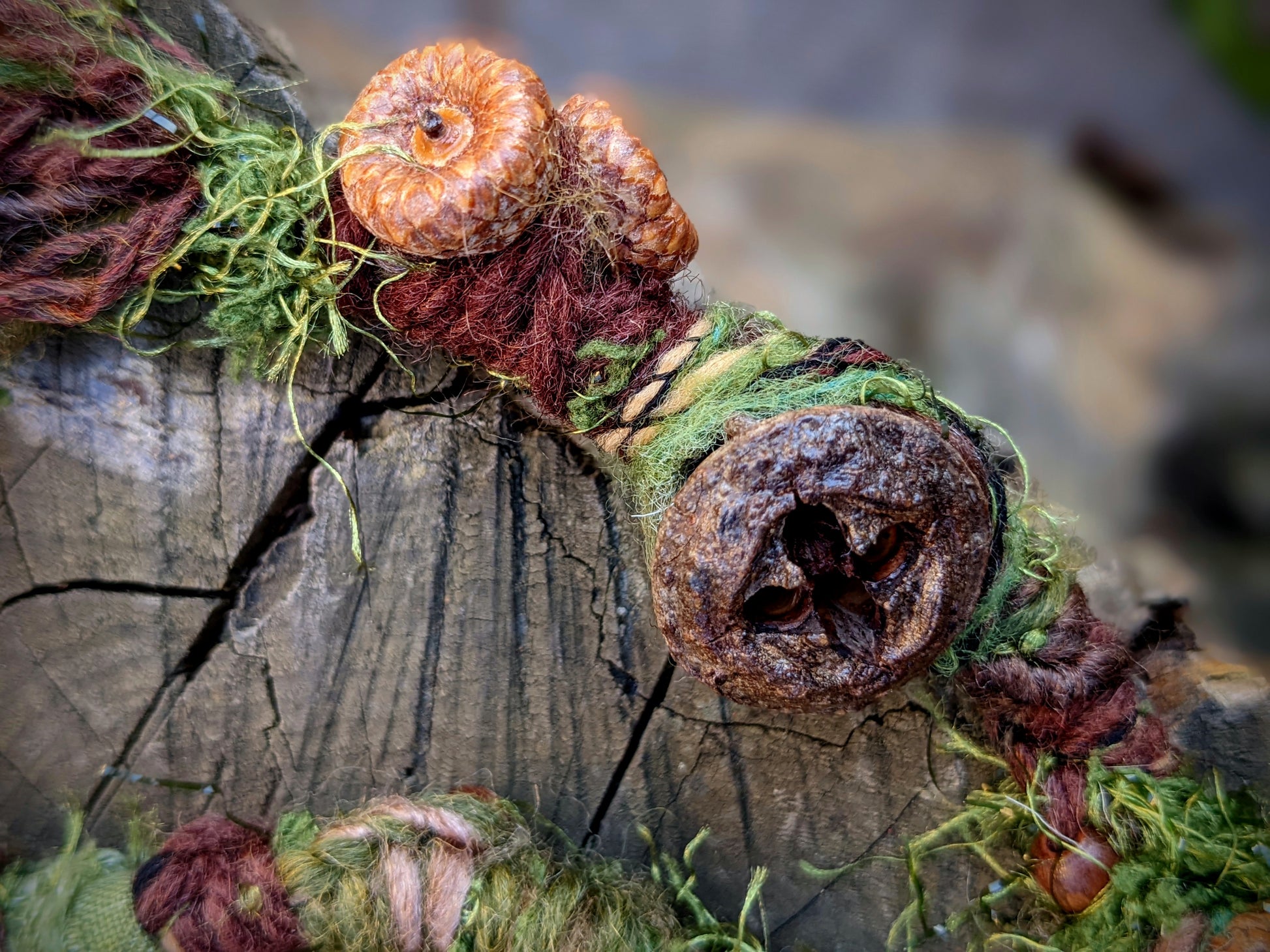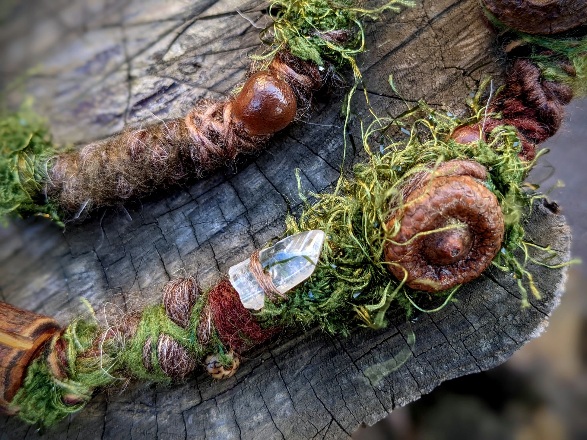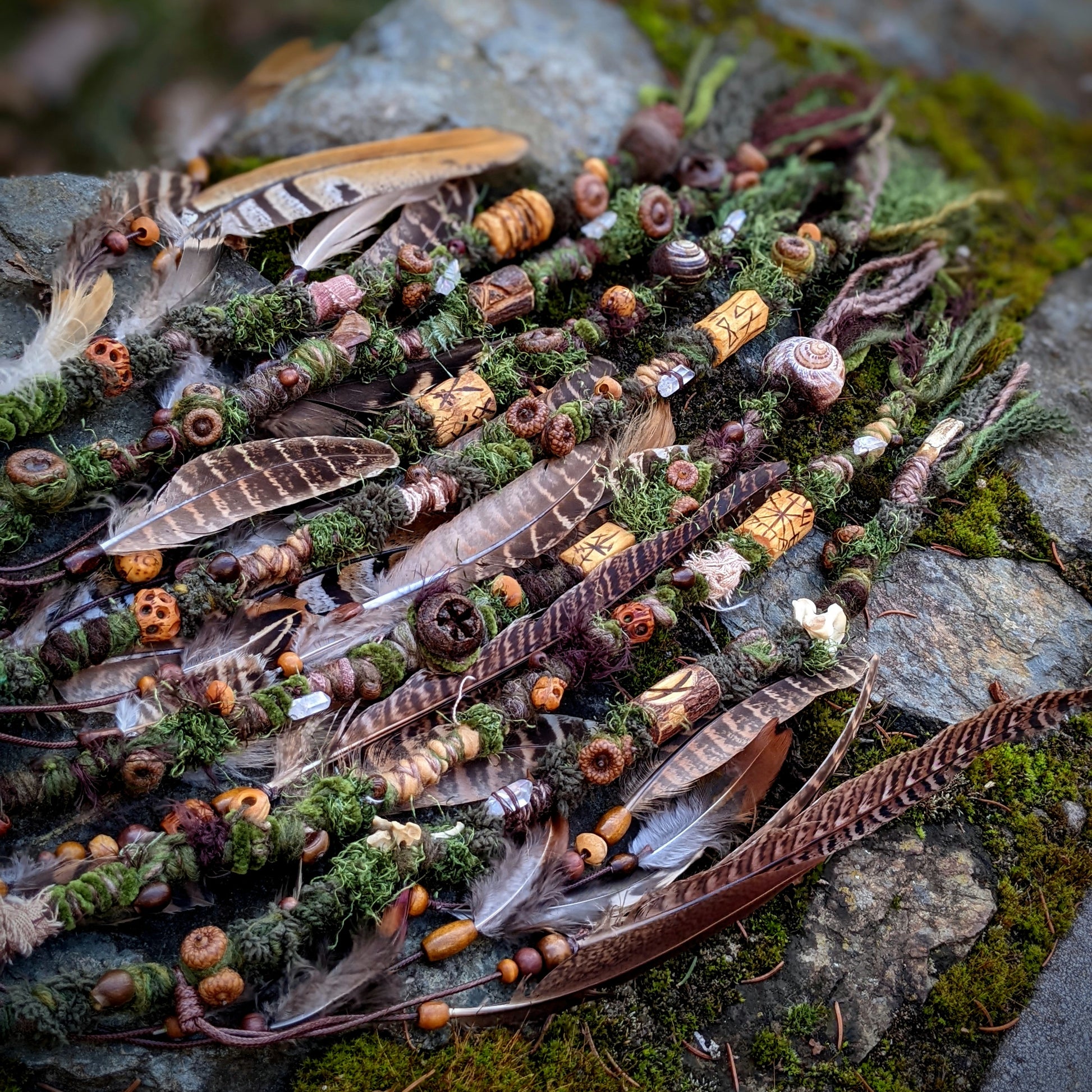 Decorative dreadlock with a mossy texture made of yarn, sheep's wool and recycled fabrics. Decorated with acorns, acorns, pinecone chips, wooden beads, seed beads, crystal, fired wooden bead and feather pendant, which can be removed from the dreadlock and used separately as a feather decoration for hair/dreads.