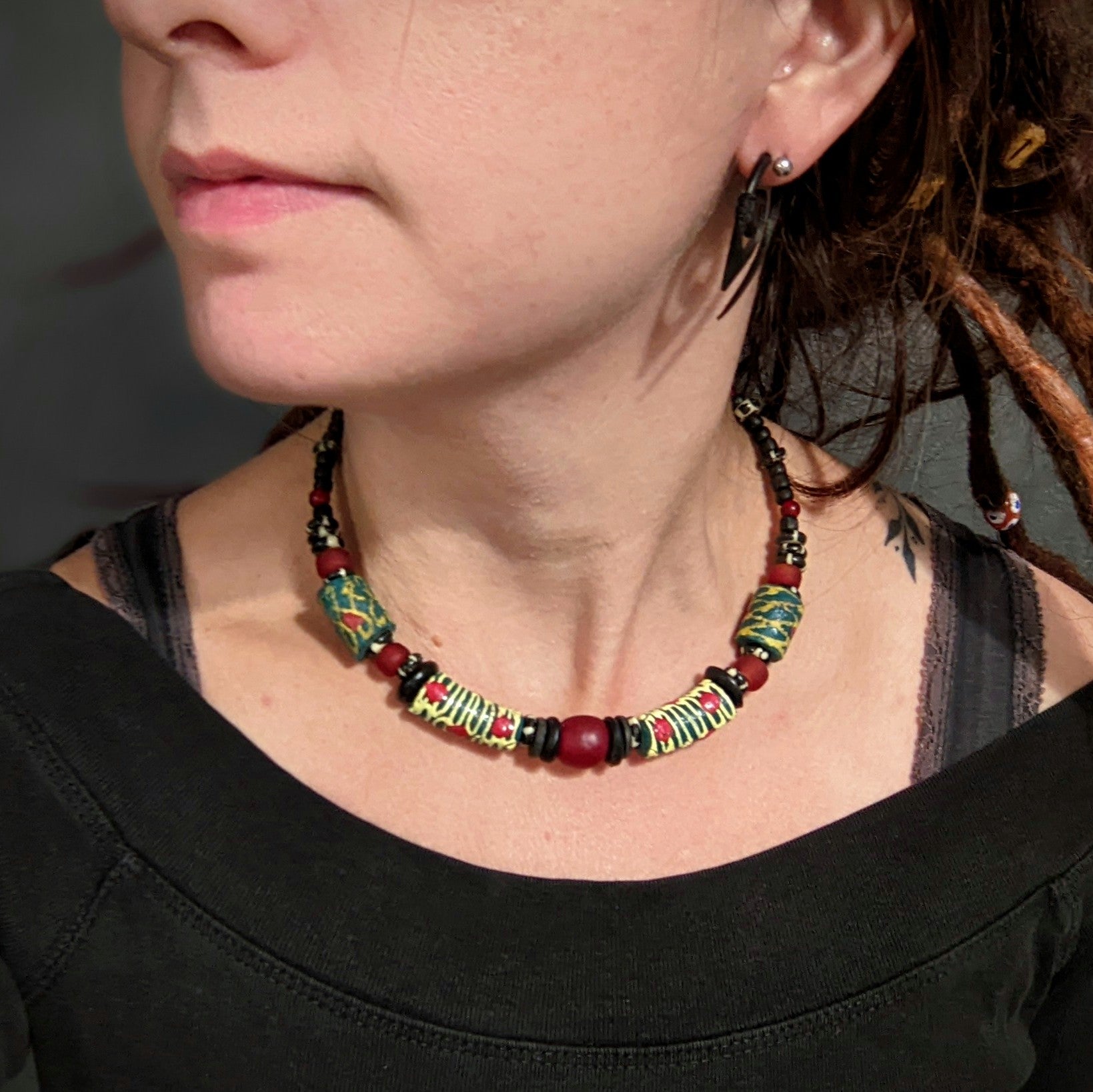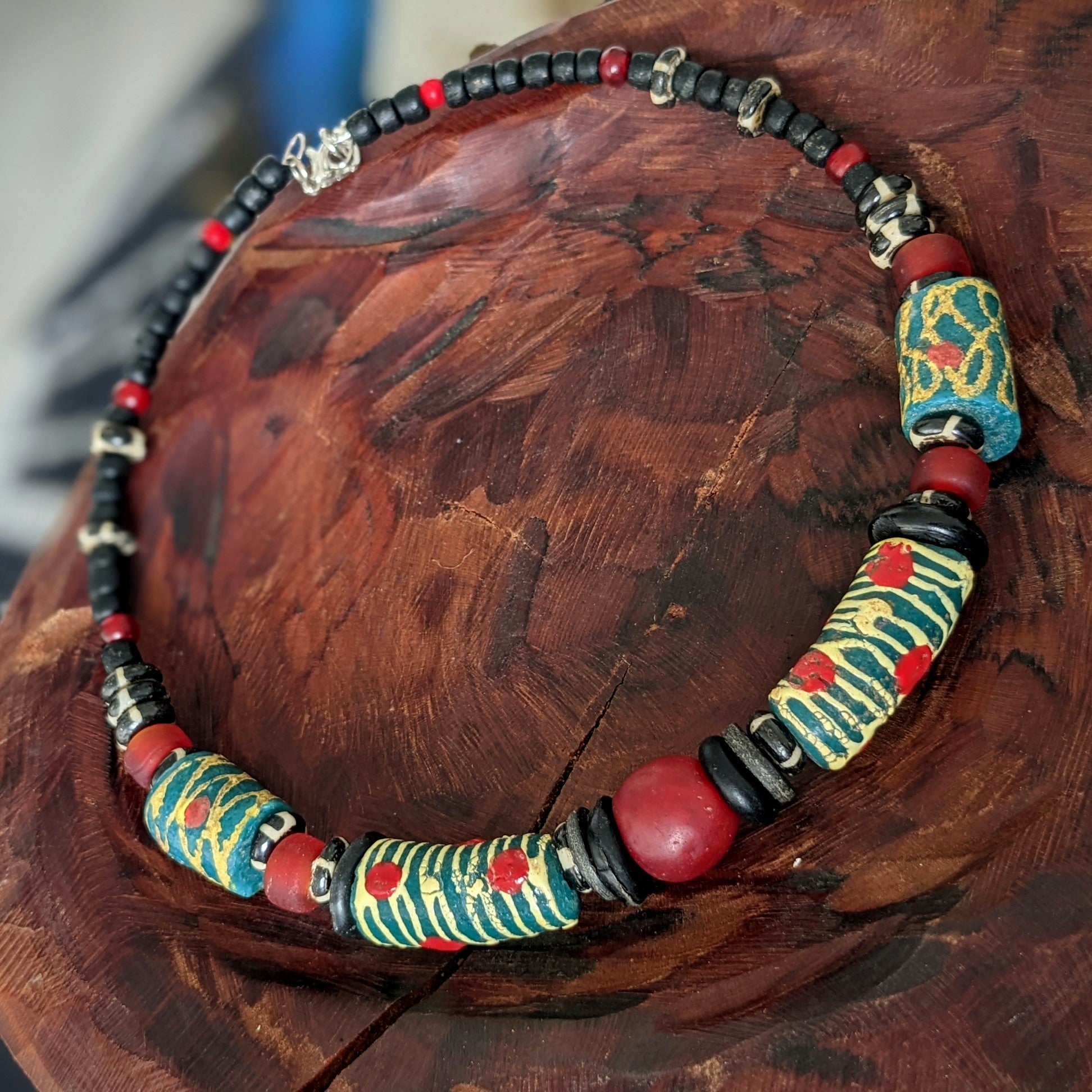 The necklace is made of original African "krobo" beads made of recycled glass, traditionally made in Ghana, which are complemented by wooden, bone and coconut beads. Threaded on a 12 cm diameter hoop, which is designed for a neck circumference of 30-35 cm - can be regulated with a carabiner and chain. The chain and carabiner are made of costume jewelry metal.