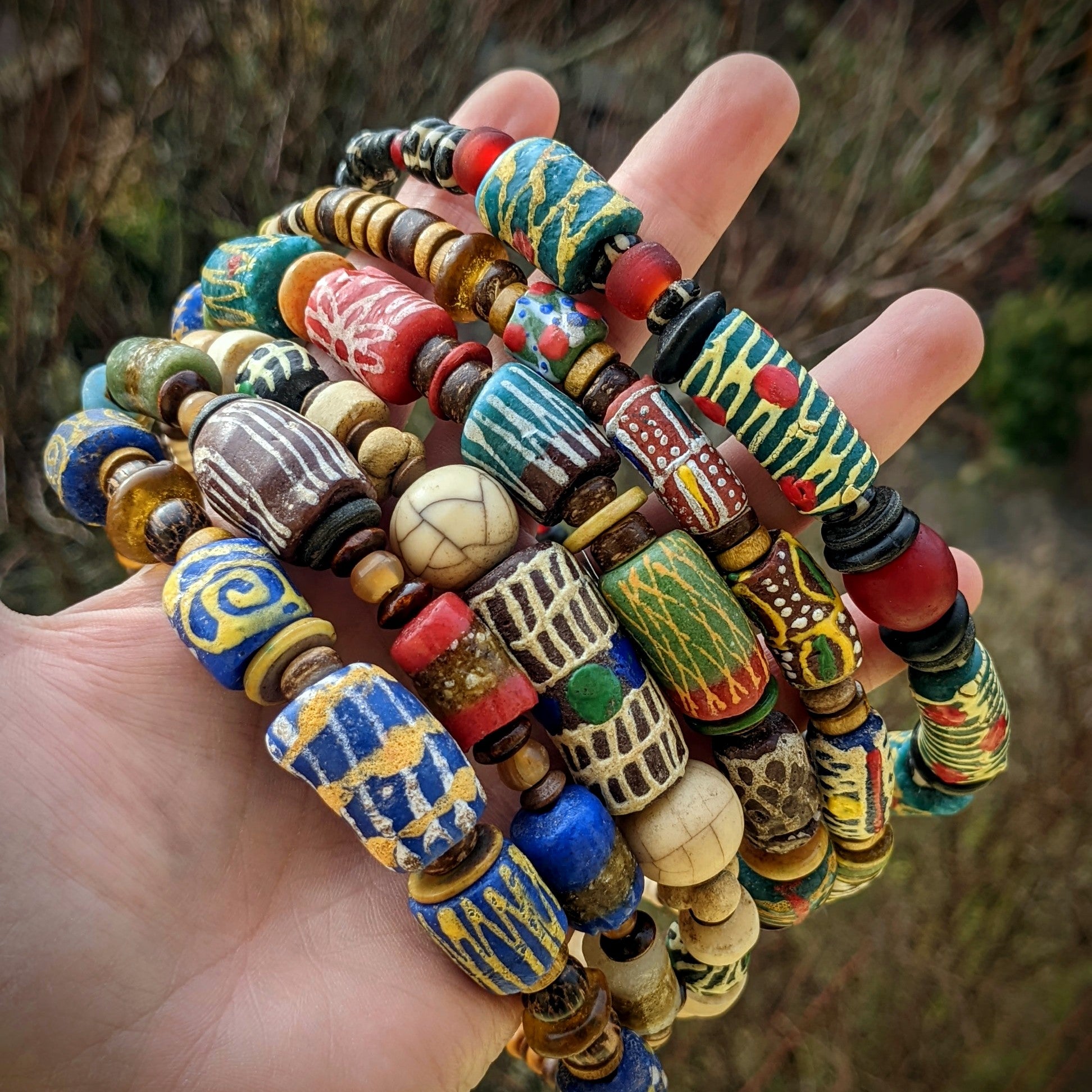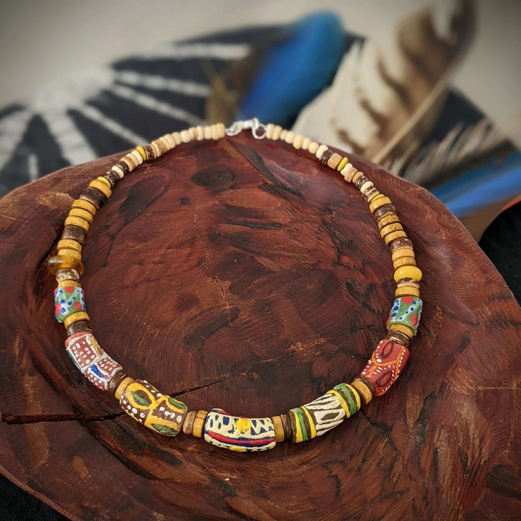 The necklace is made of original African "krobo" beads made of recycled glass, traditionally made in Ghana, which are complemented by wooden, bone and coconut beads. Threaded on a 12 cm diameter hoop, which is designed for a neck circumference of 30-35 cm - can be regulated with a carabiner and chain. The chain and carabiner are made of costume jewelry metal.