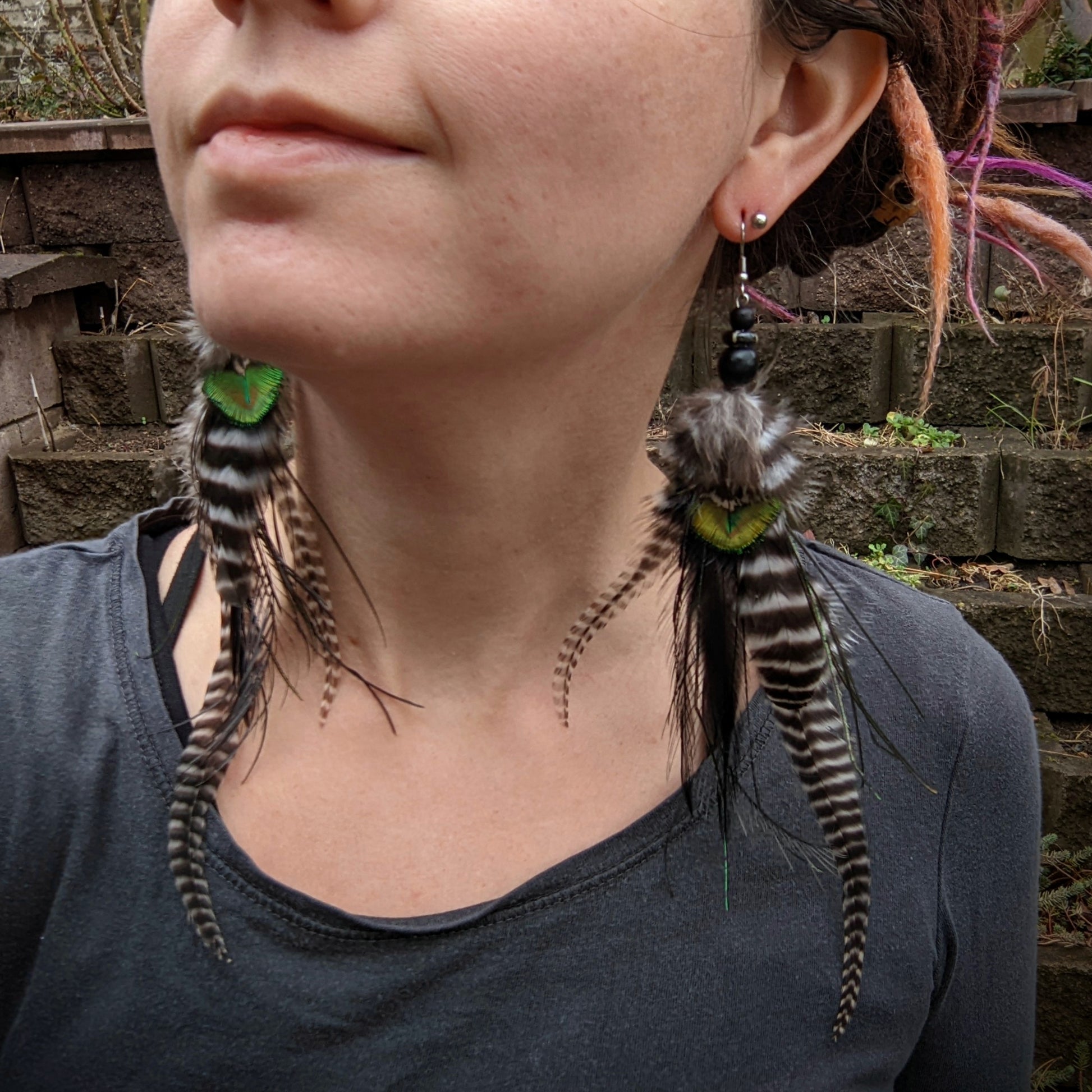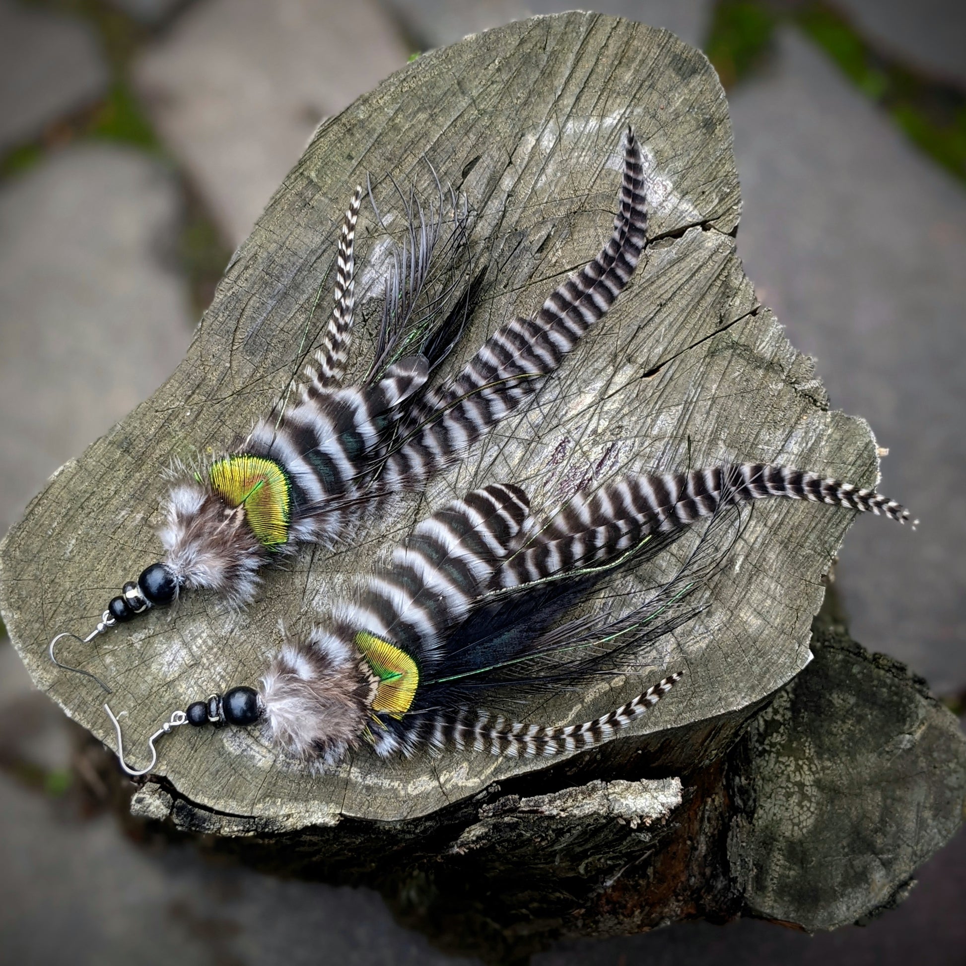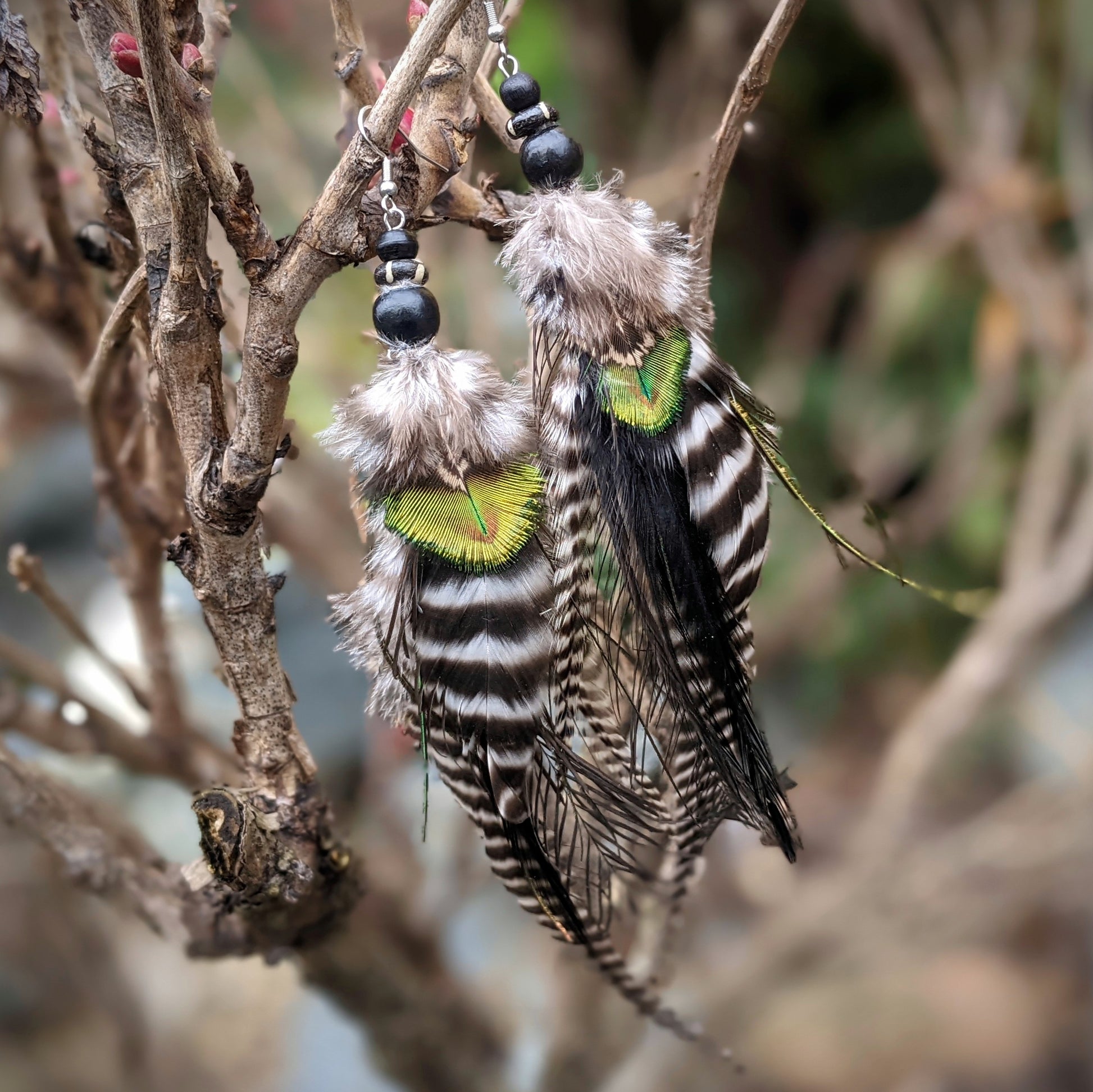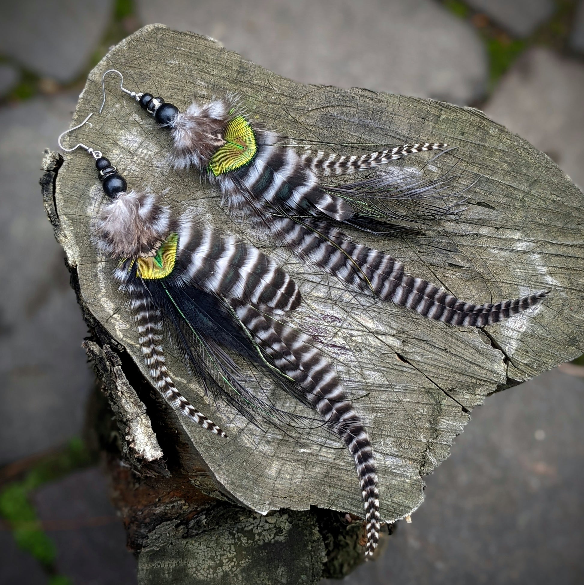 Distinctive long feather earrings (peacock, rooster, emu) complemented by wooden and bone beads . Hooks are made of surgical steel, supplied with silicone stoppers. The length of the decorative part of the earrings is approximately 20 cm.