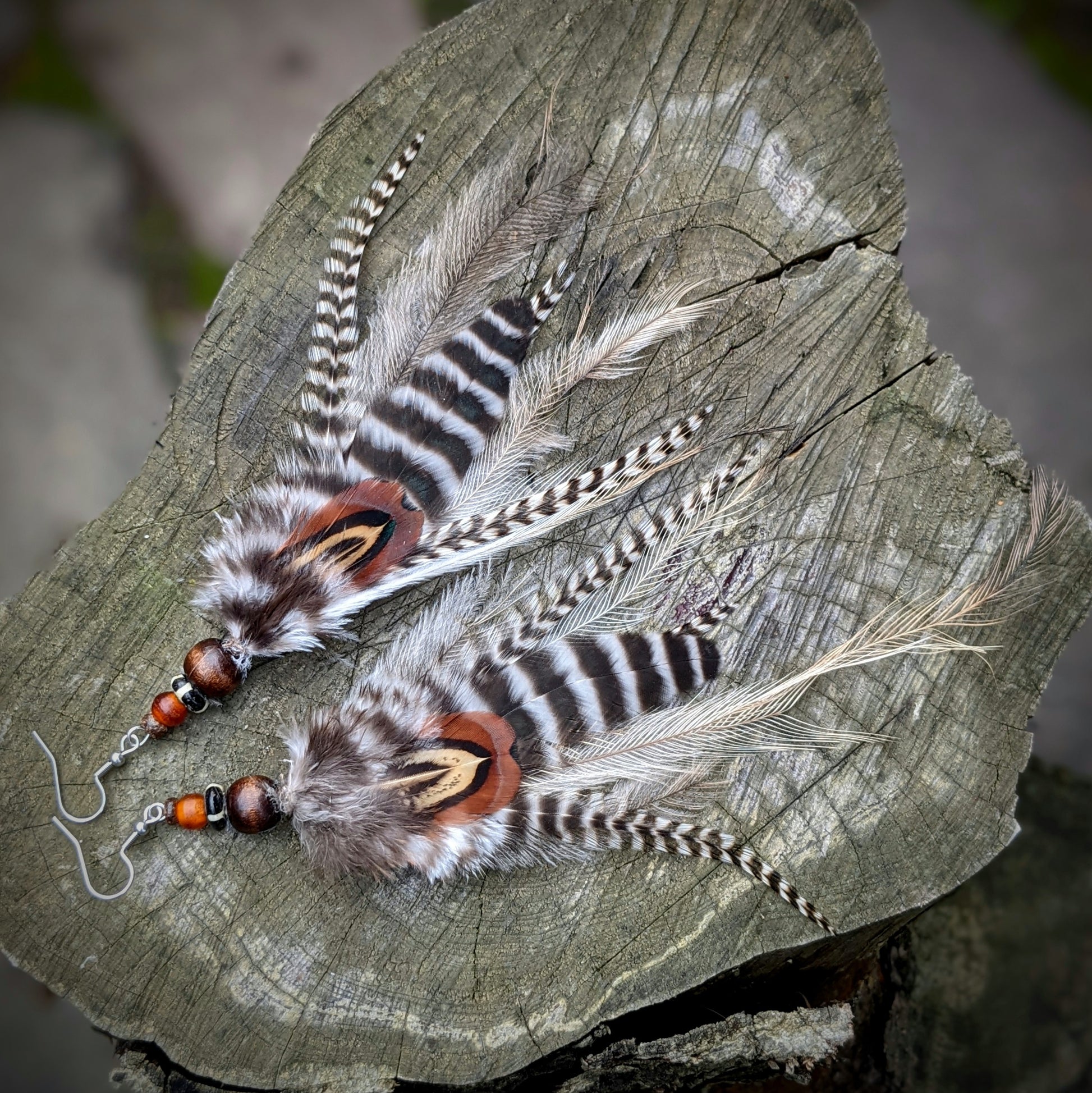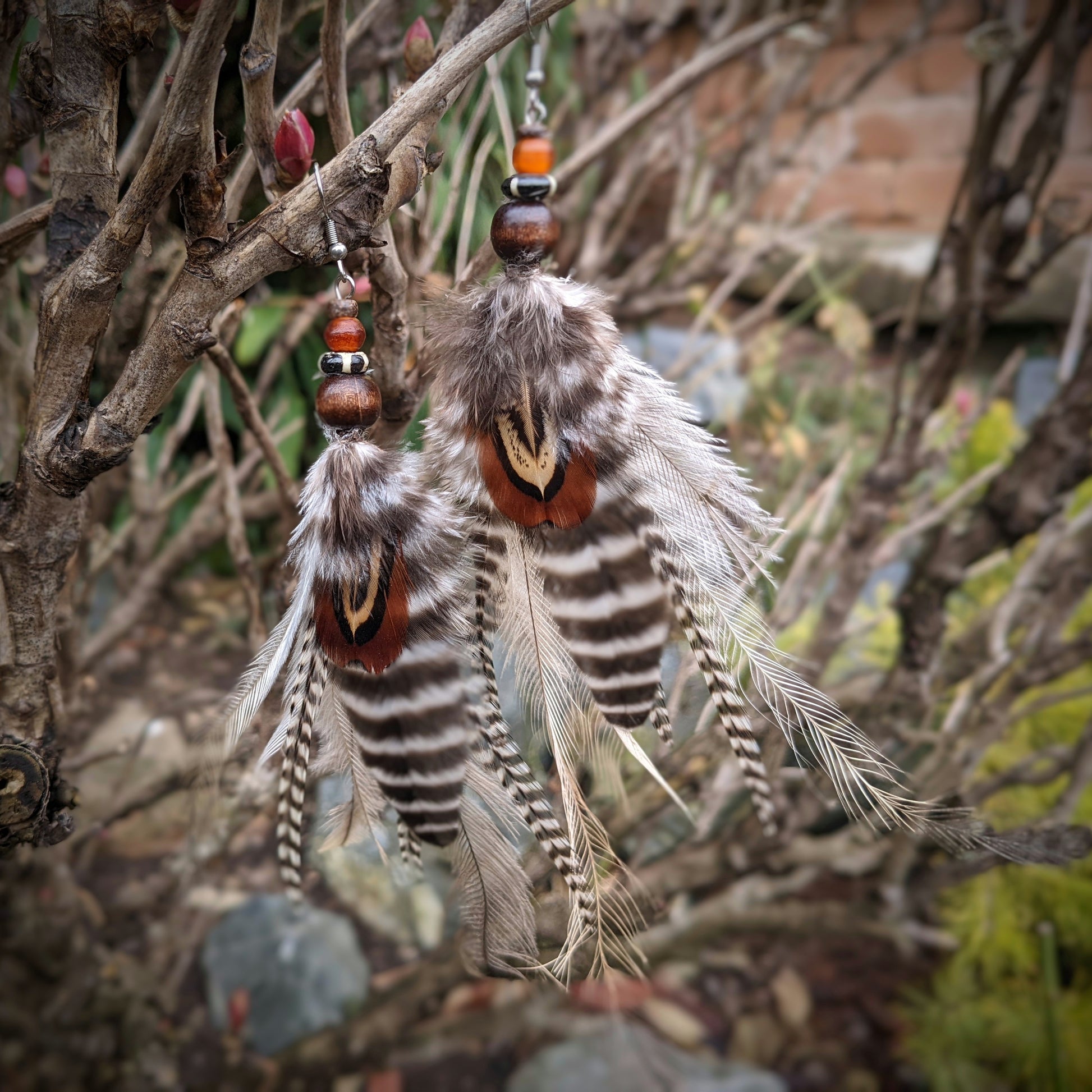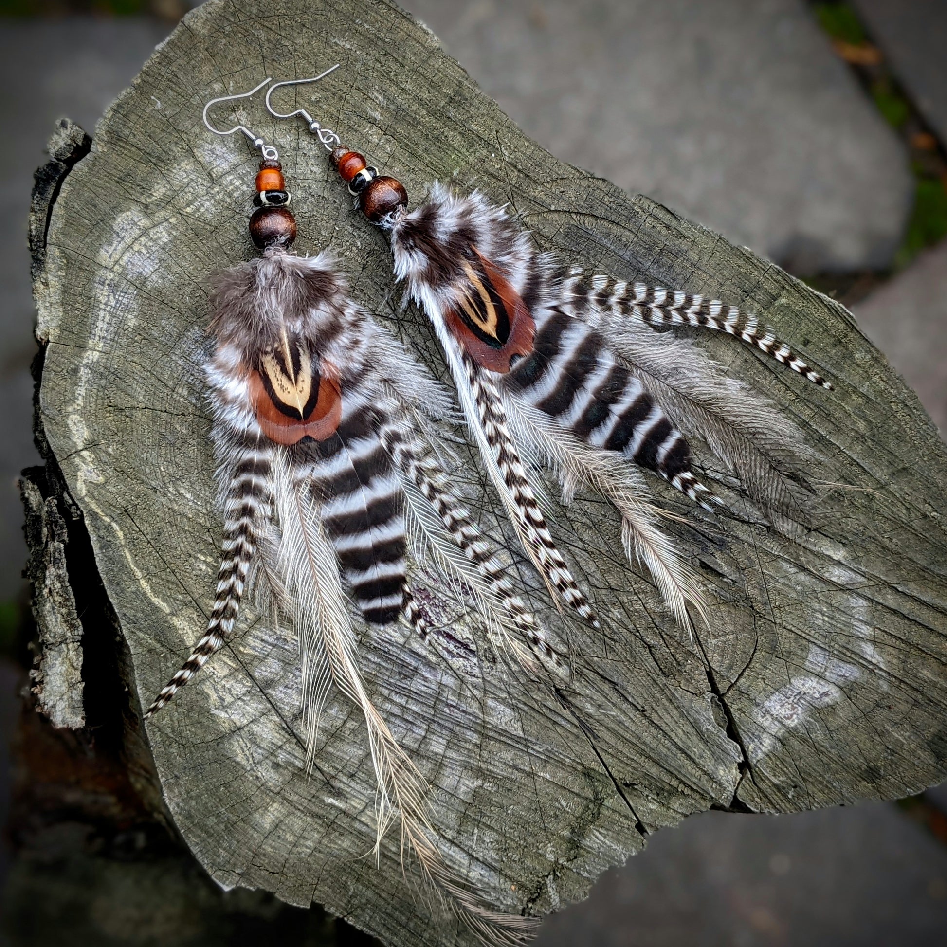 Distinctive feather earrings (pheasant, rooster, emu...) complemented by wooden and bone beads. Hooks are made of surgical steel, supplied with silicone stoppers. The length of the decorative part of the earrings is up to 20 cm.