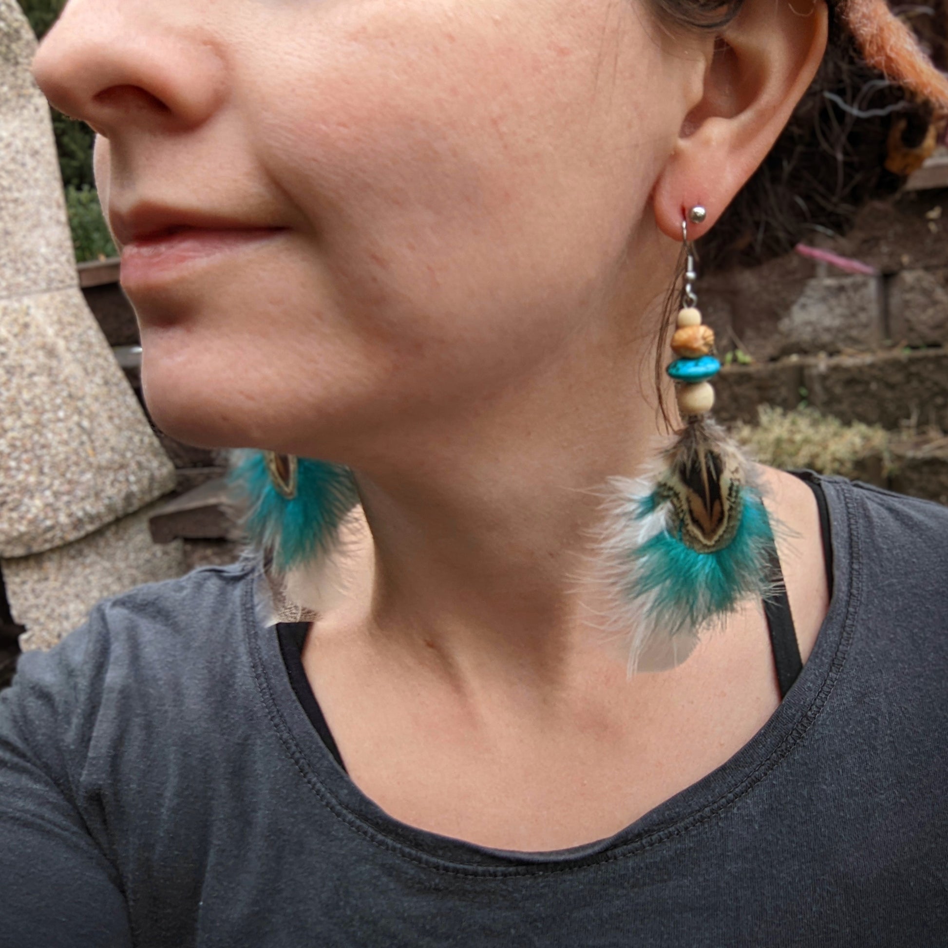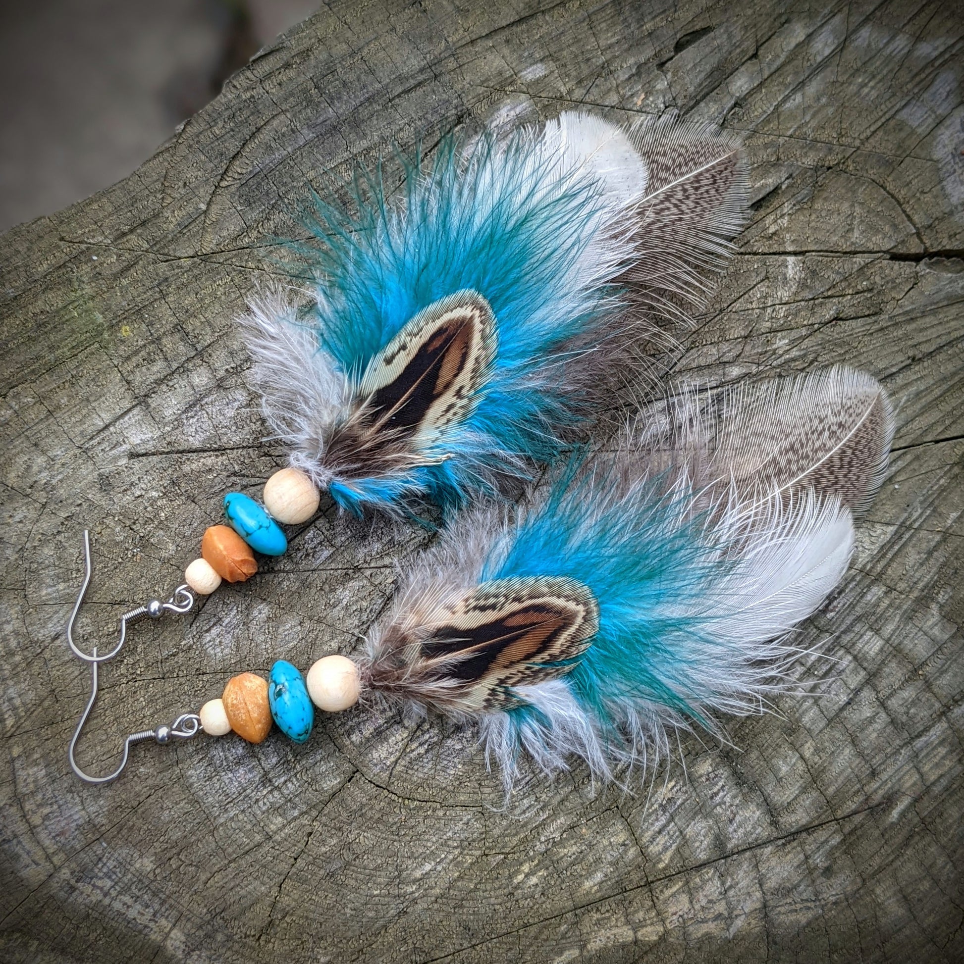 Light feather fairy earrings with colorful feathers, complemented by wooden, cherry and turquoise beads . Hooks are made of surgical steel, supplied with silicone stoppers. The length of the decorative part of the earrings is approximately 11 cm.