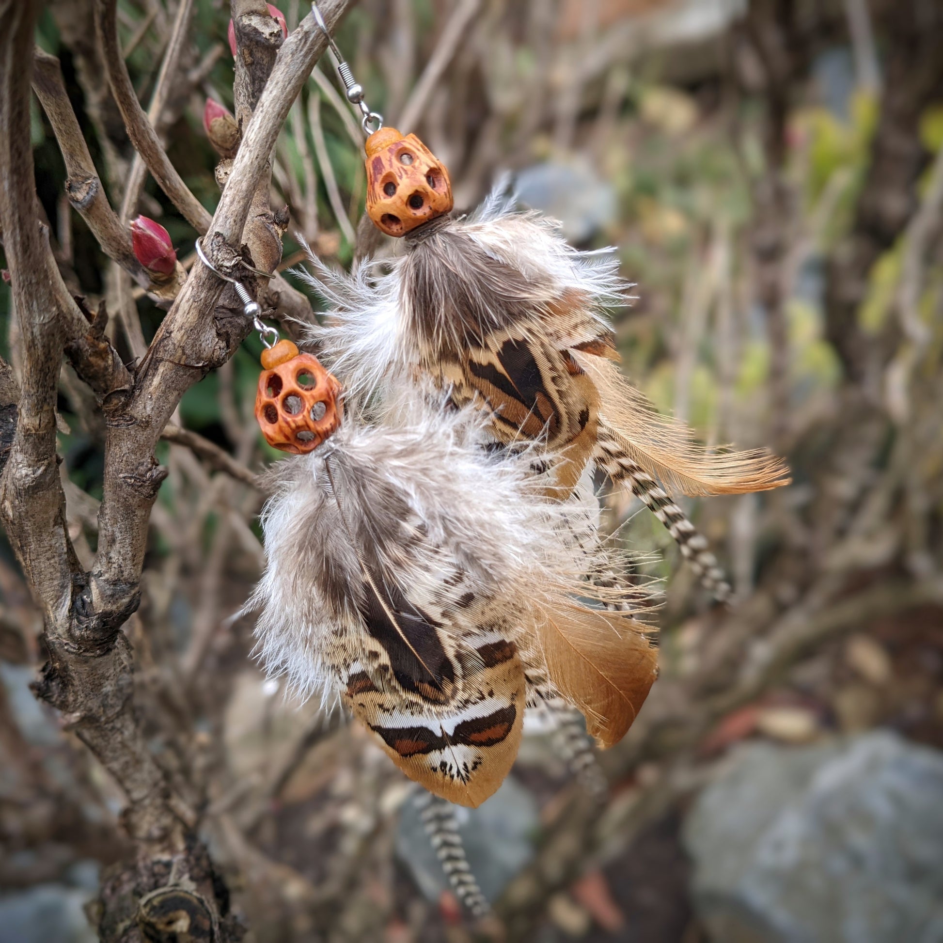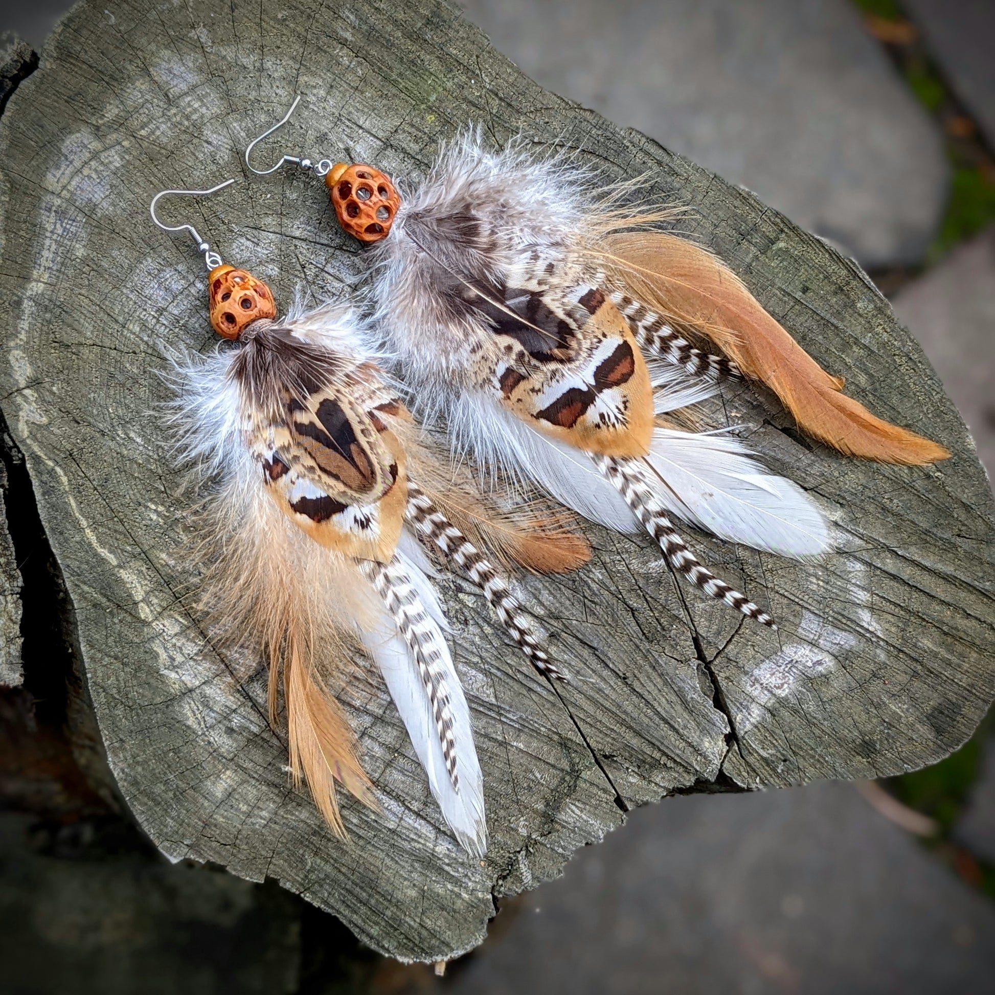 Distinctive feather earrings (pheasant, rooster...) complemented by wooden beads and original Turkish hazel beads . The hooks are made of surgical steel, and come with silicone stoppers. The length of the decorative part of the earrings is approximately 14 cm.