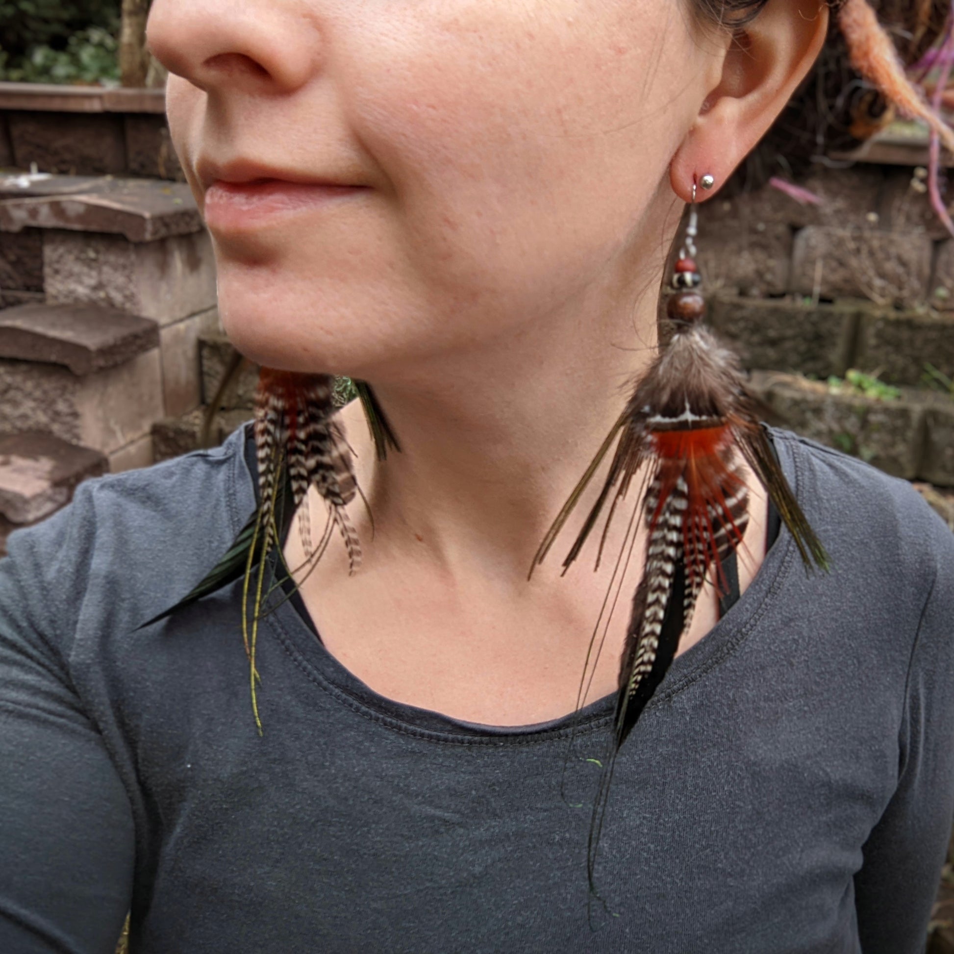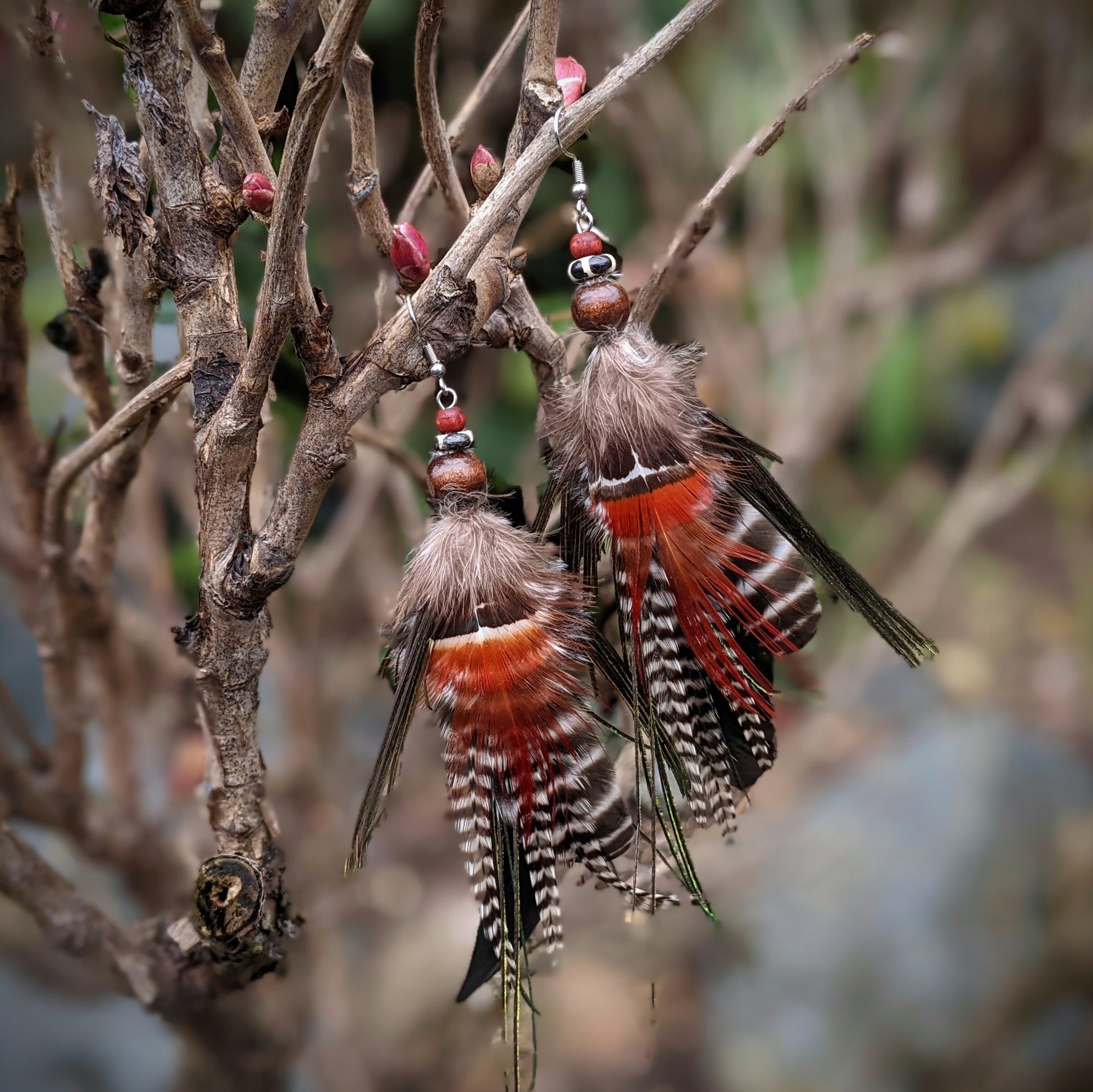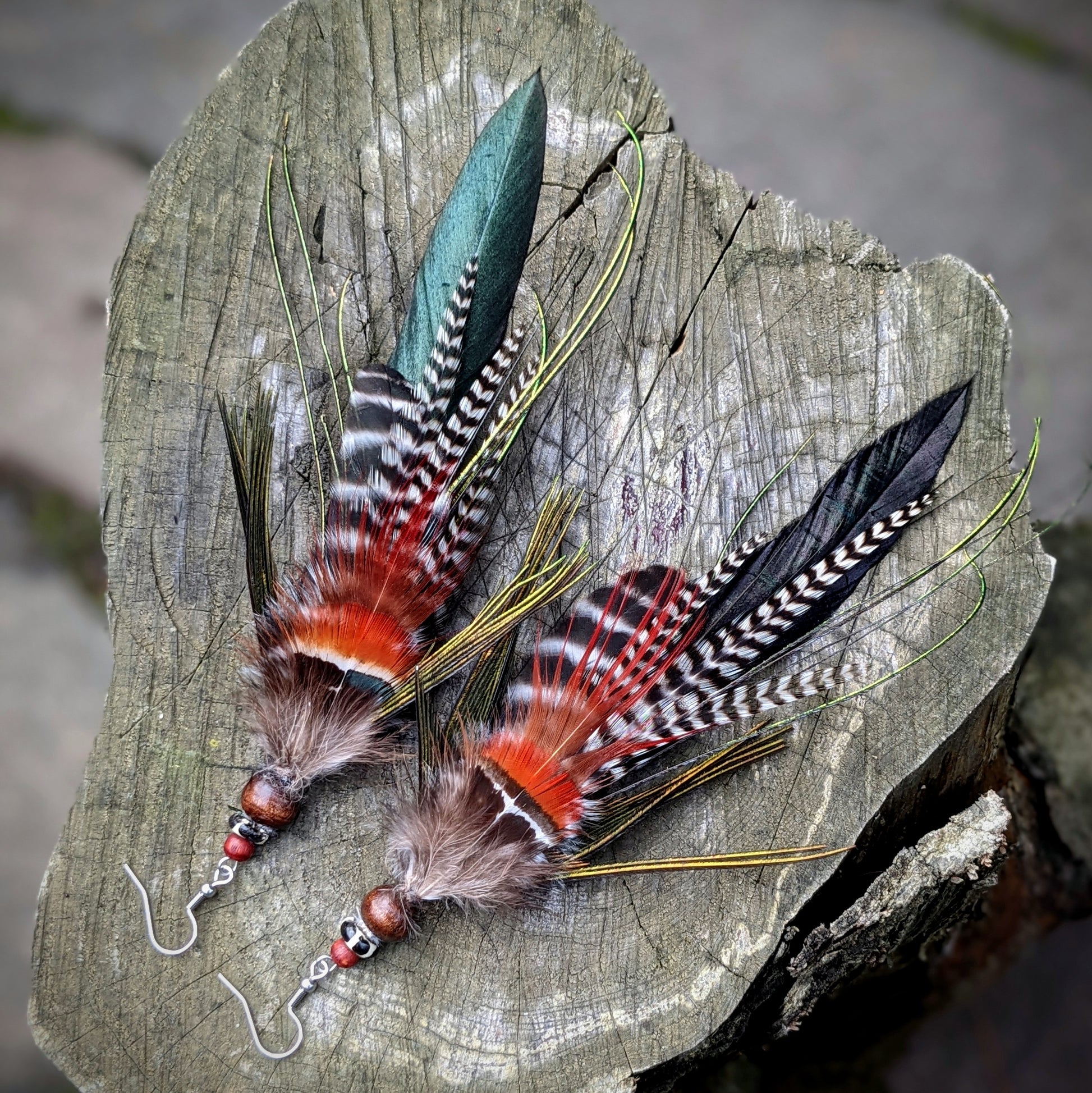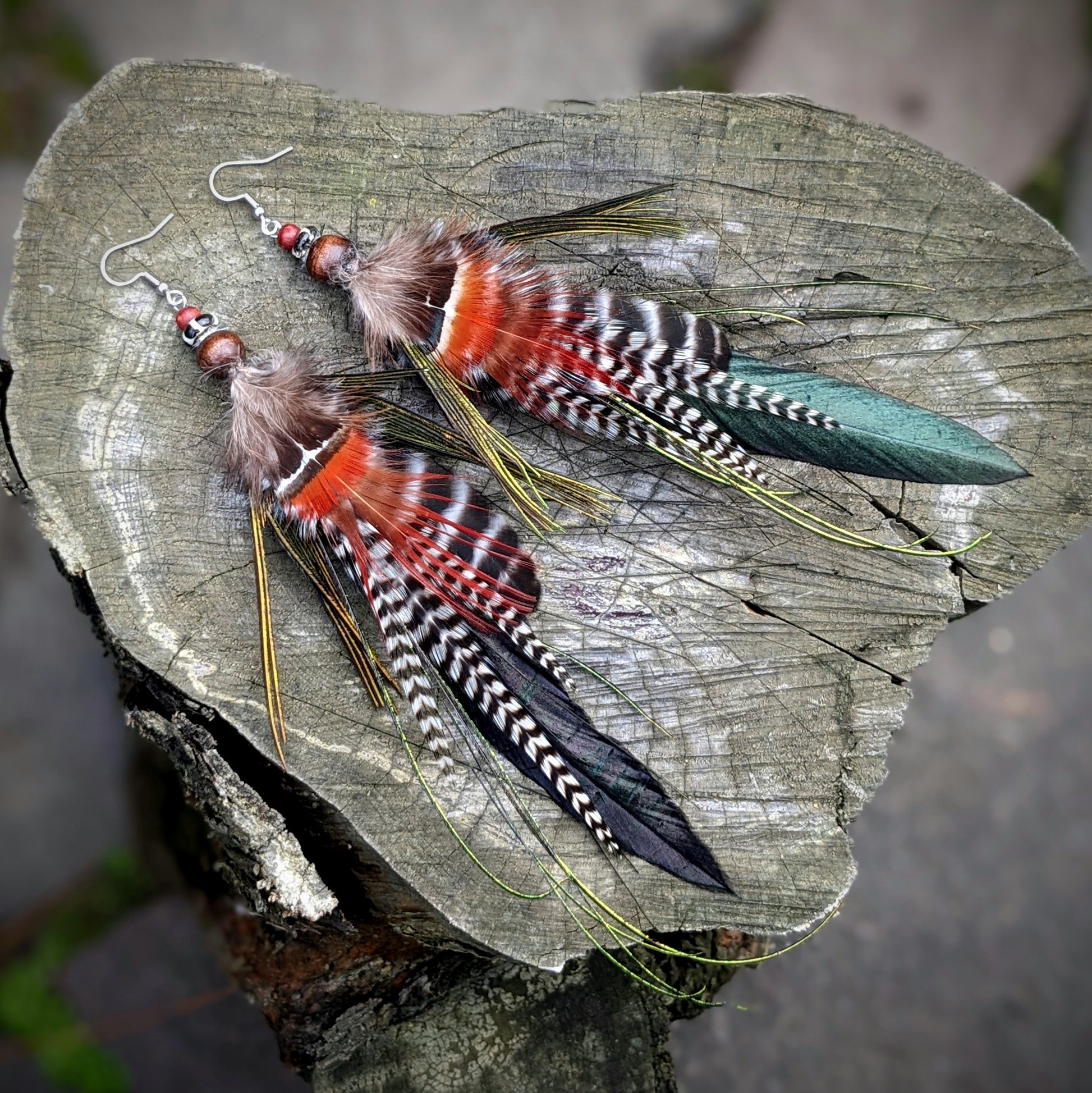 Distinctive long feather earrings (peacock, rooster, pheasant...) complemented by wooden and bone beads . Hooks are made of surgical steel, supplied with silicone stoppers. The length of the decorative part of the earrings is approximately 20 cm.