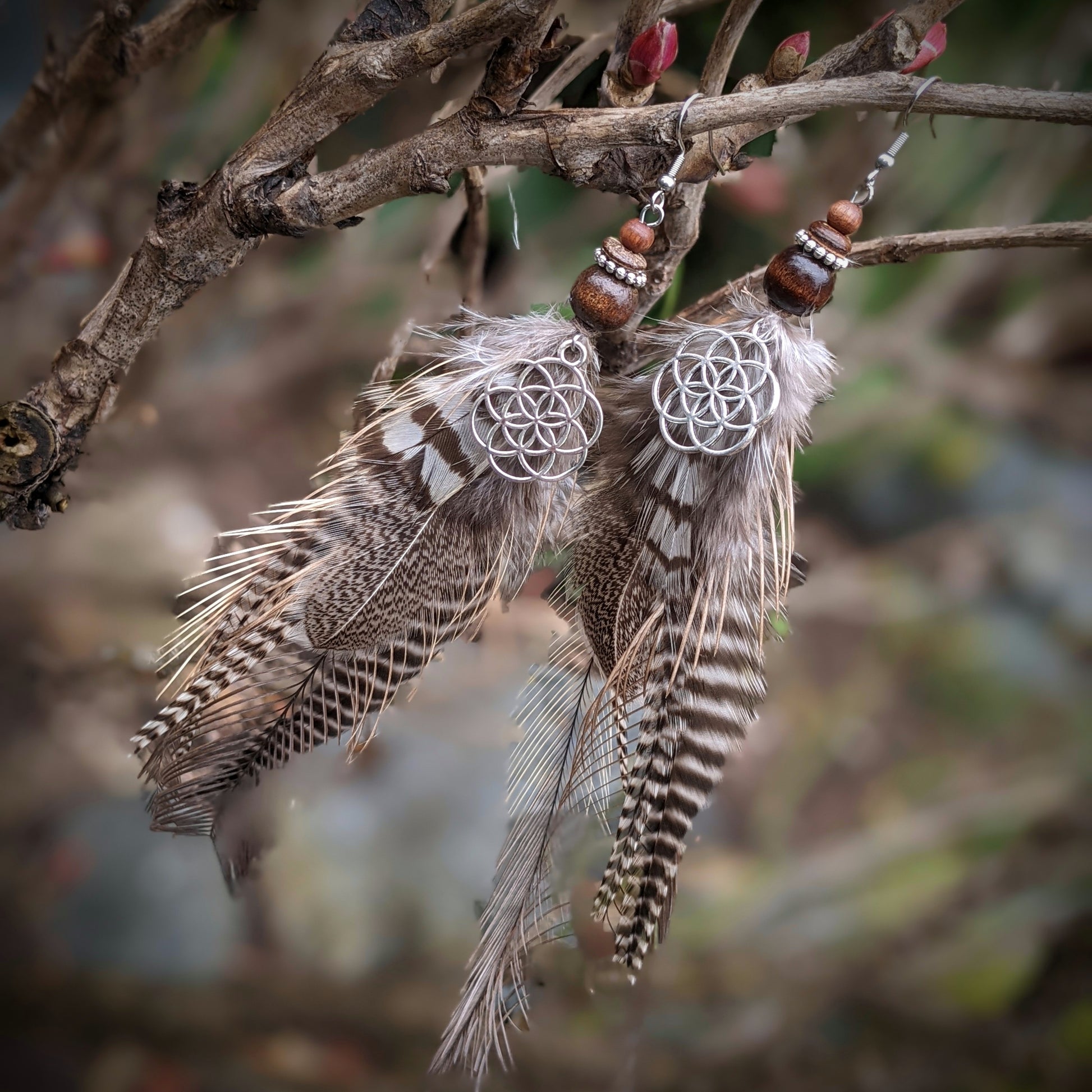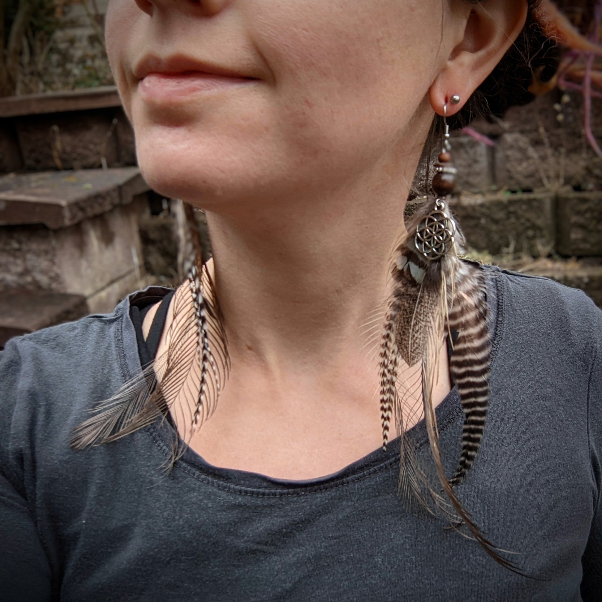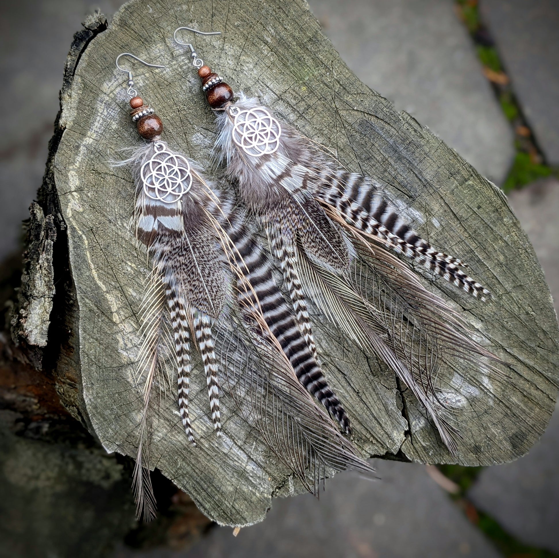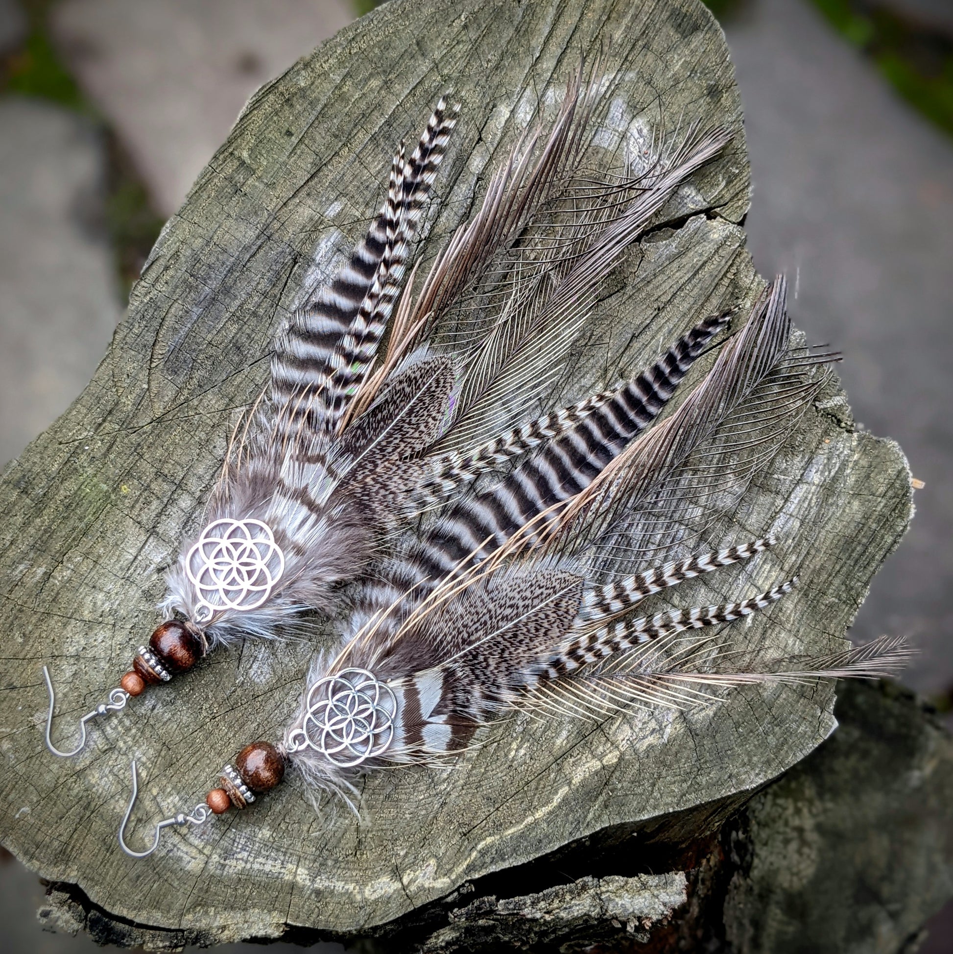 Distinctive feather earrings (poultry, hen, rooster, emu...) with a mandala complemented by wooden and metal beads. The hooks are made of surgical steel, and come with silicone stoppers. The length of the decorative part of the earrings is up to 20 cm.