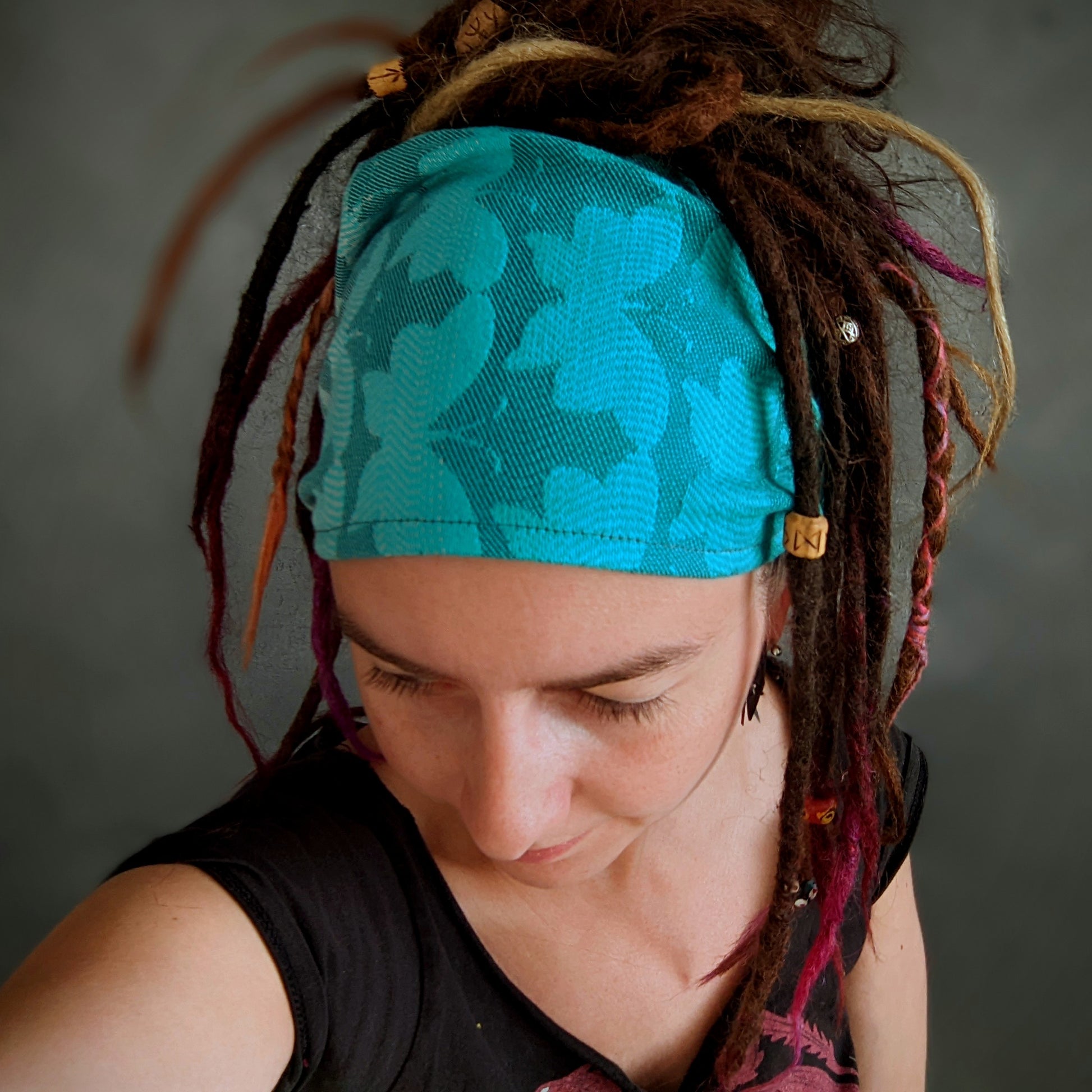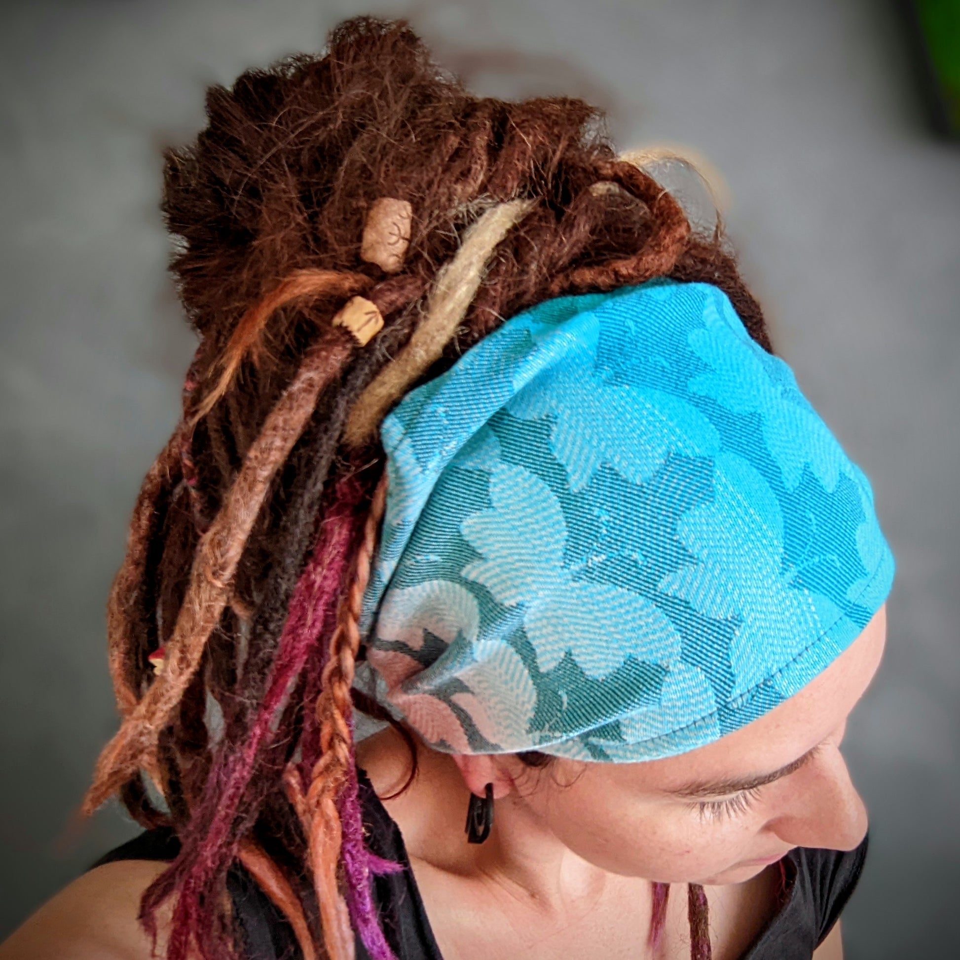 Practical scarf headband sewn from a babywearing scarf cutout.