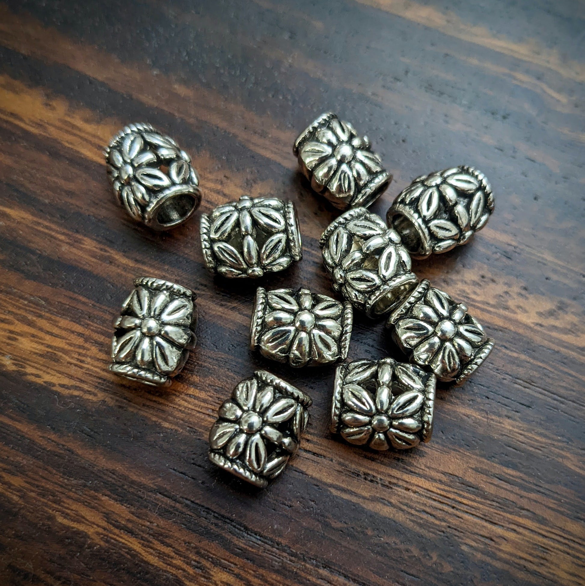 Silver-colored metal beads suitable for thinner to medium-thick dreads.