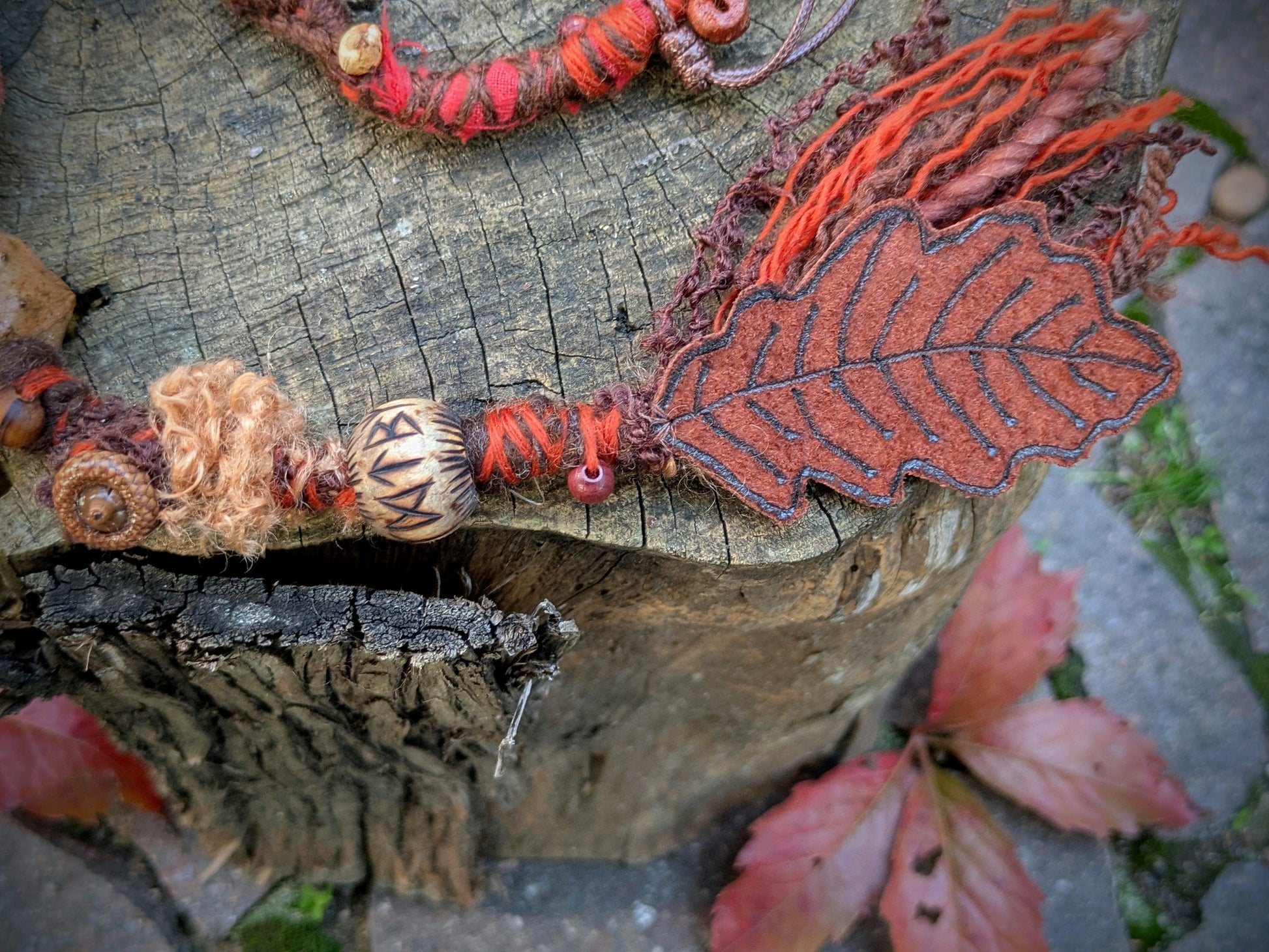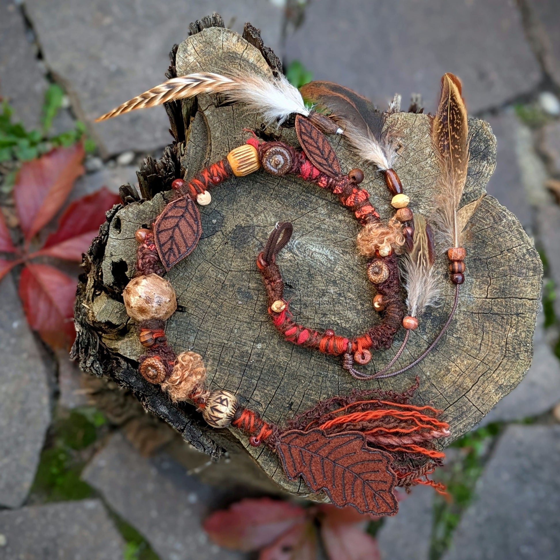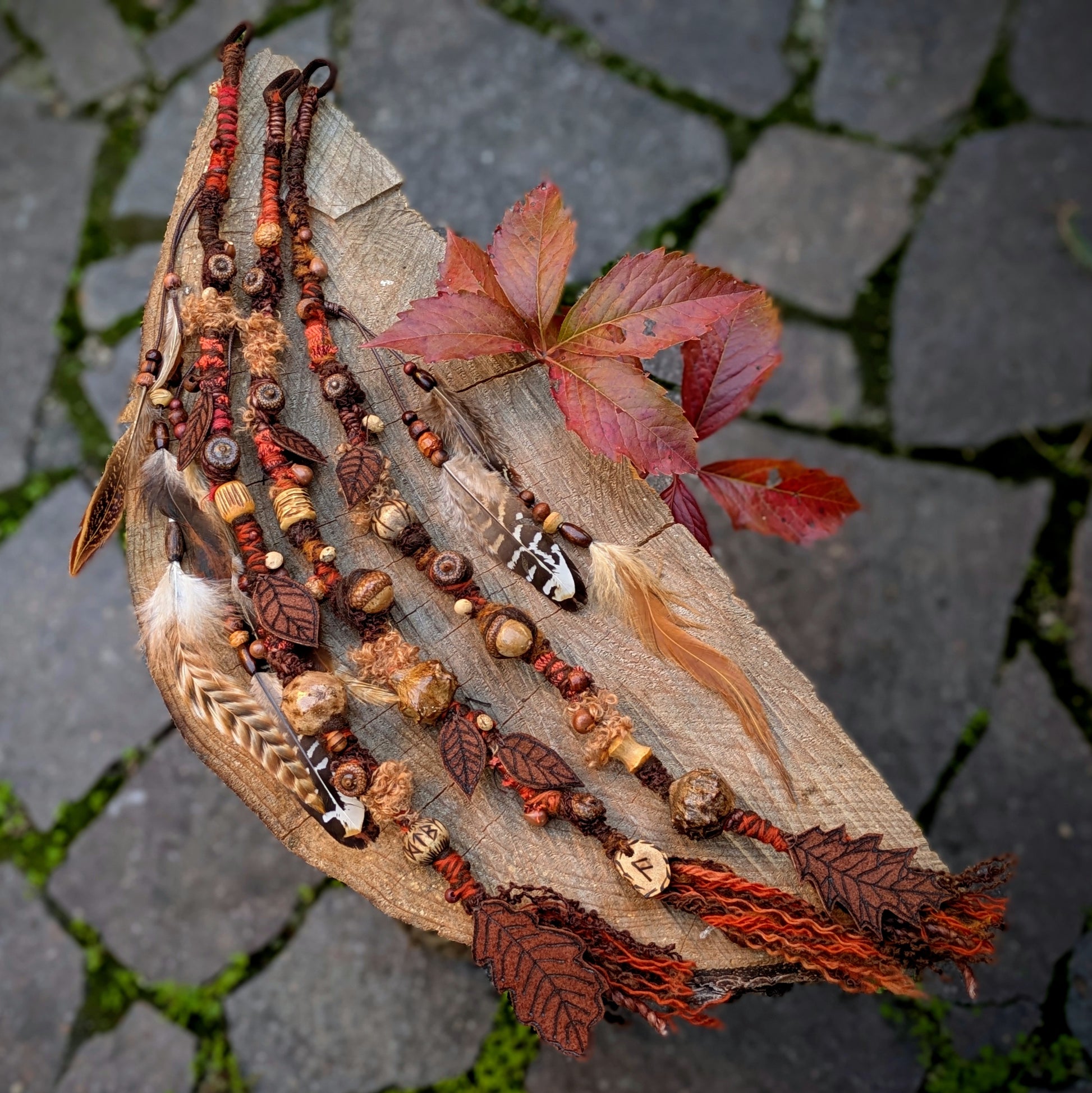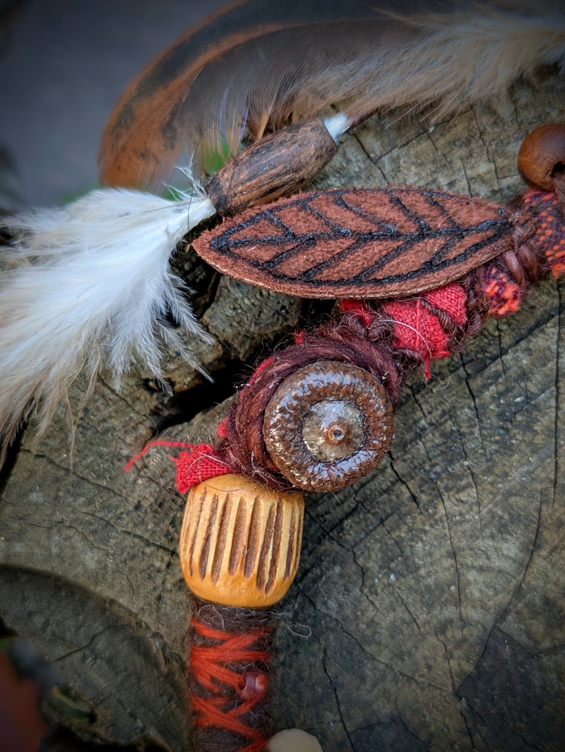 Decorative dread made of yarn and recycled materials. Decorated with ceramic beads, an eye, wooden beads, a crystal and a feather pendant that can be removed from the dread and used separately as a feather decoration for hair/dreads.