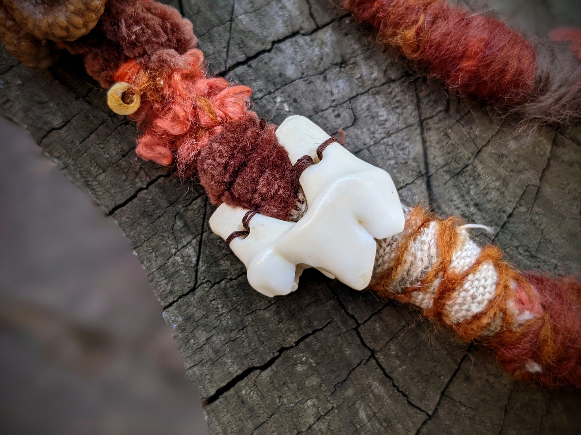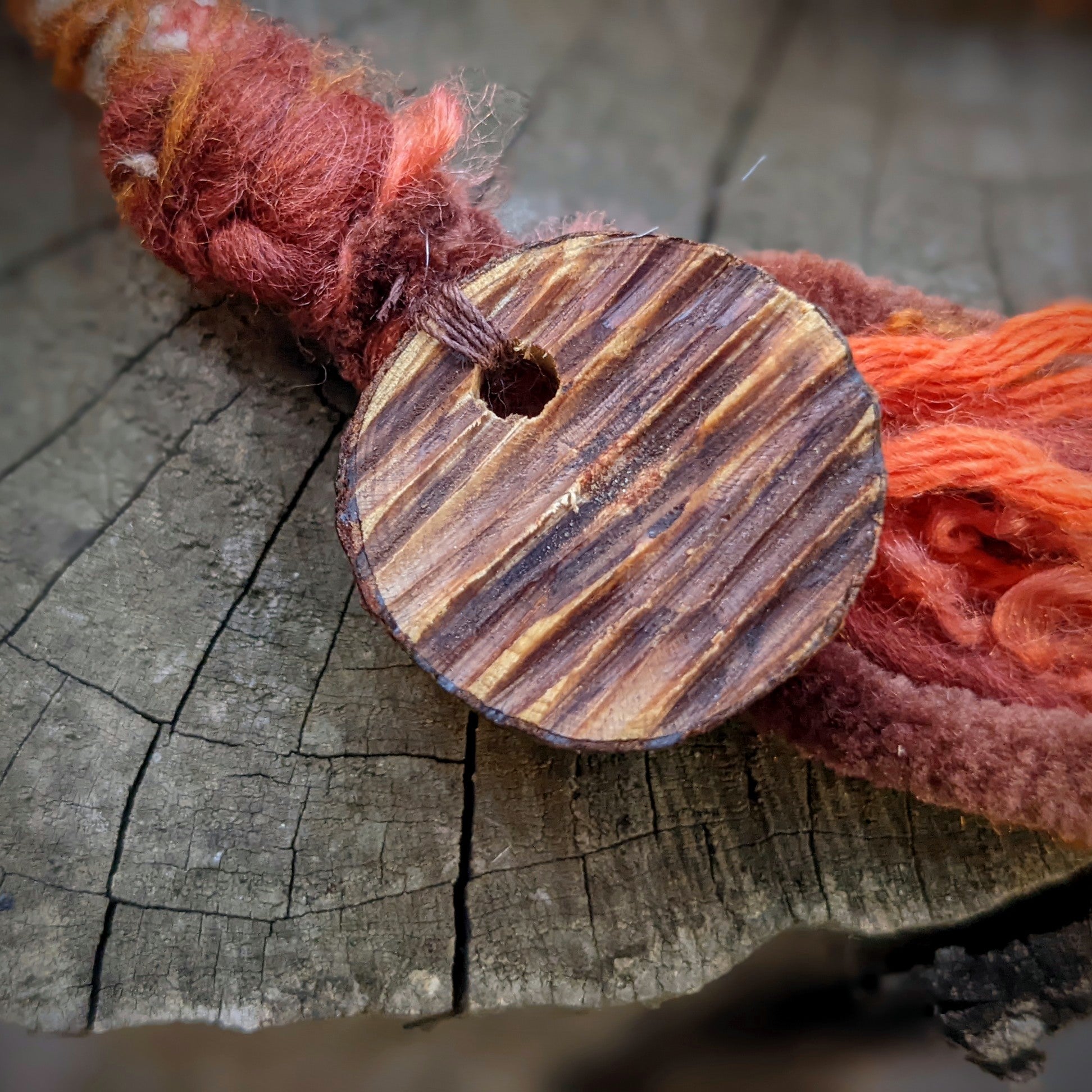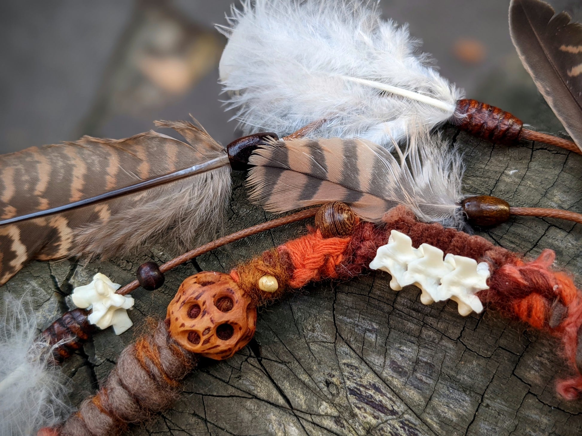 Decorative dread made of yarn and recycled materials. Decorated with ceramic beads, an eye, wooden beads, a crystal and a feather pendant that can be removed from the dread and used separately as a feather decoration for hair/dreads.