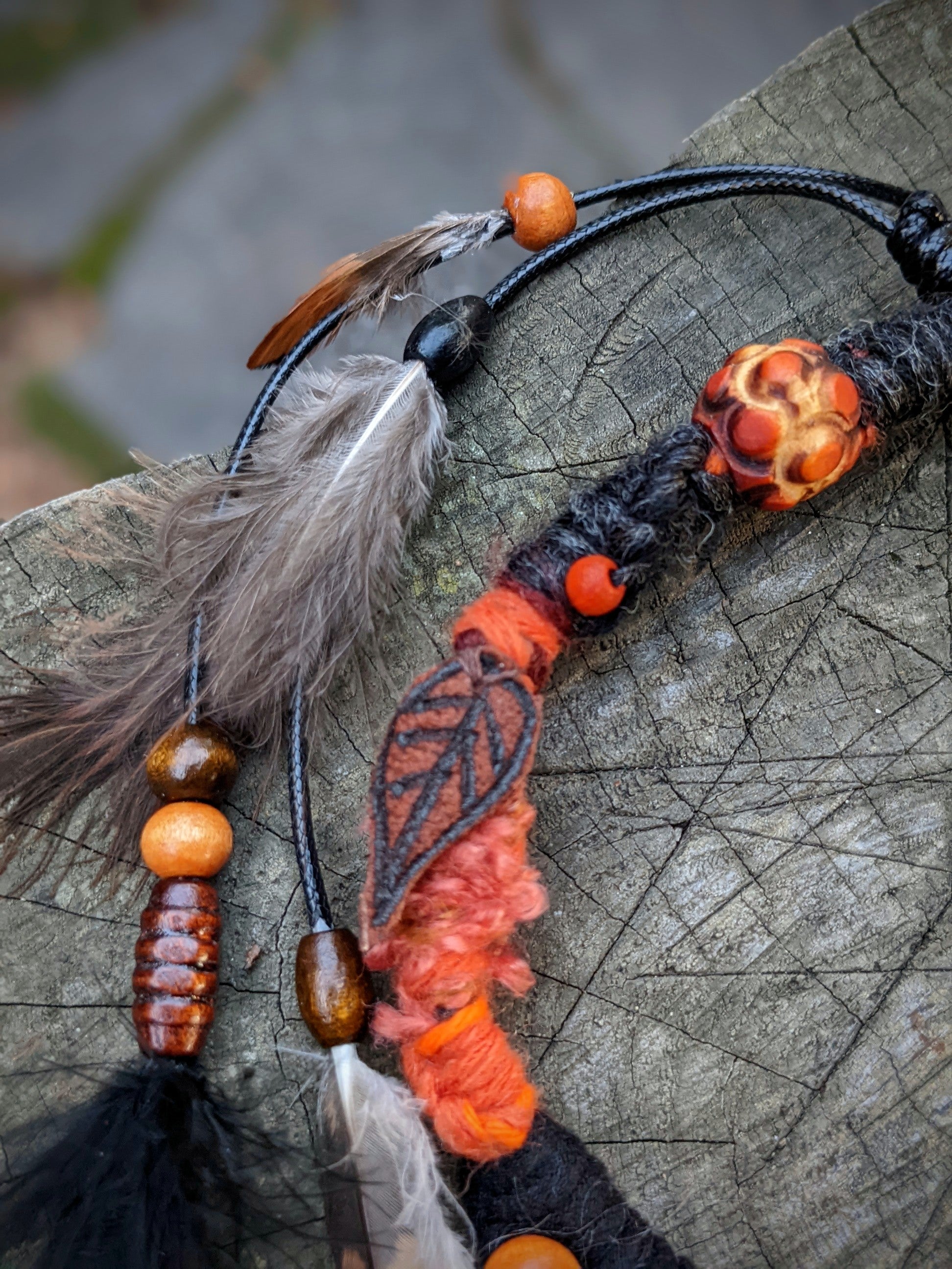 Decorative dread made of yarn and recycled materials. Decorated with ceramic beads, an eye, wooden beads, a crystal and a feather pendant that can be removed from the dread and used separately as a feather decoration for hair/dreads.