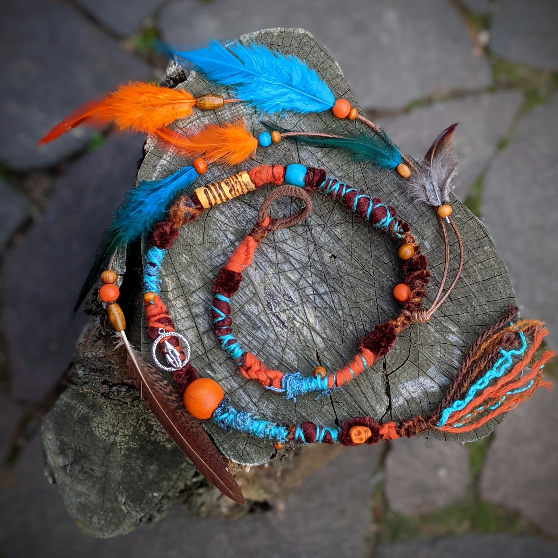 Decorative dreadlock made of yarn and recycled fabrics. Decorated with wooden beads, a skull, a mushroom pendant and a feather pendant that can be removed from the dreadlock and used separately as a feather hair ornament/dreadlocks.