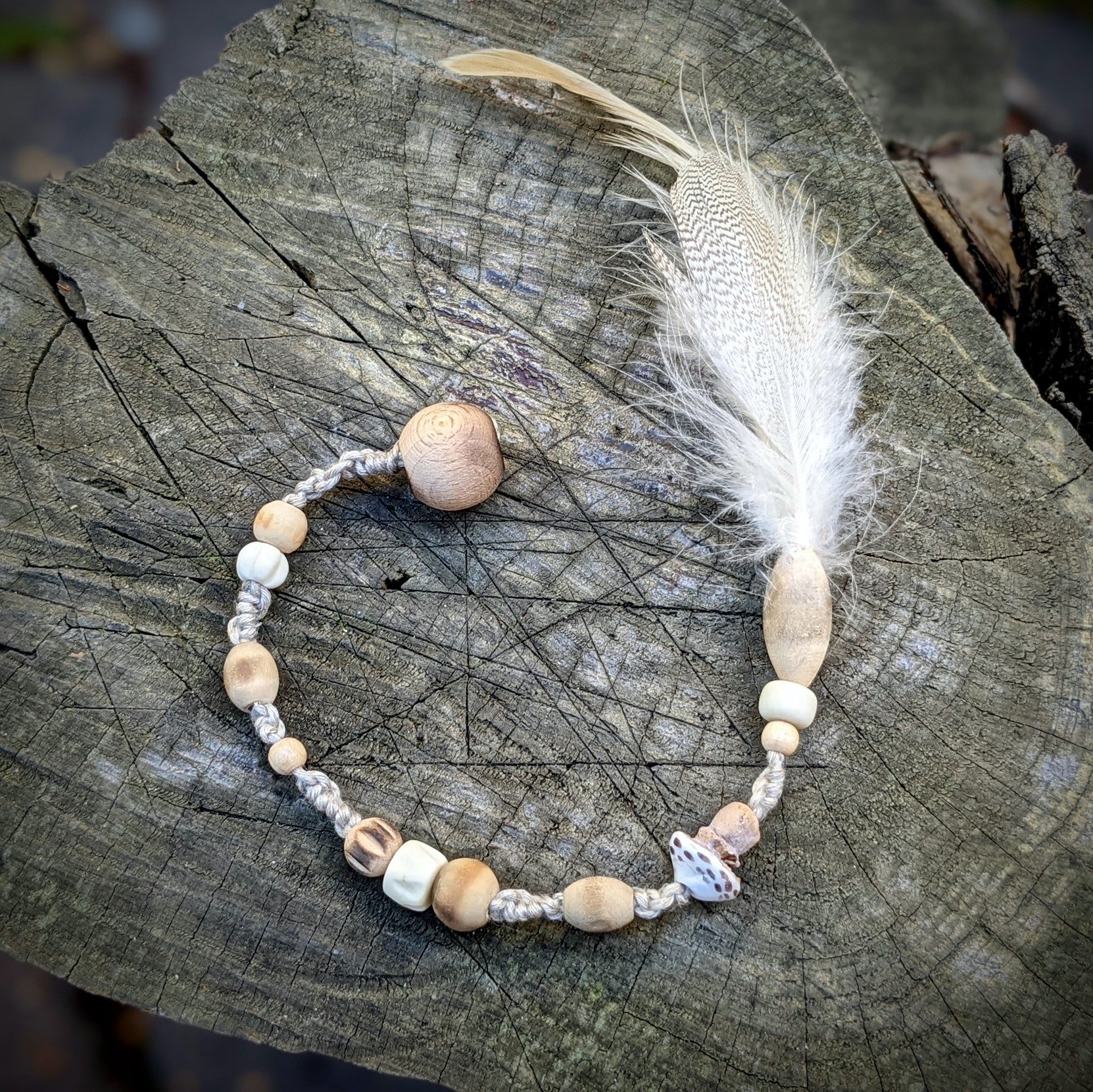 The curtain is made of linen cord, bone and wooden beads. Decorated with a ceramic toadstool (handmade Rhubarb) and feathers. The length of the curtain including the feather is approximately 30 cm.