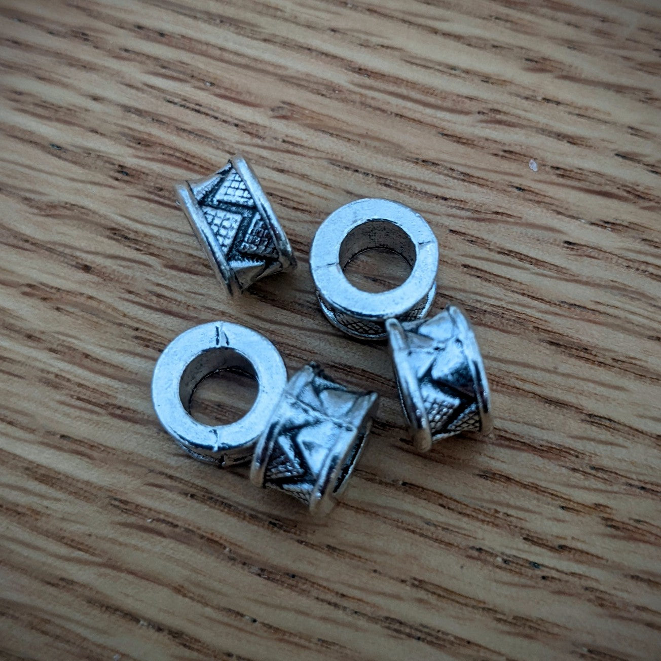 Silver-colored metal beads suitable for thinner to medium-thick dreads.