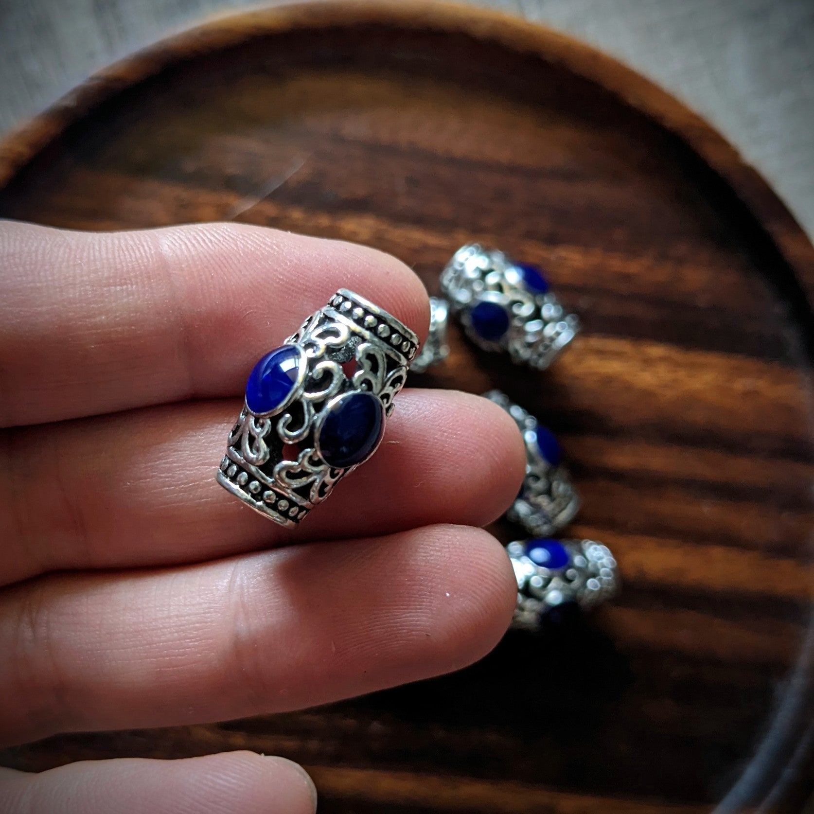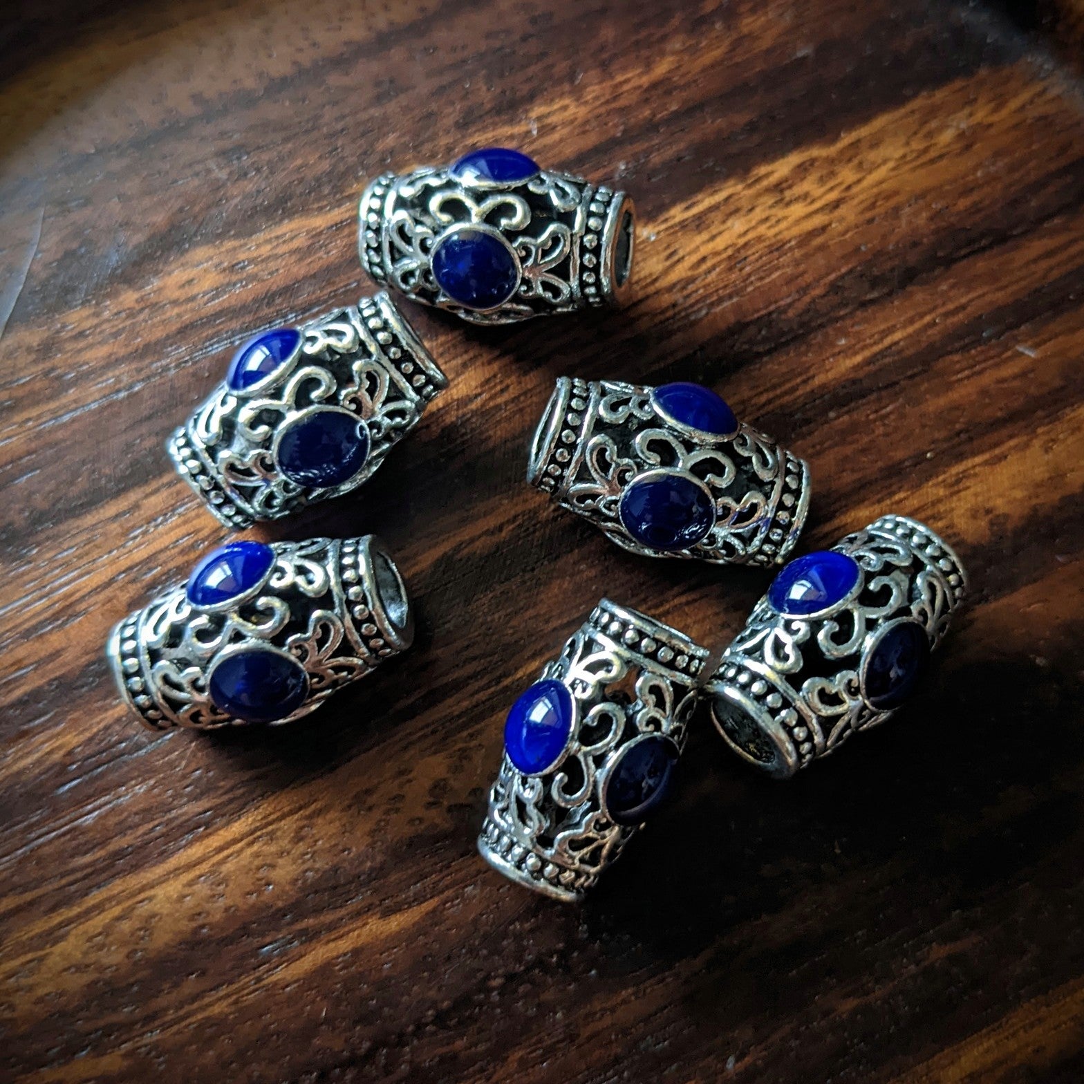 Silver-colored metal beads with blue detail suitable for medium-thick dreadlocks.